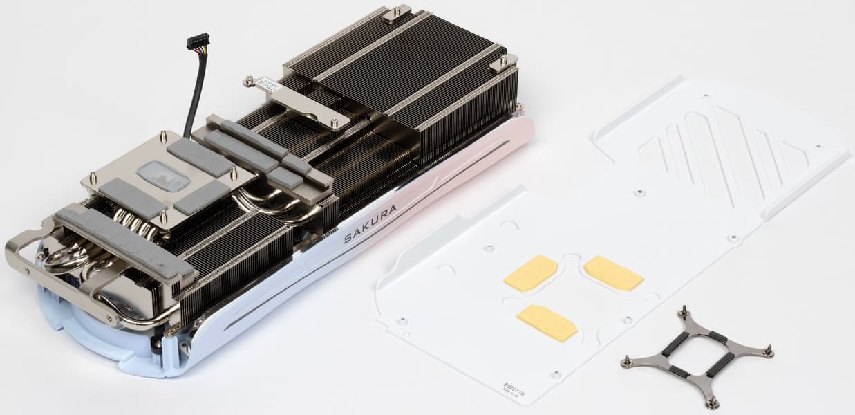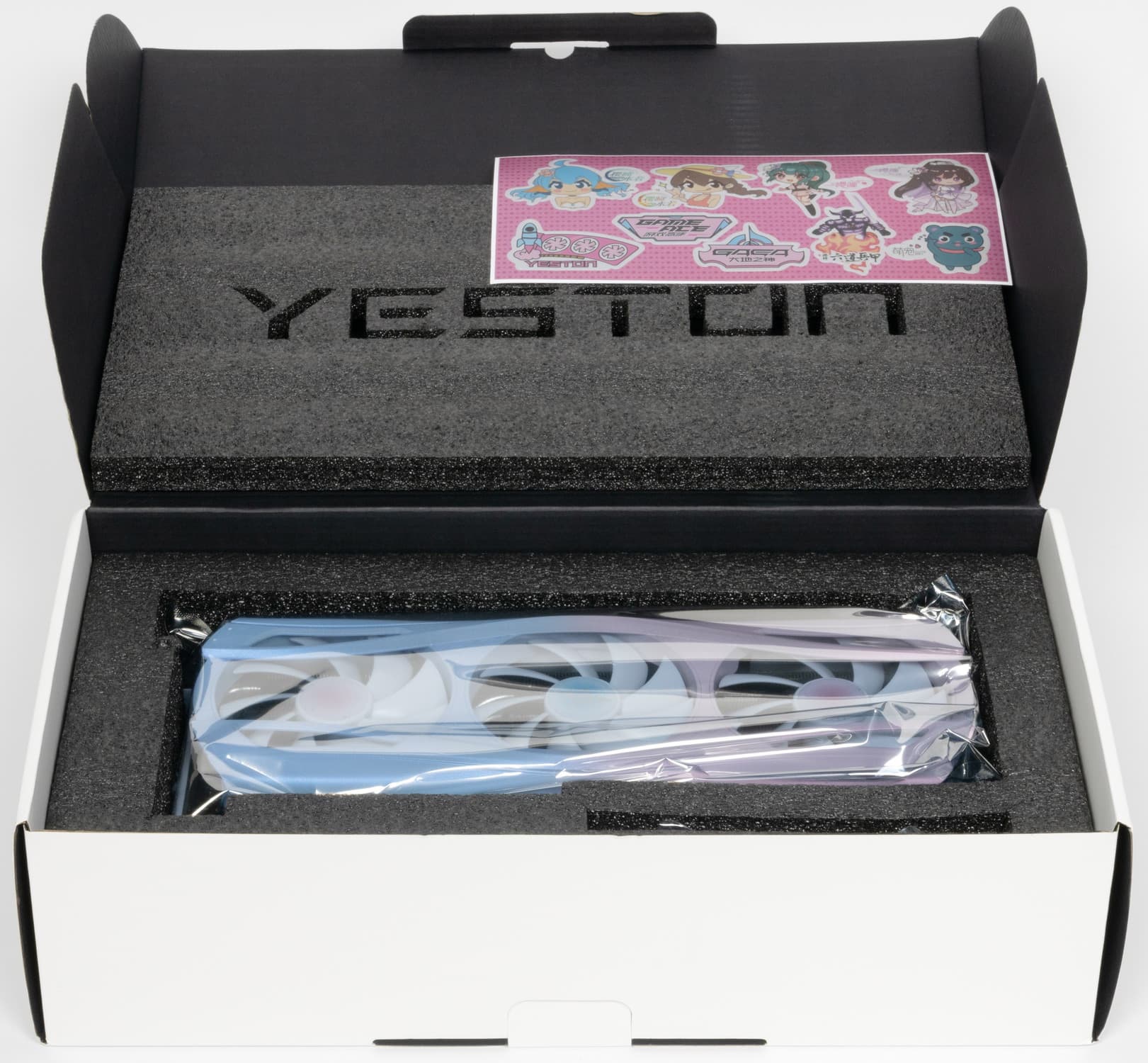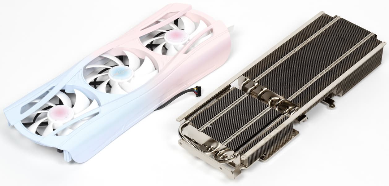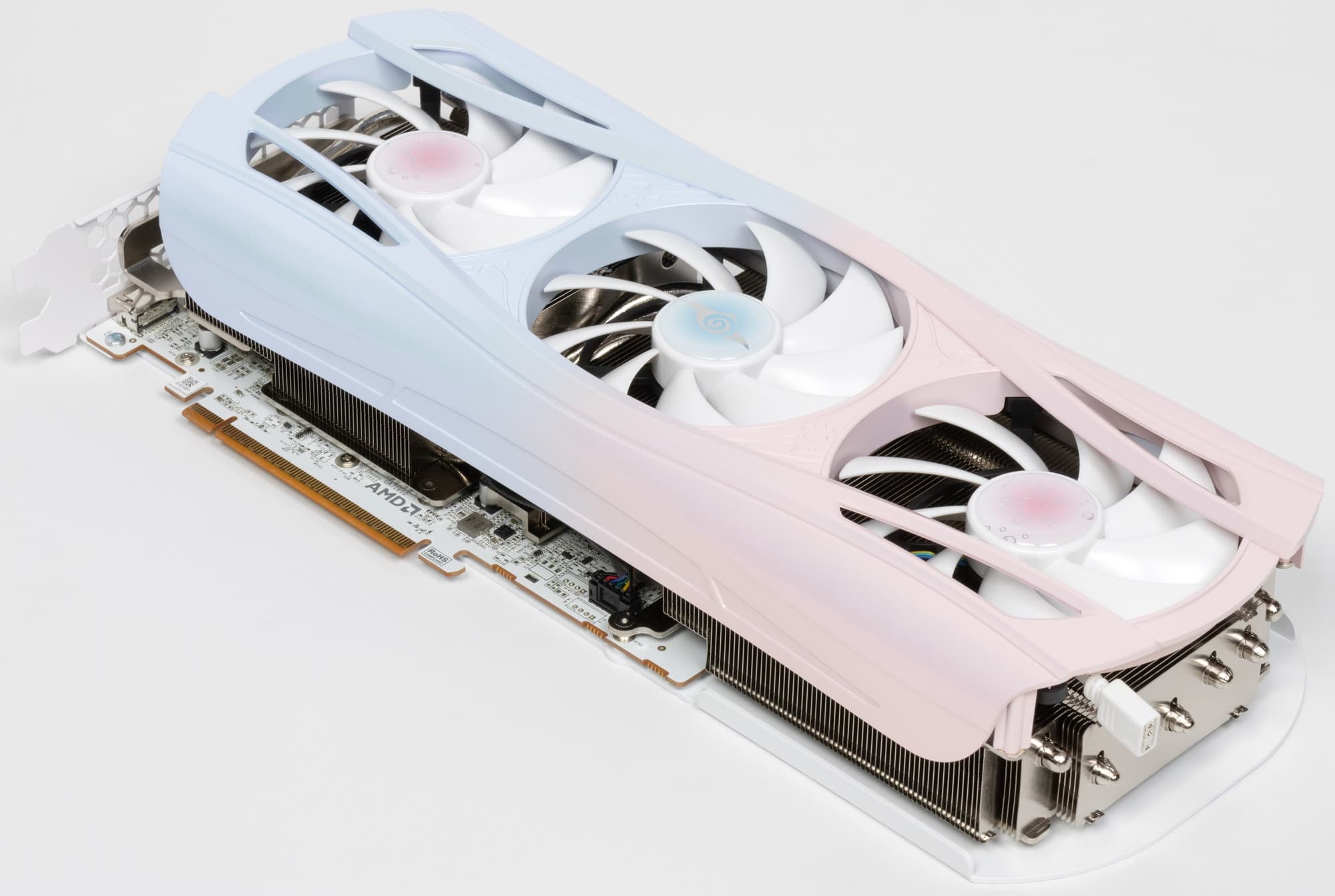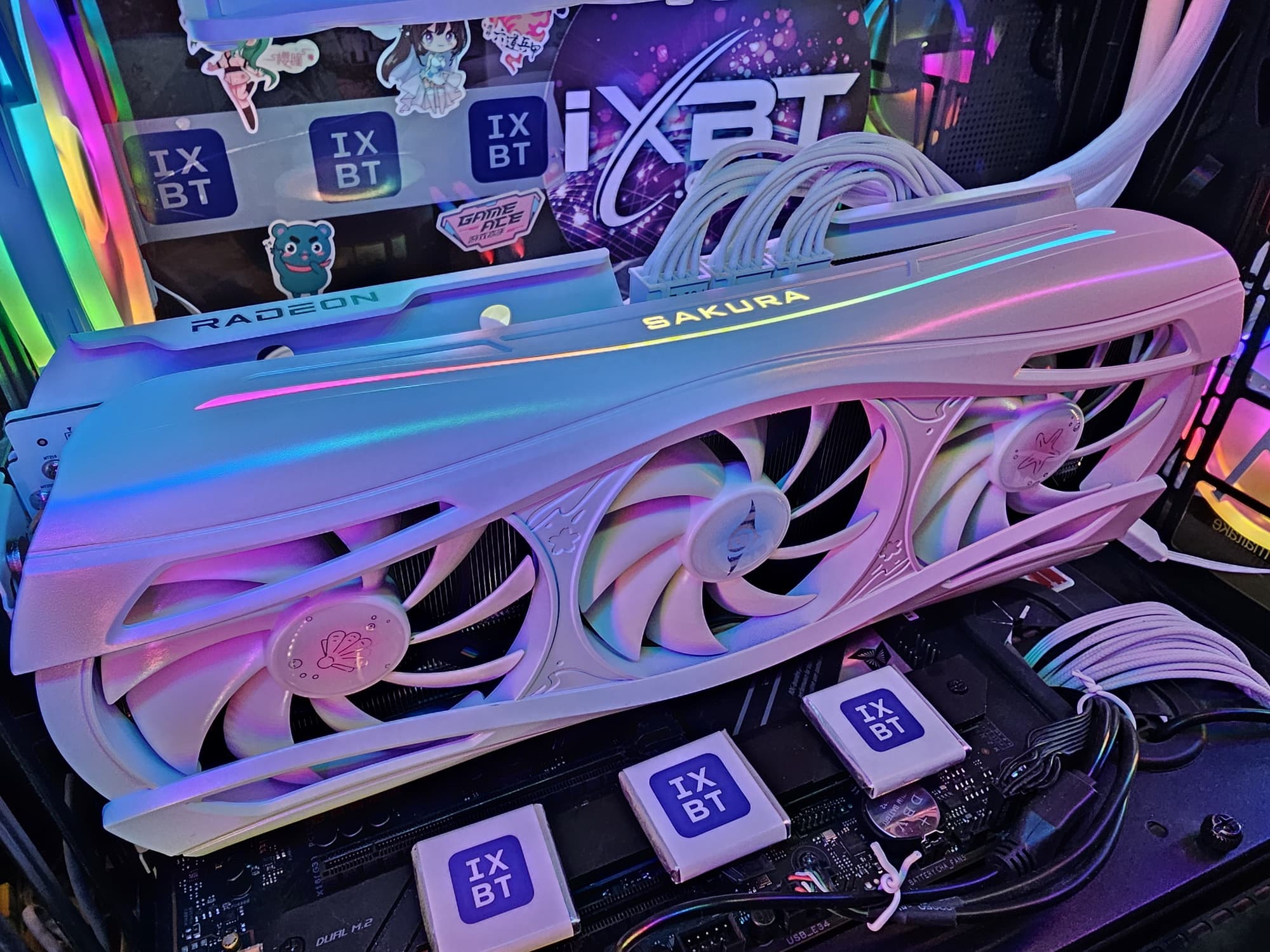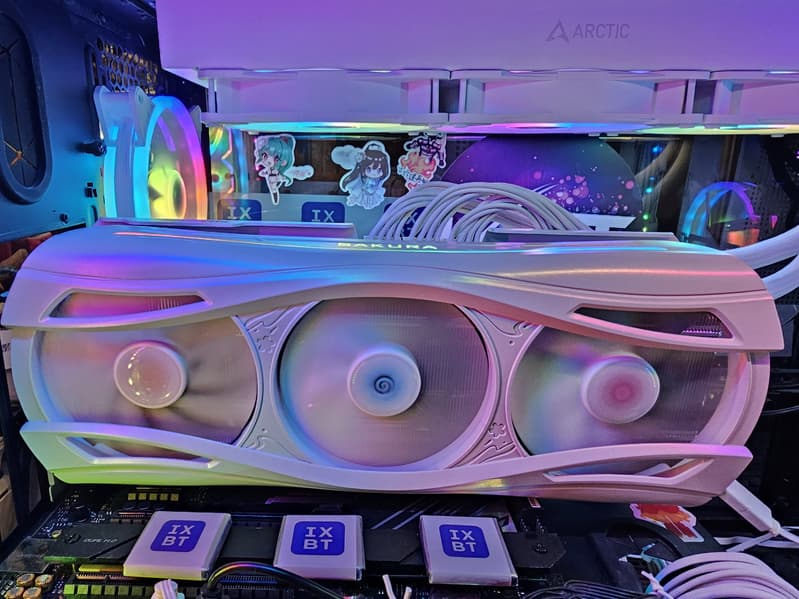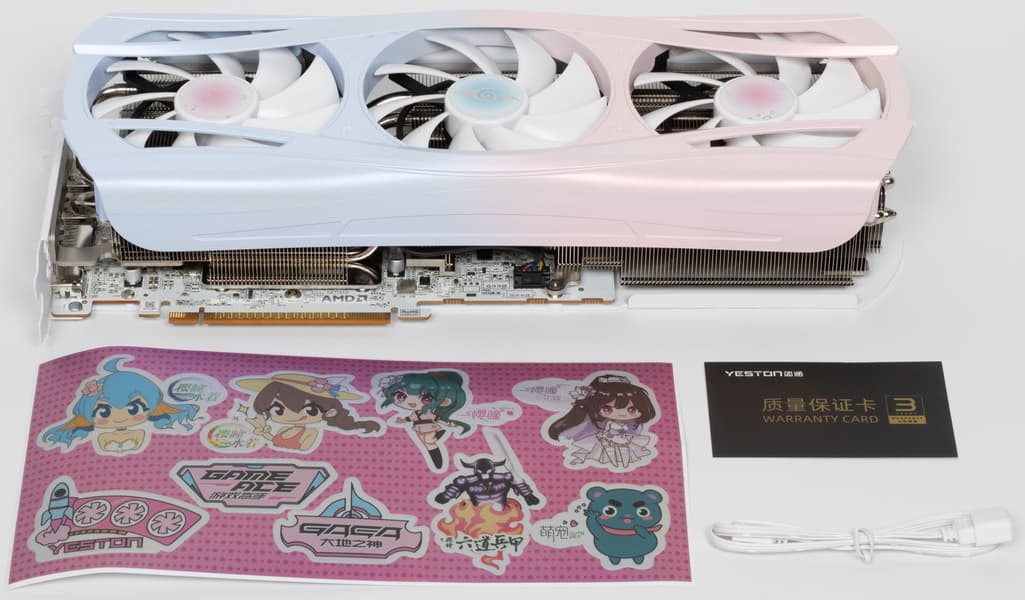 Ну и наконец нельзя не сказать еще раз про оригинальный дизайн самой карты в бело-розово-голубых тонах, при этом печатная плата — белого цвета (впрочем, ее почти не видно под кулером). Карта может отлично подойти для сборки ПК в подобных цветах, особенно с акцентом на китайские аниме. Опять же, карта распространяет внутри корпуса аромат, который разносится вентиляторами. Аромат не стойкий, по ароматизатор многоразового использования.