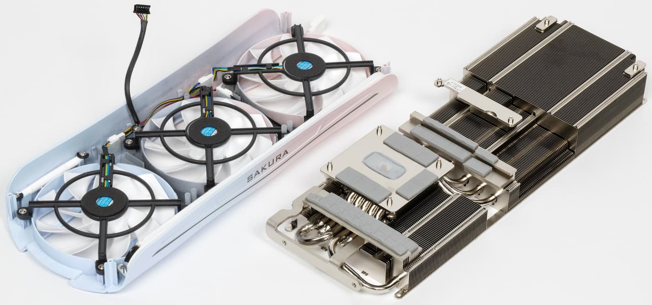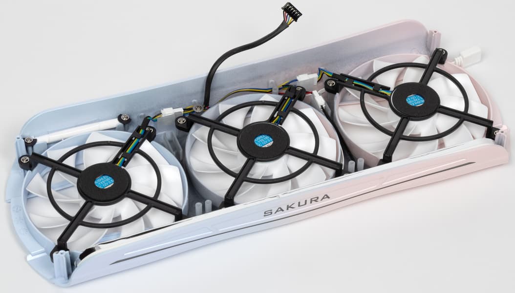 Средний вентилятор вращается в противоположную сторону, образуя с крайними вентиляторами «эффект шестеренок», помогающий бороться с турбулентностью воздушных потоков. Вентиляторы легко демонтировать для очистки, а также можно подобрать им замену, ибо у них стандартные 4-контактные разъемы питания (внутри кожуха имеется адаптер-концентратор, с помощью которого вся СО подключается к видеокарте).