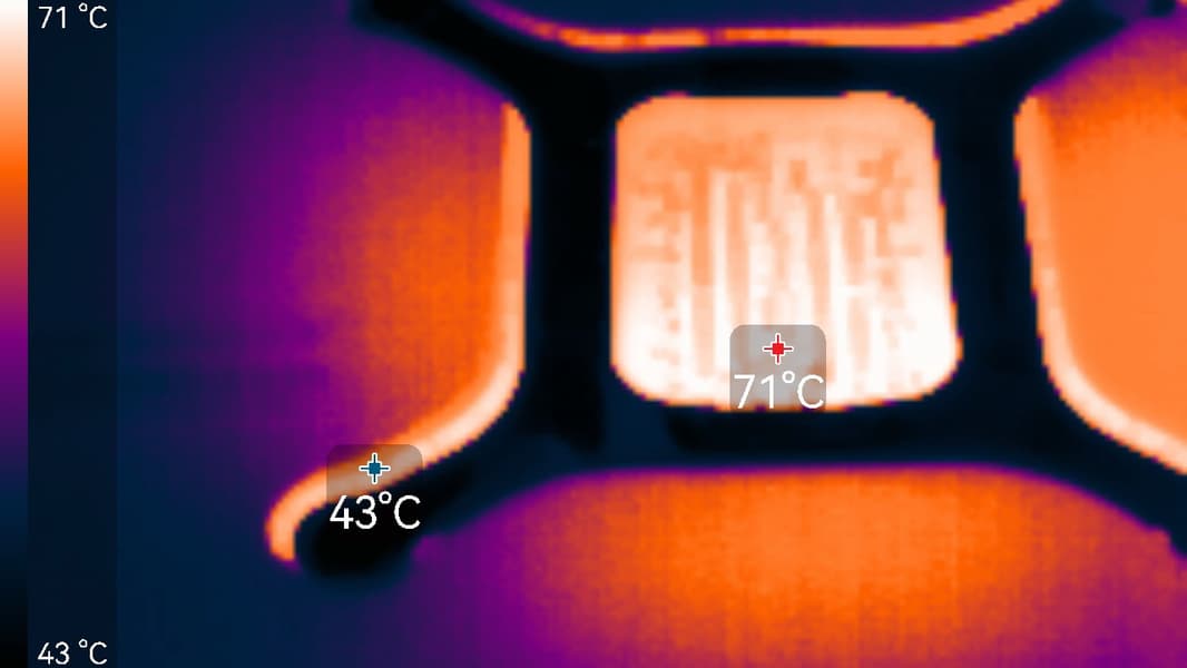 В режиме простоя в 2D температура была не выше 37 °C, вентиляторы не работали, уровень шума был фоновым 18 дБА.