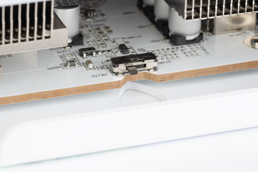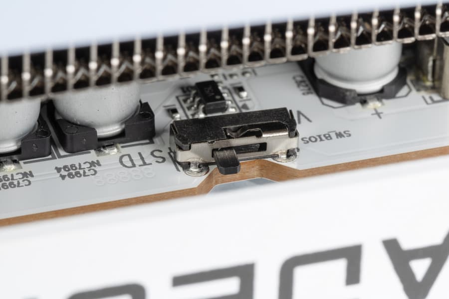 Кроме переключателя BIOS у карты имеется еще один переключатель, отвечающий за режим подсветки: по умолчанию установлен режим ARGB (которую можно при желании синхронизировать с матплатой), но можно переключиться и на простой белый режим свечения (синхронизации с матплатой нет).