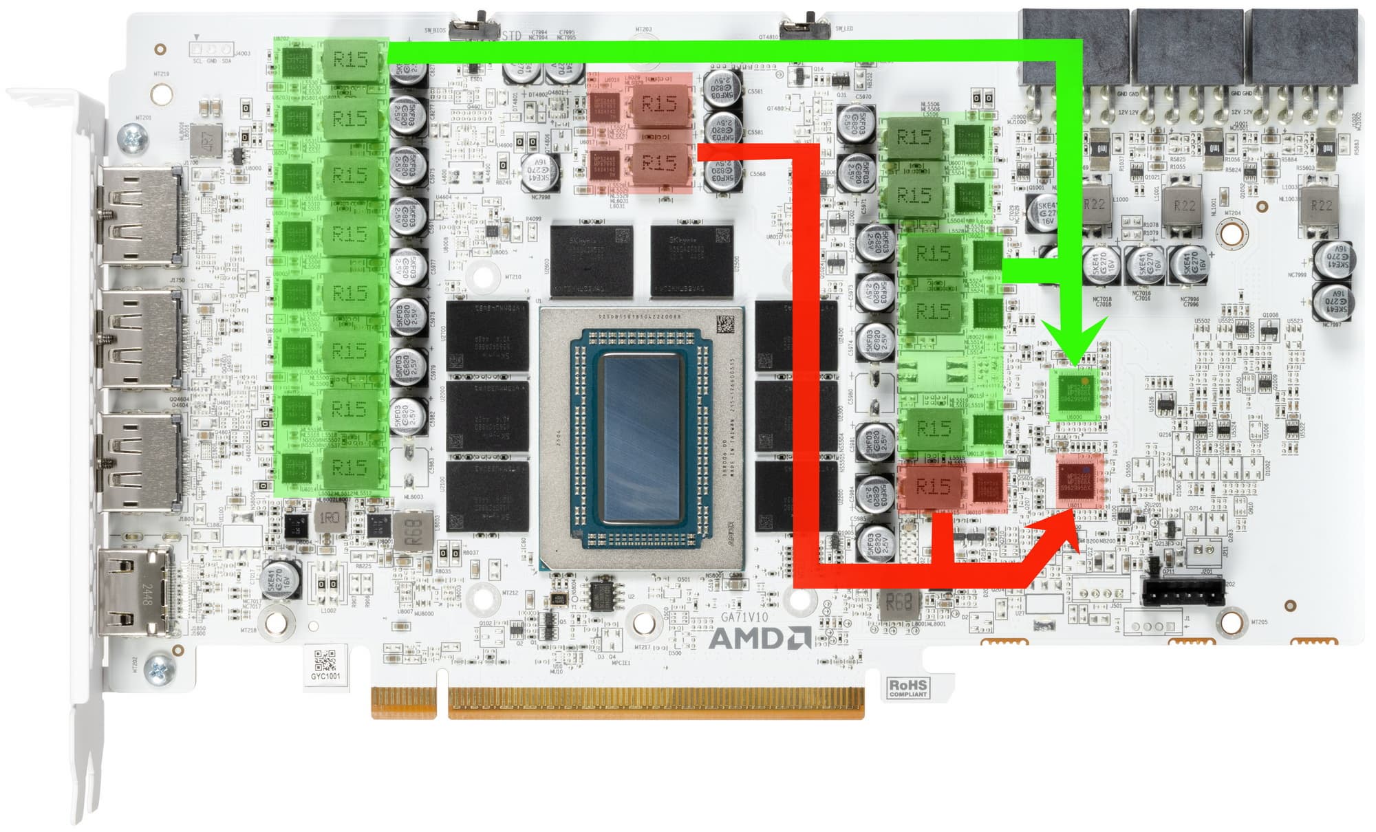 Зеленым цветом отмечена схема питания ядра (13 фаз), красным — памяти (3 фазы).
