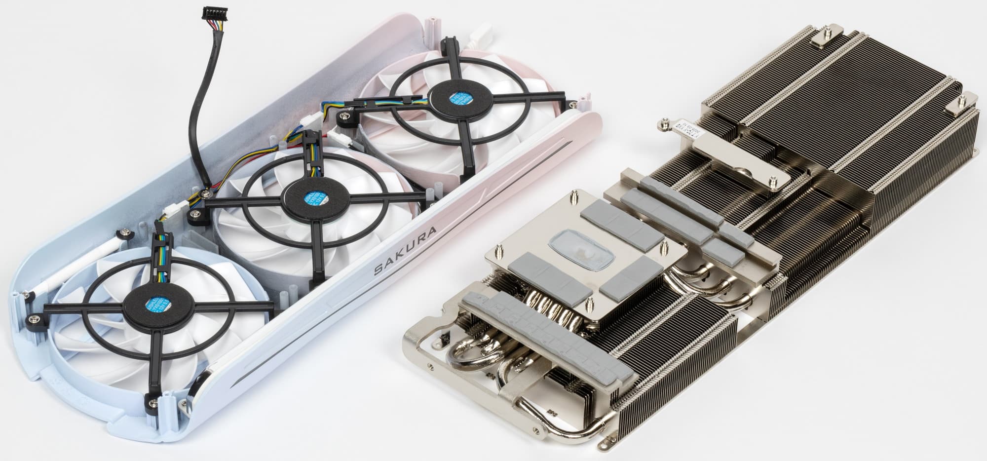 Поверх радиатора установлен кожух с тремя вентиляторами ∅92-93 мм, имеющими по 9 лопастей.