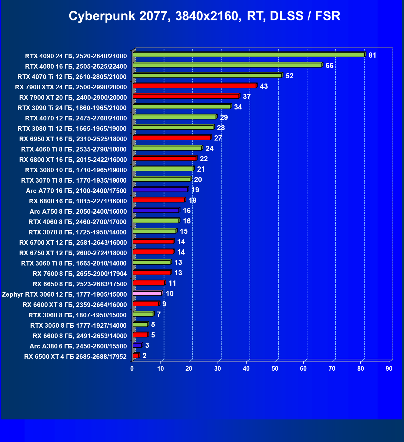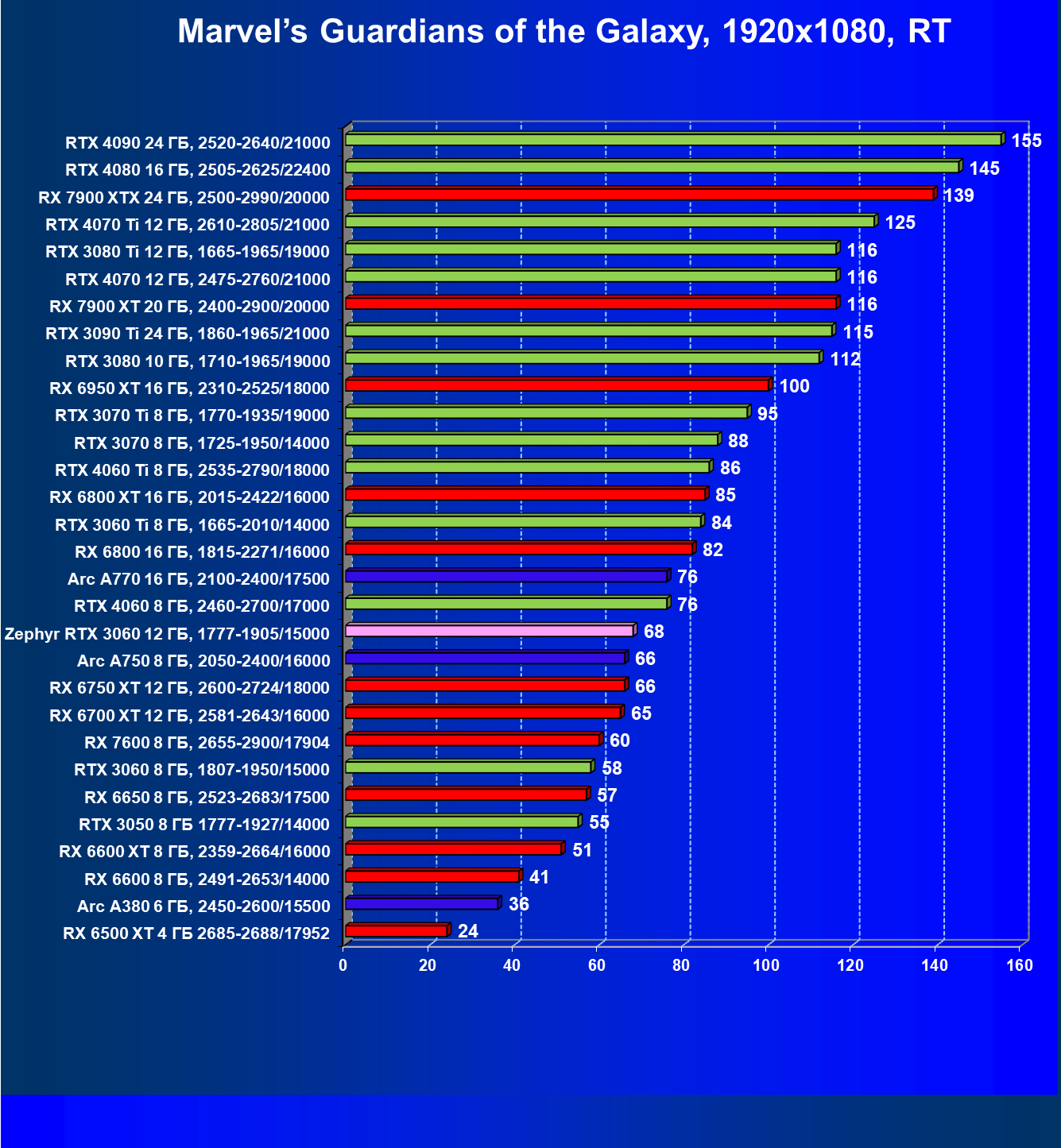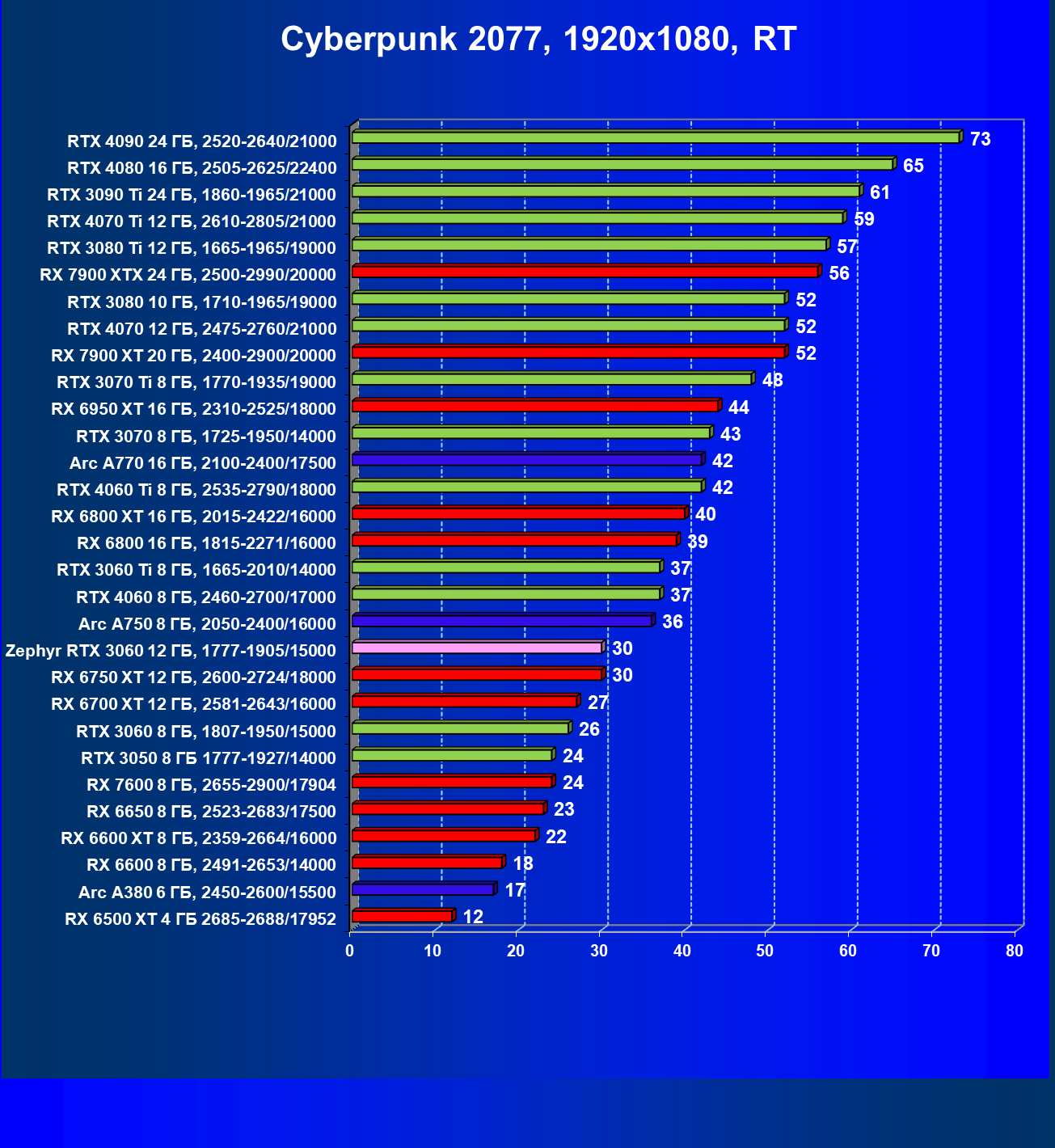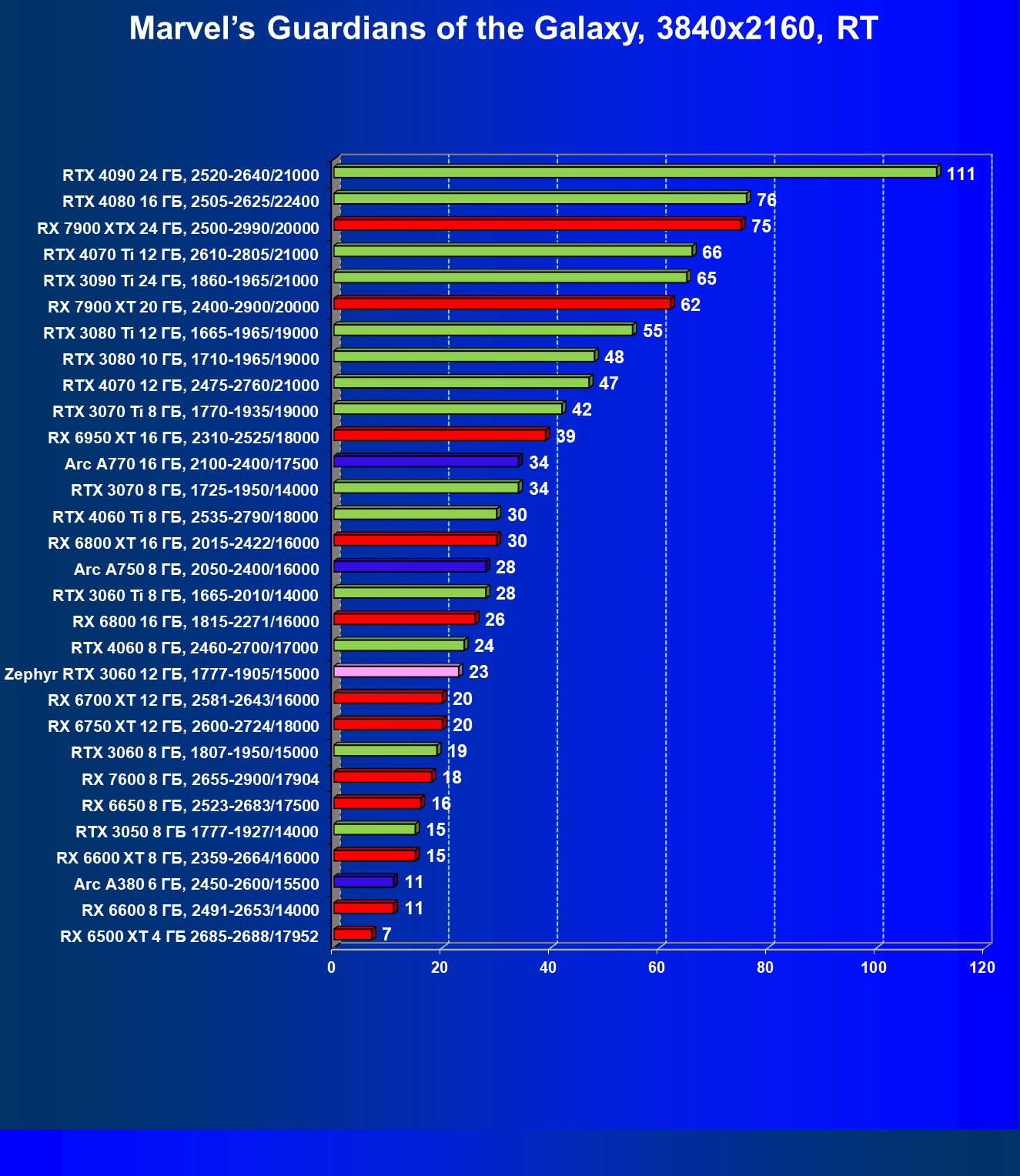В играх без RT карты в этой группе занимают места в соответствии со своими ценами. Карта Zephyr логично расположилась между Radeon RX 6600 XT и Radeon RX 6600. 8-гигабайтный вариант GeForce RTX 3060 — в аутсайдерах.