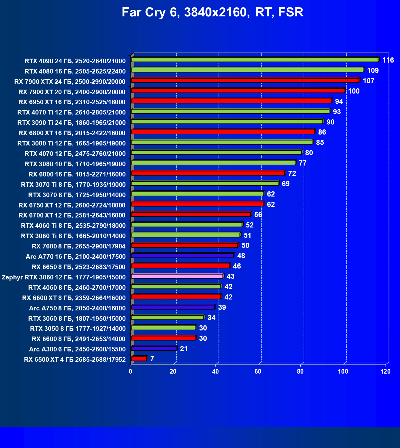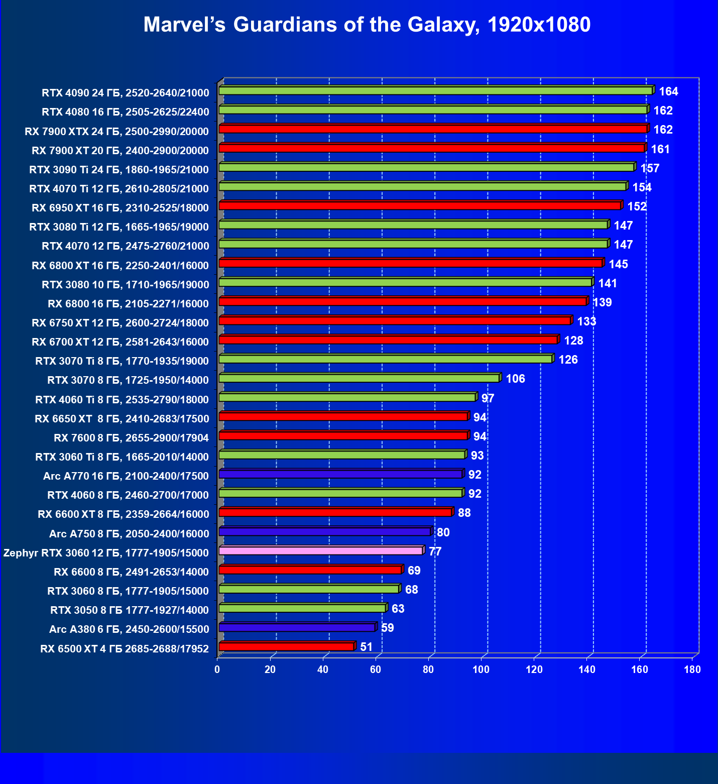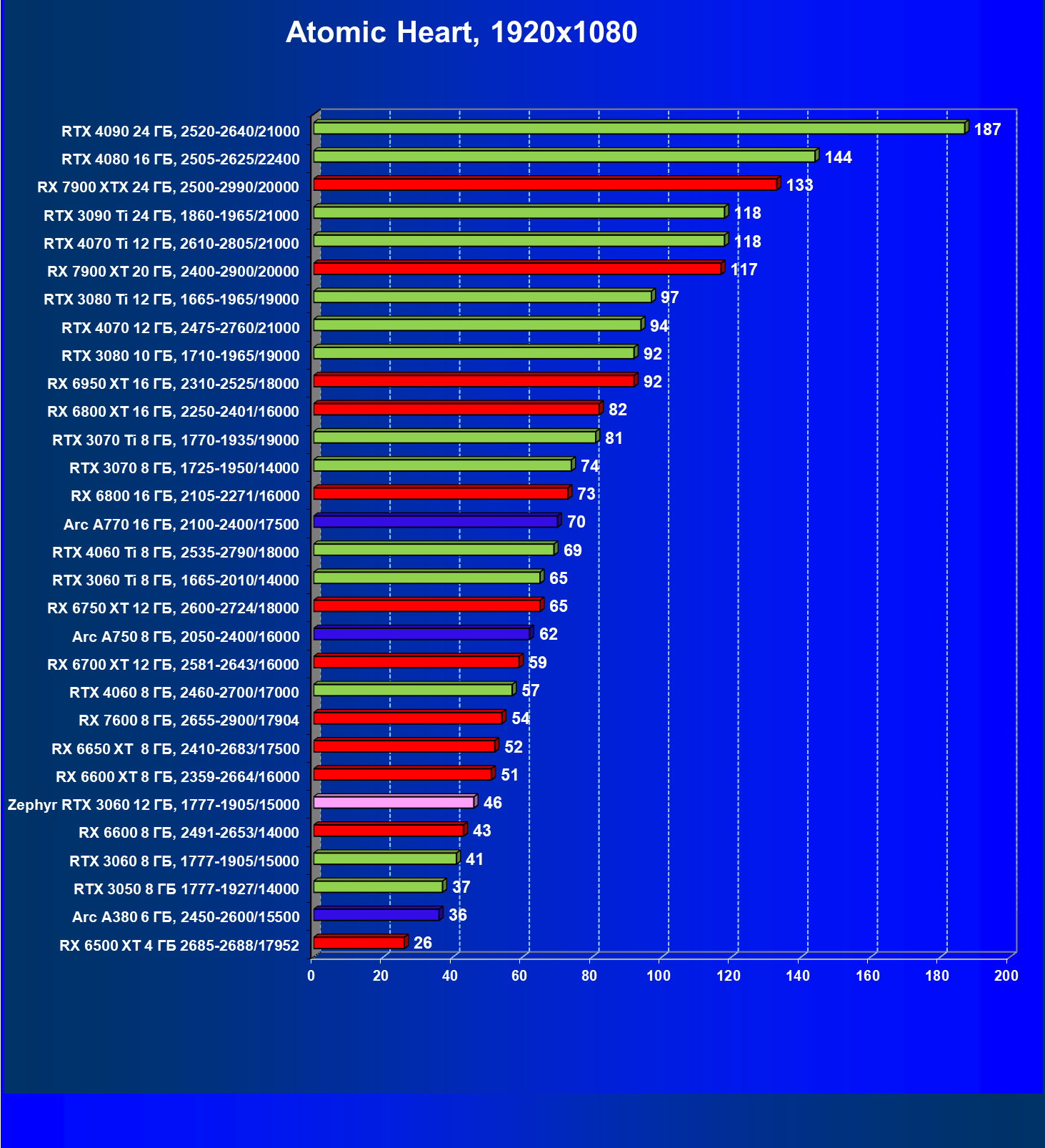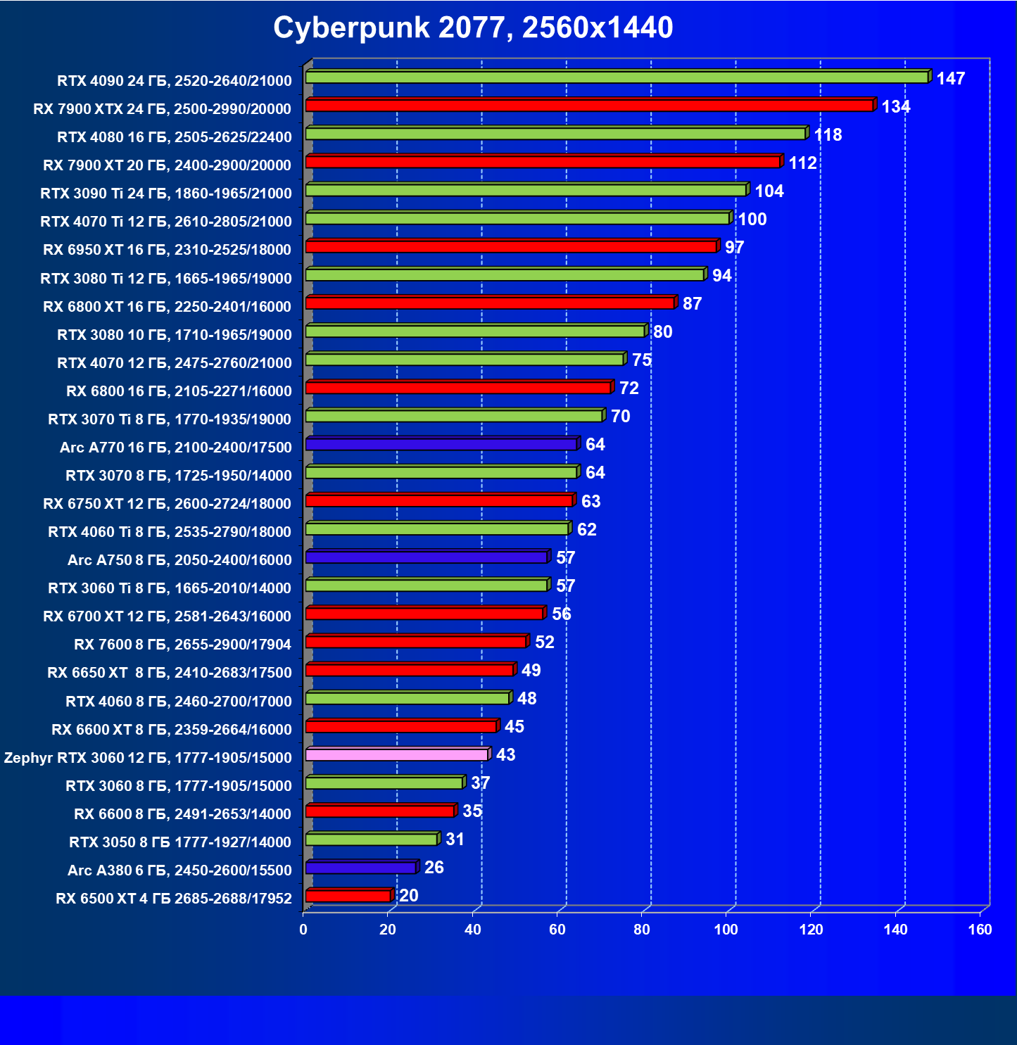 В играх без RT карты в этой группе занимают места в соответствии со своими ценами. Карта Zephyr логично расположилась между Radeon RX 6600 XT и Radeon RX 6600. 8-гигабайтный вариант GeForce RTX 3060 — в аутсайдерах.