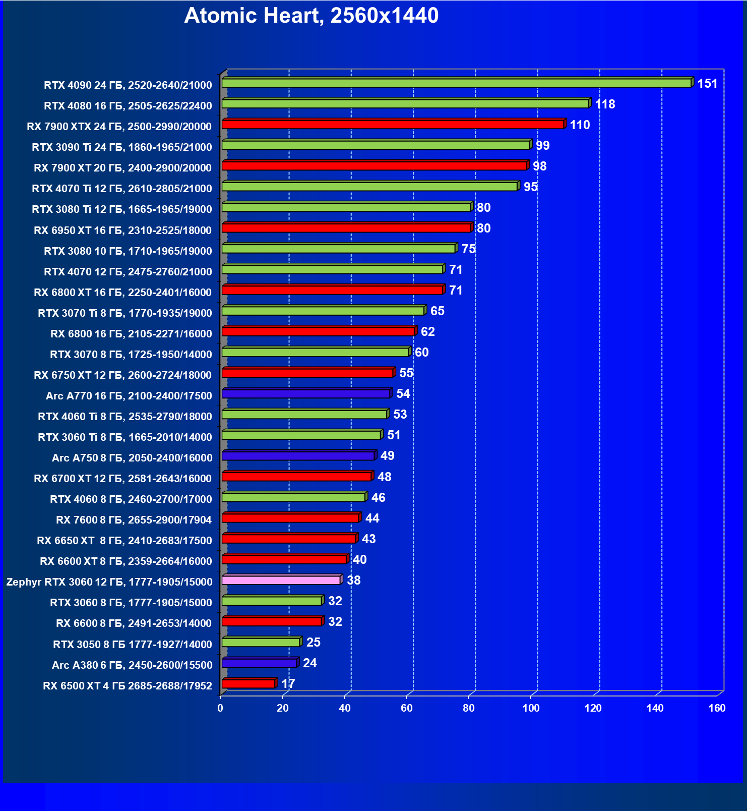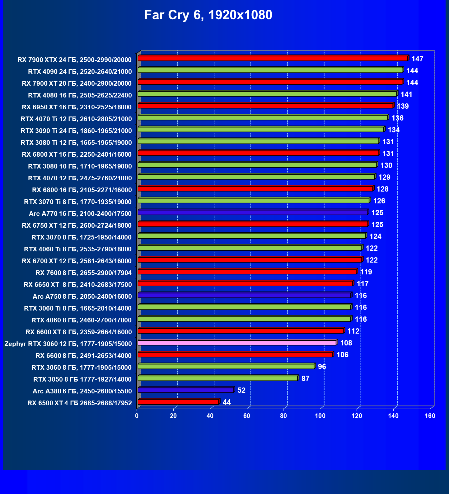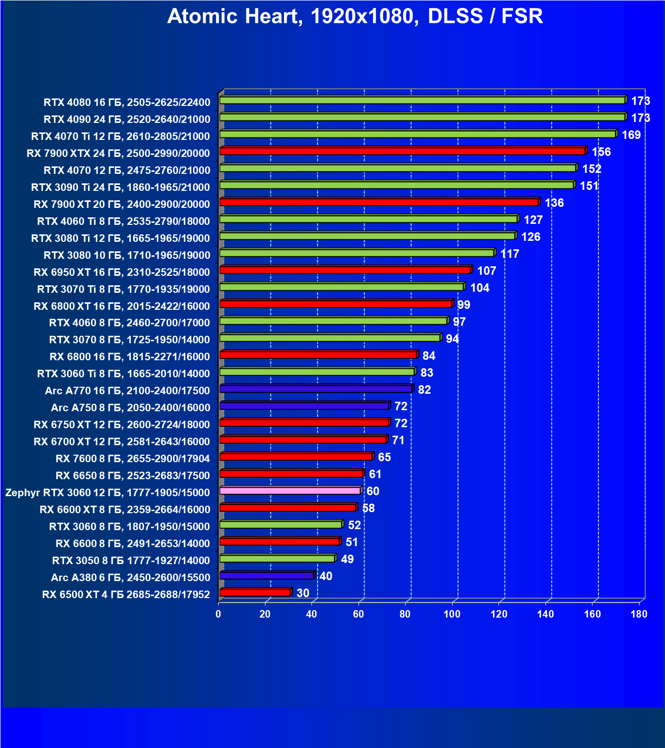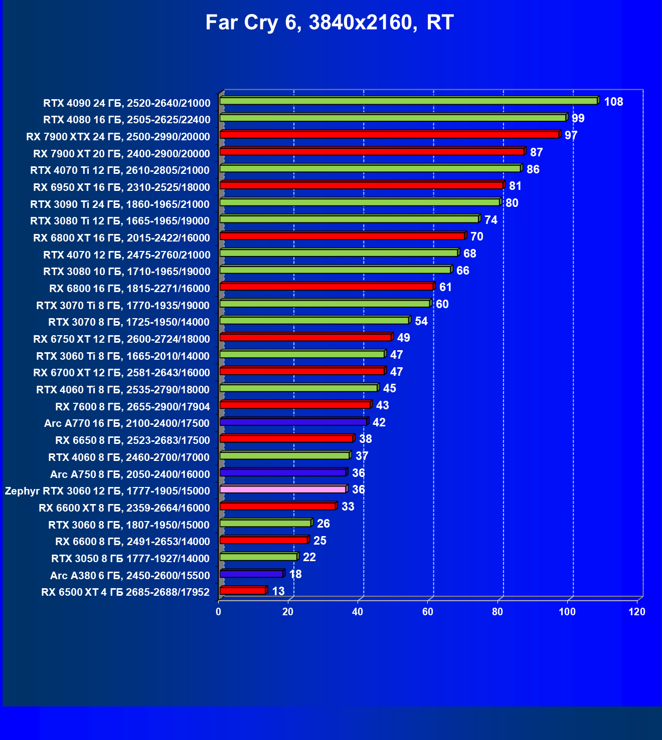 В играх без RT карты в этой группе занимают места в соответствии со своими ценами. Карта Zephyr логично расположилась между Radeon RX 6600 XT и Radeon RX 6600. 8-гигабайтный вариант GeForce RTX 3060 — в аутсайдерах.