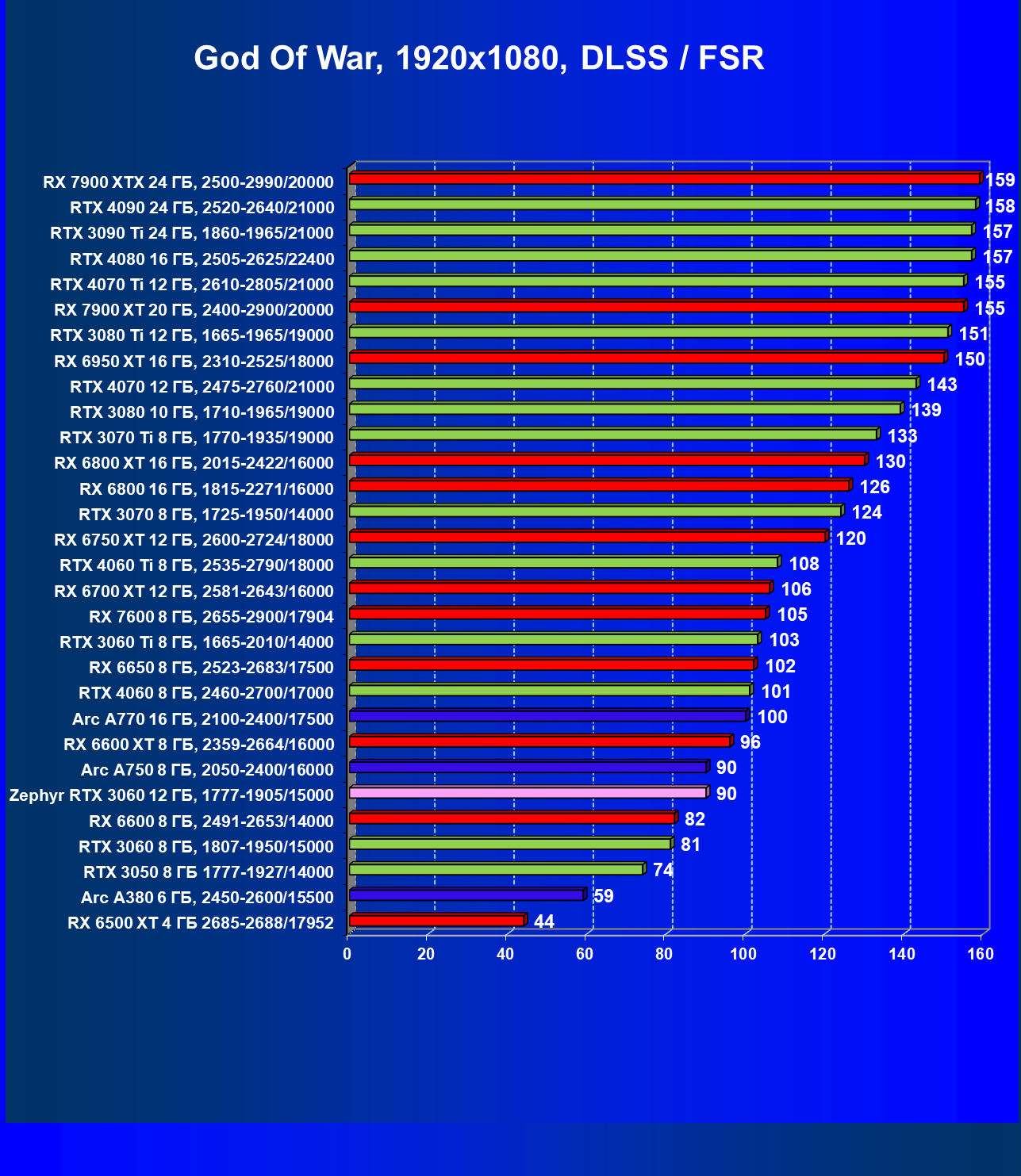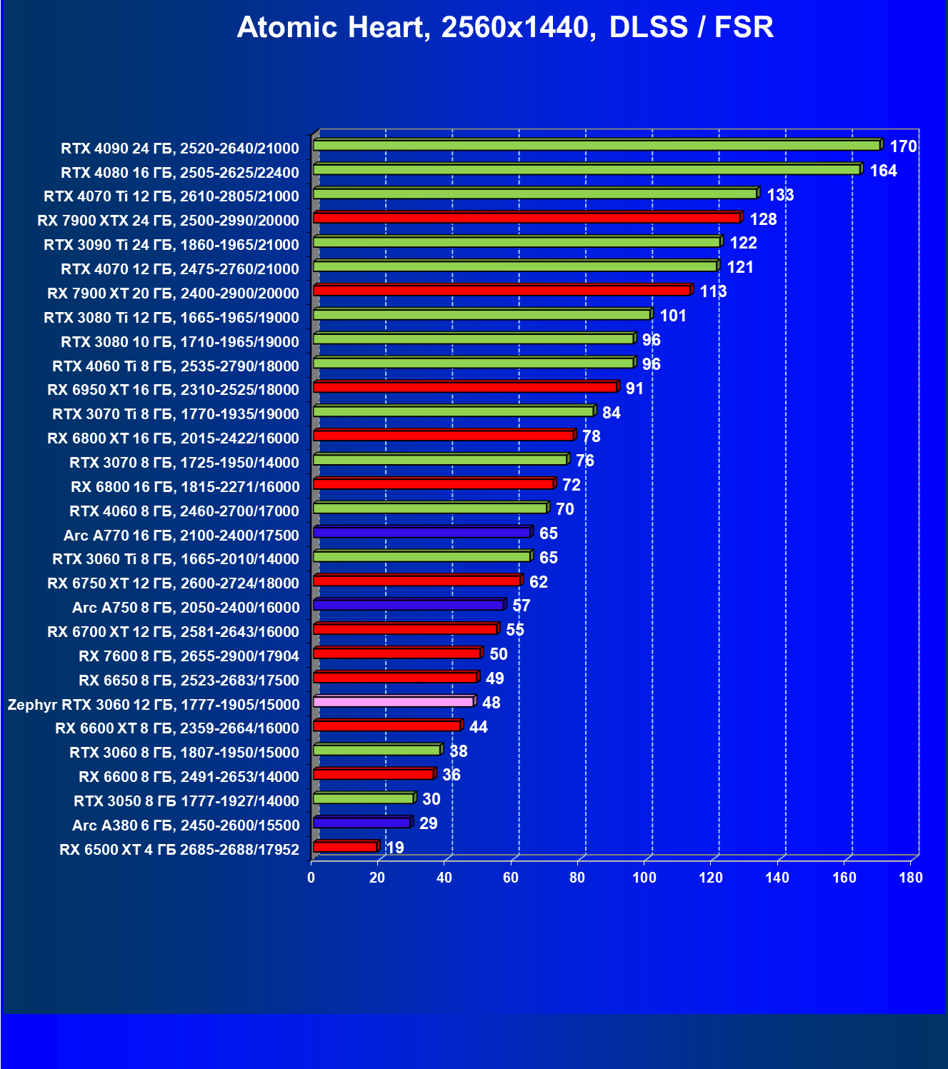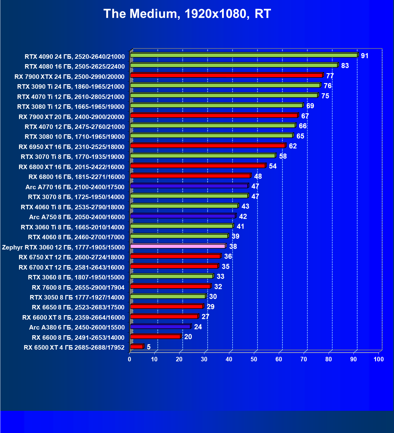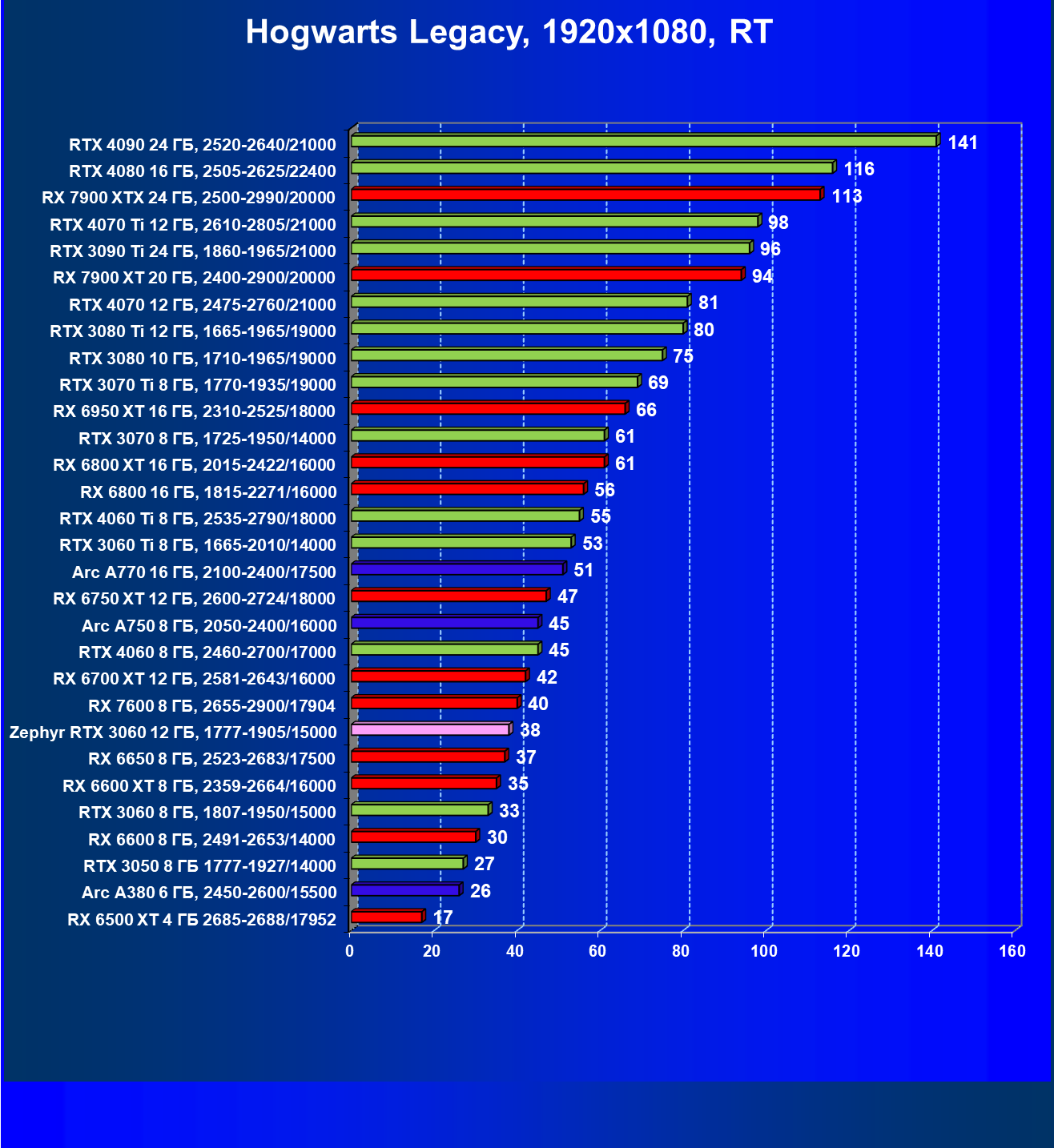В играх без RT карты в этой группе занимают места в соответствии со своими ценами. Карта Zephyr логично расположилась между Radeon RX 6600 XT и Radeon RX 6600. 8-гигабайтный вариант GeForce RTX 3060 — в аутсайдерах.