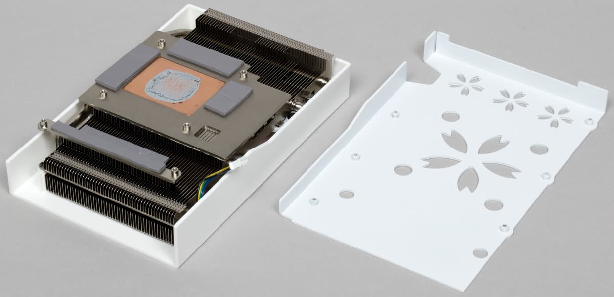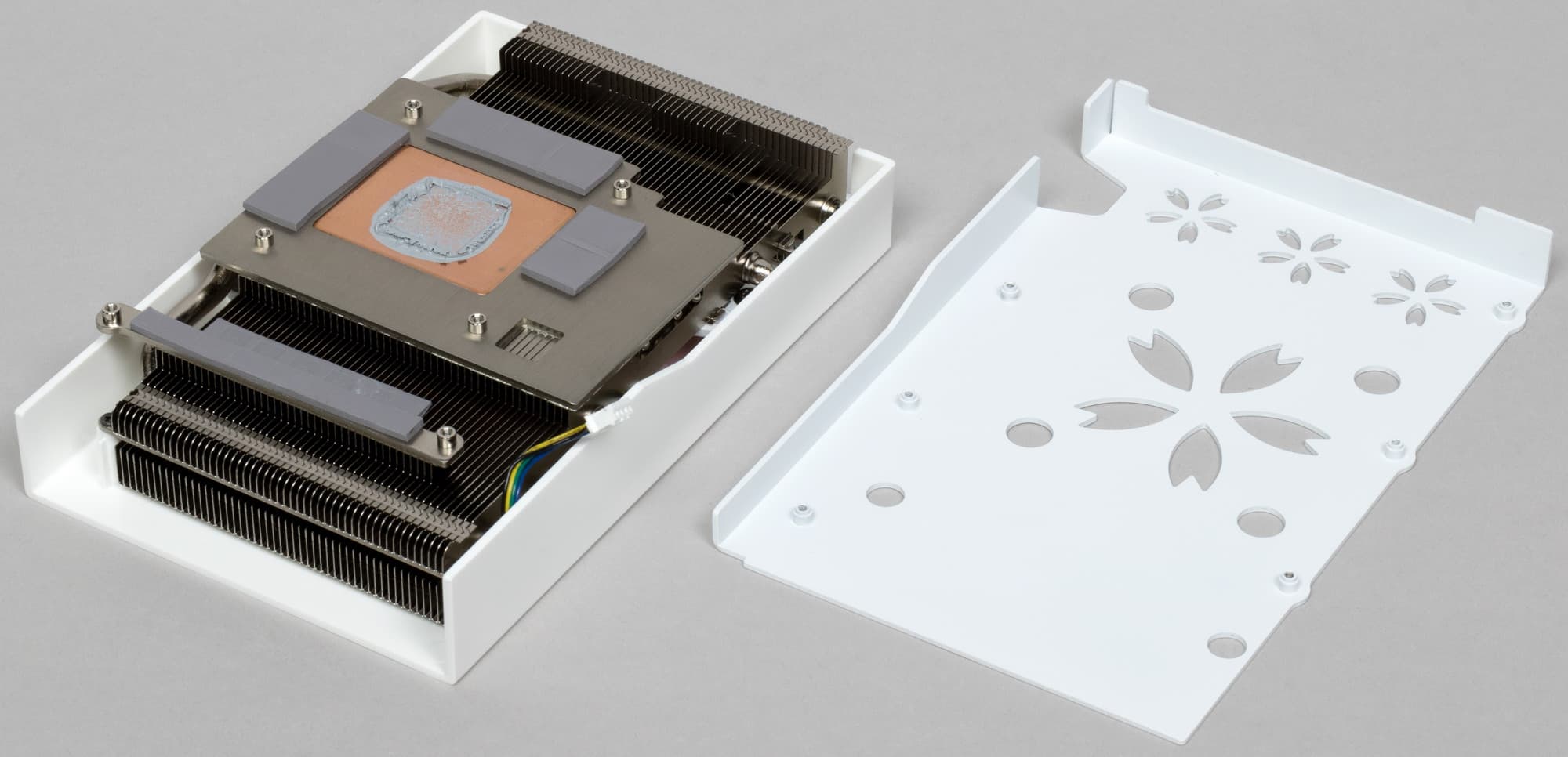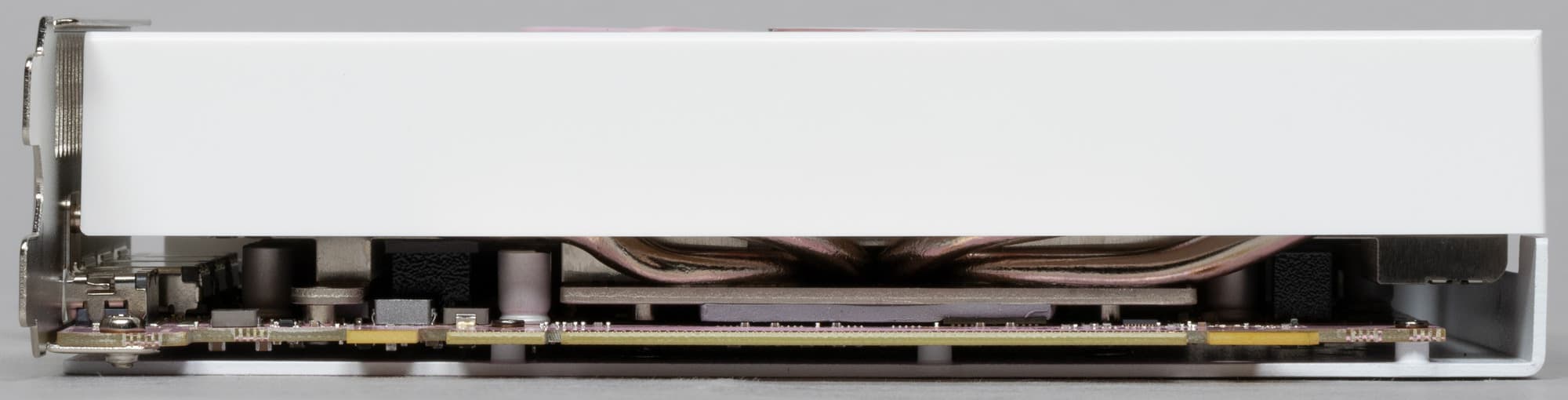 Основной пластинчатый радиатор имеет тепловые трубки, подведенные к подошве — теплосъемнику на GPU. Он же охлаждает микросхемы памяти, а для преобразователей питания VRM есть своя небольшая подошва. Задняя пластина играет роль защиты печатной платы, а также является элементом общего «няшечного» дизайна.