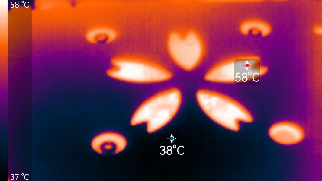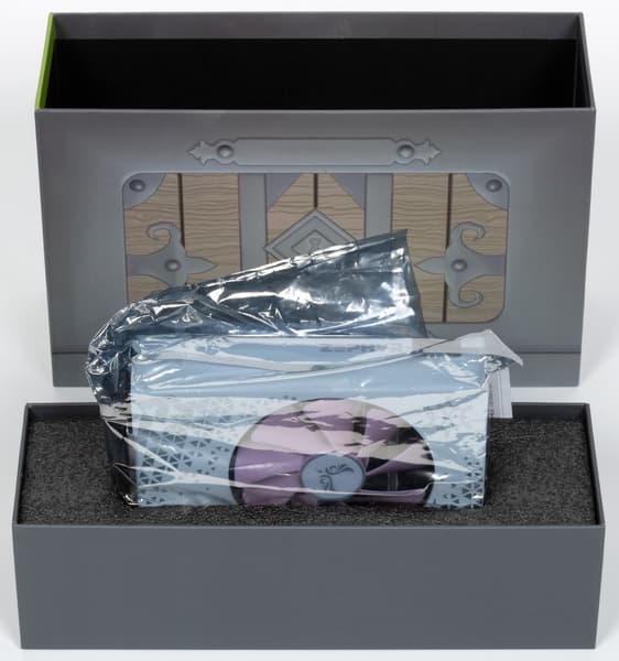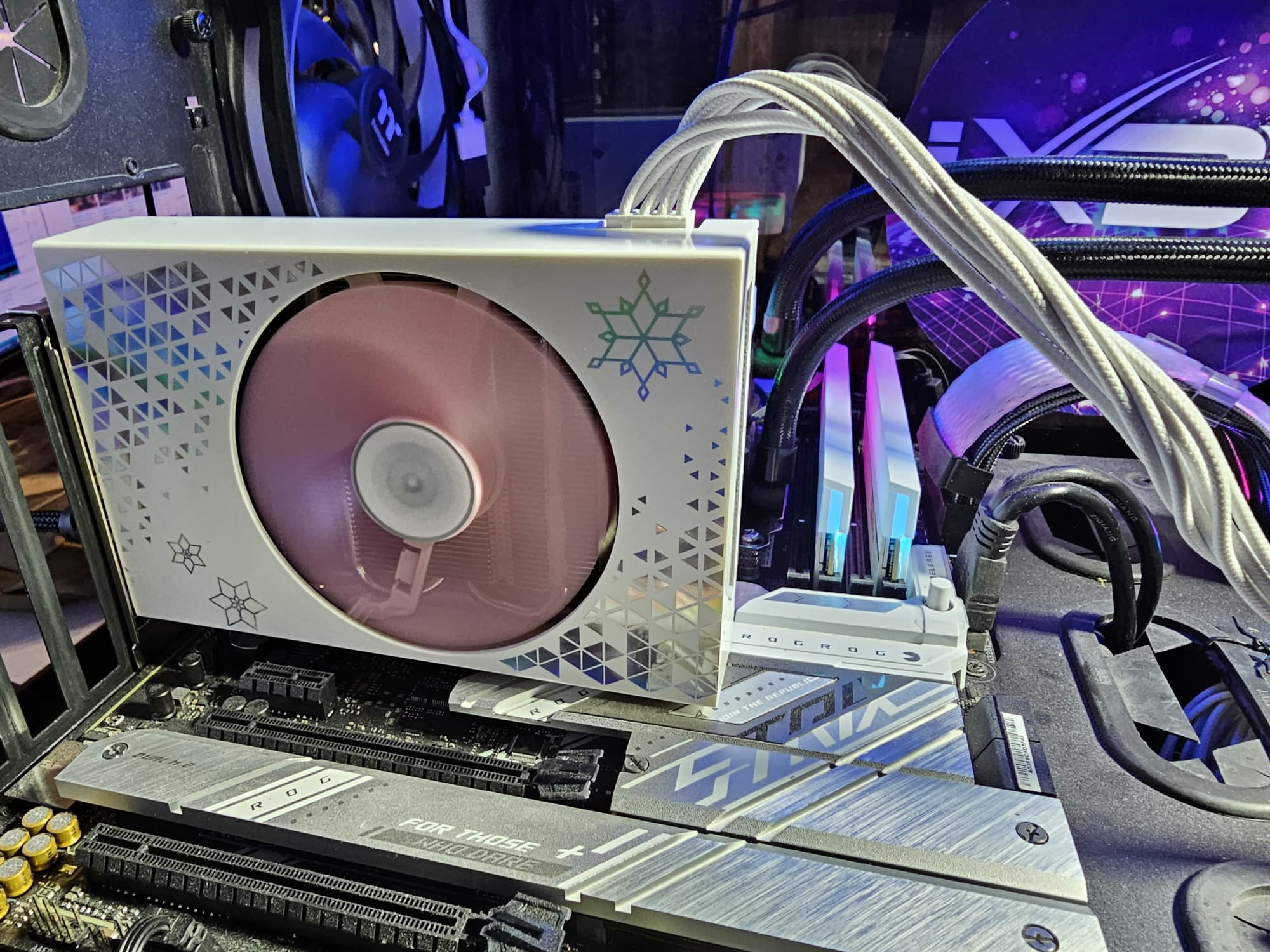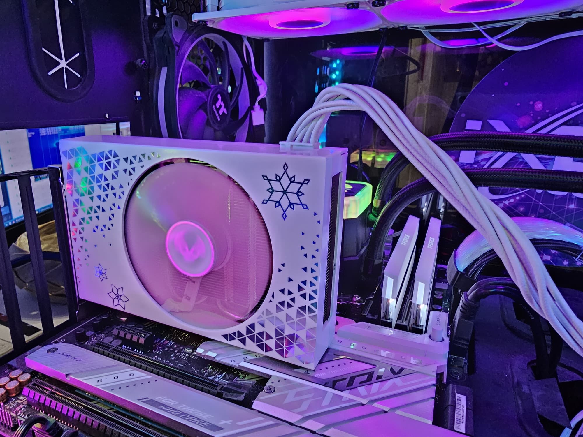 Основной пластинчатый радиатор имеет тепловые трубки, подведенные к подошве — теплосъемнику на GPU. Он же охлаждает микросхемы памяти, а для преобразователей питания VRM есть своя небольшая подошва. Задняя пластина играет роль защиты печатной платы, а также является элементом общего «няшечного» дизайна.