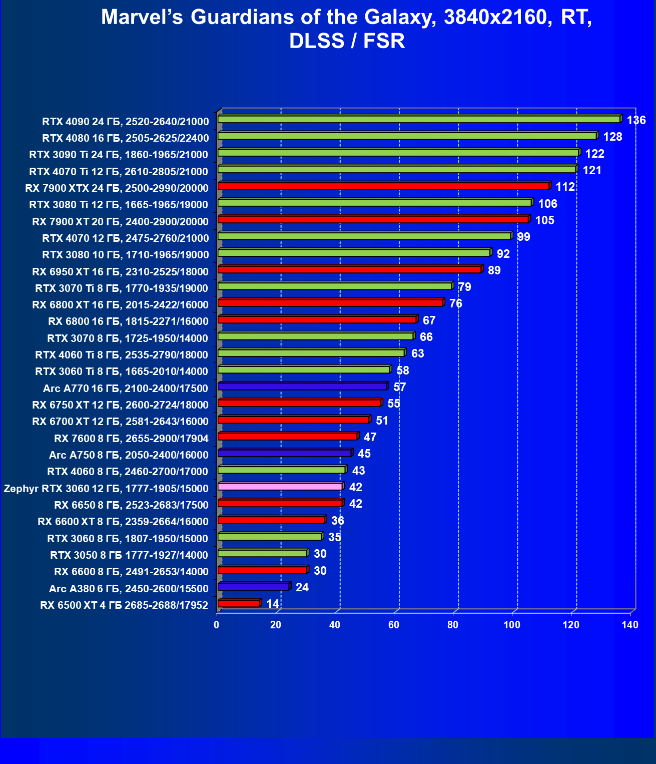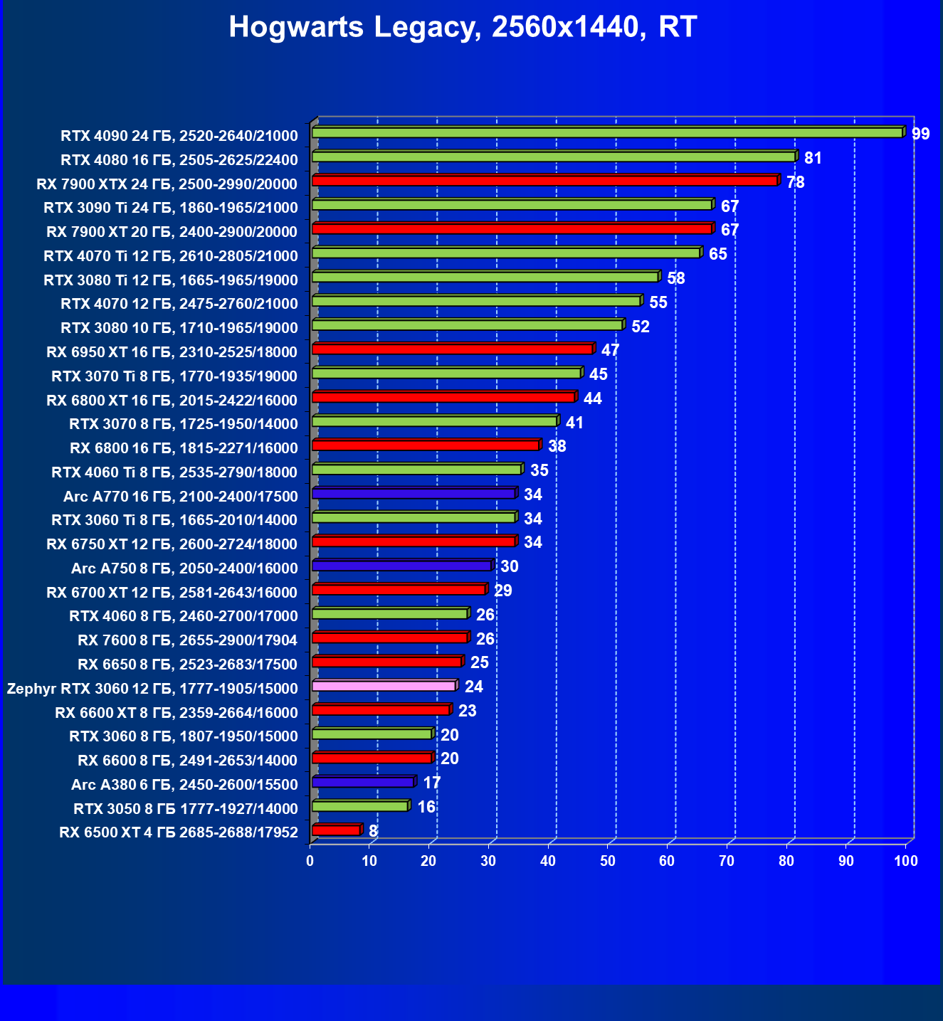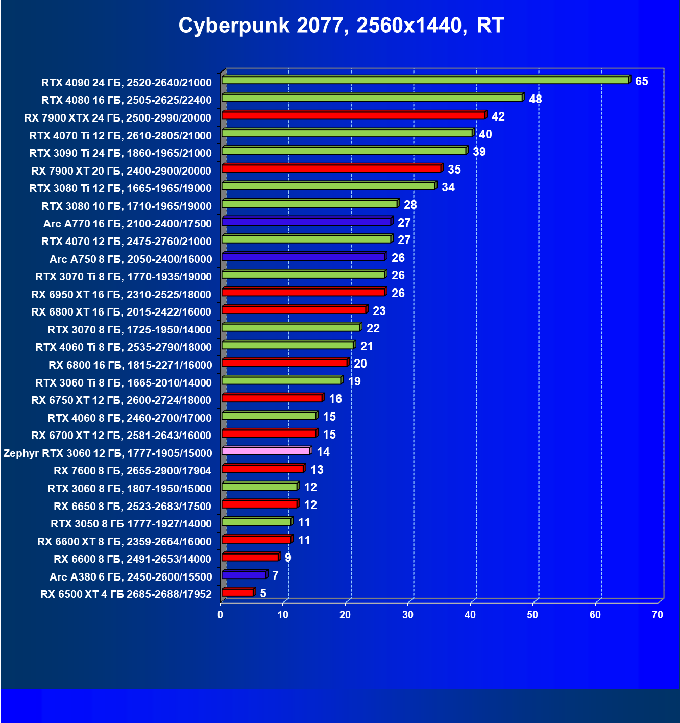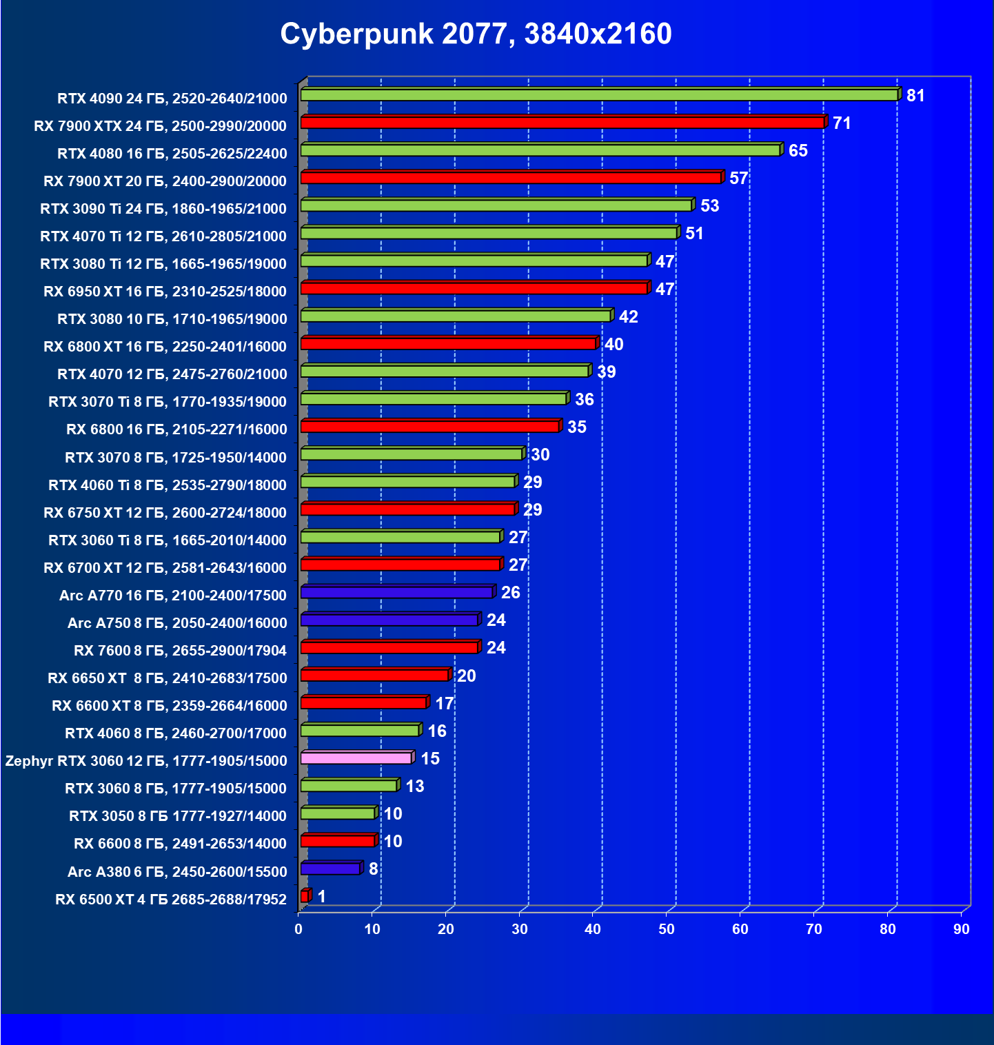 | 21 | Arc A750 8 ГБ, 2050—2400/16000 | 278 | 79 | 35 000 |
