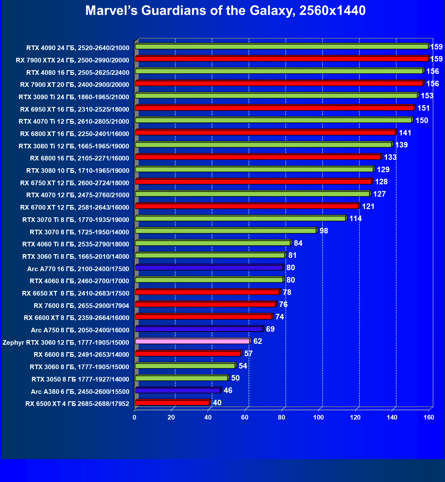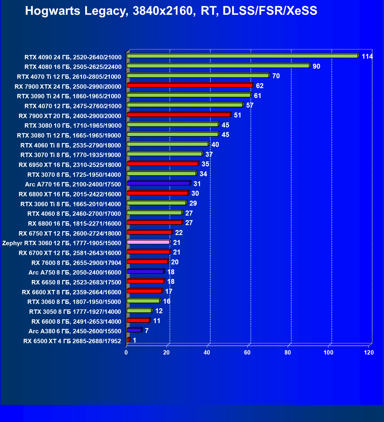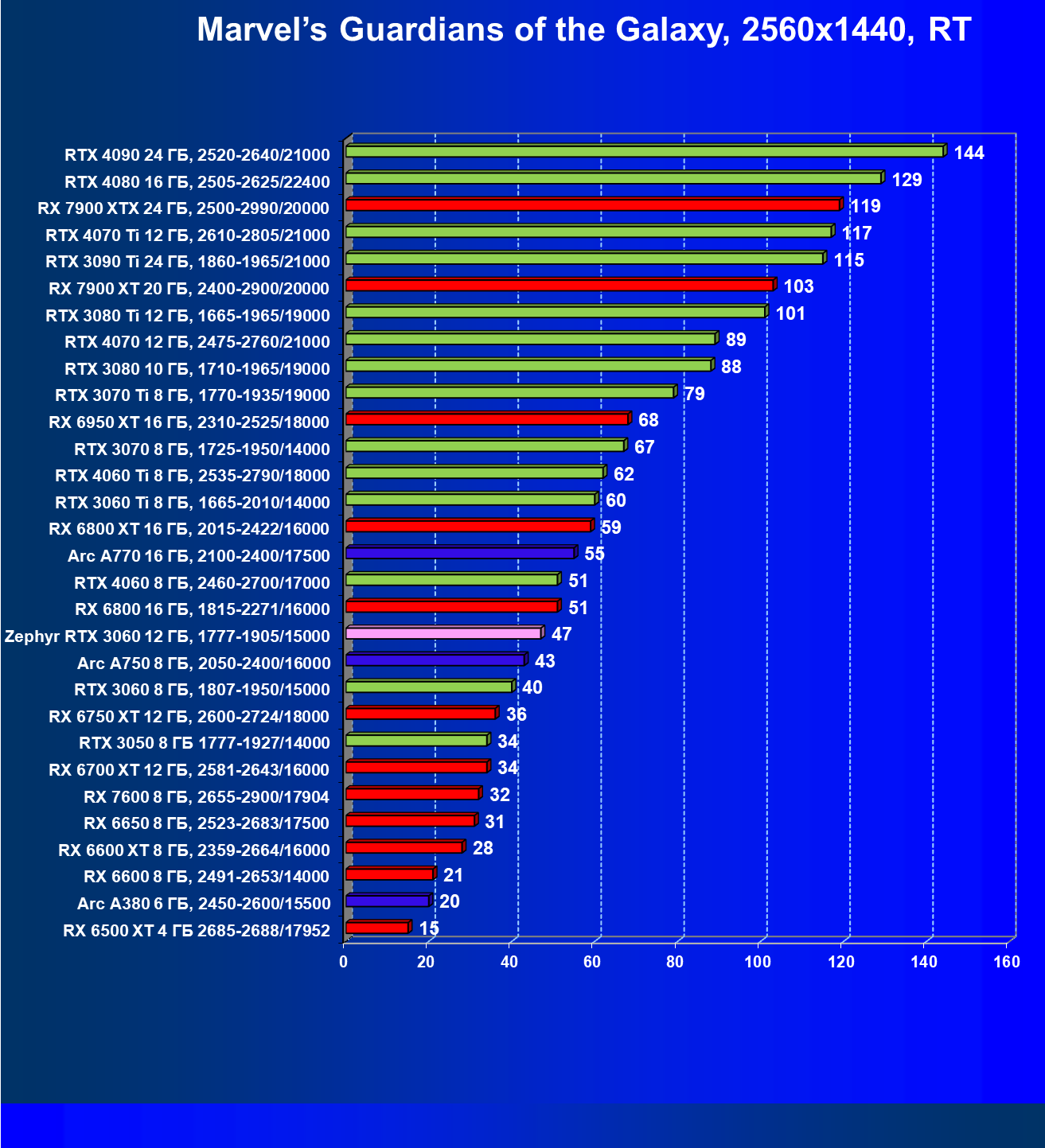 | 21 | Arc A750 8 ГБ, 2050—2400/16000 | 278 | 79 | 35 000 |