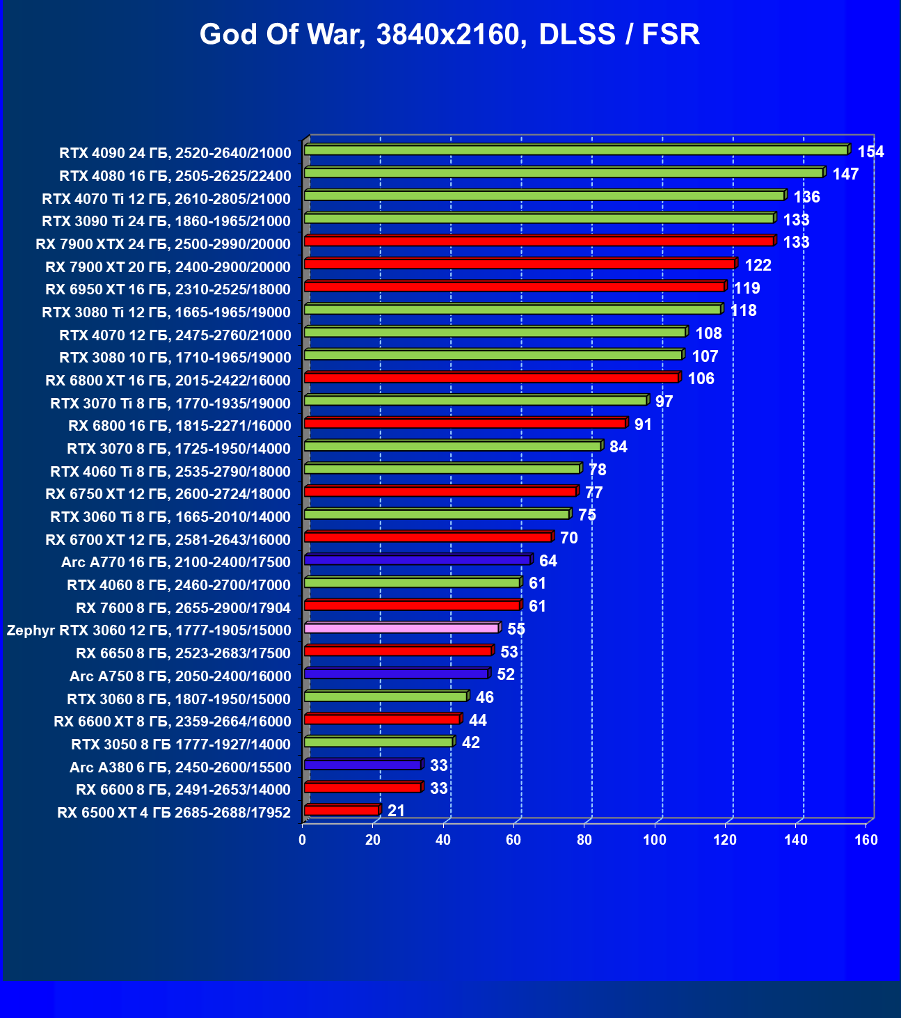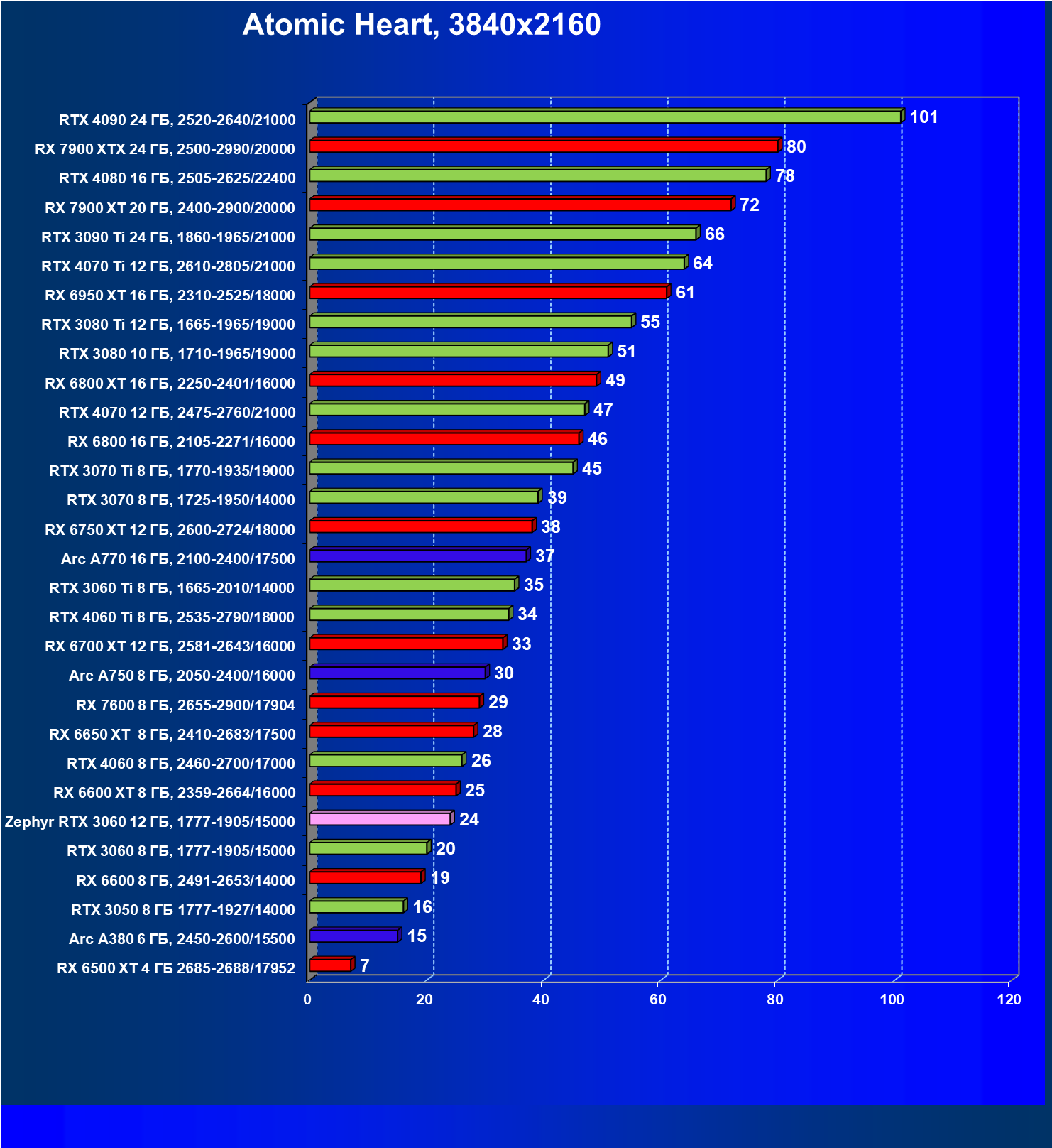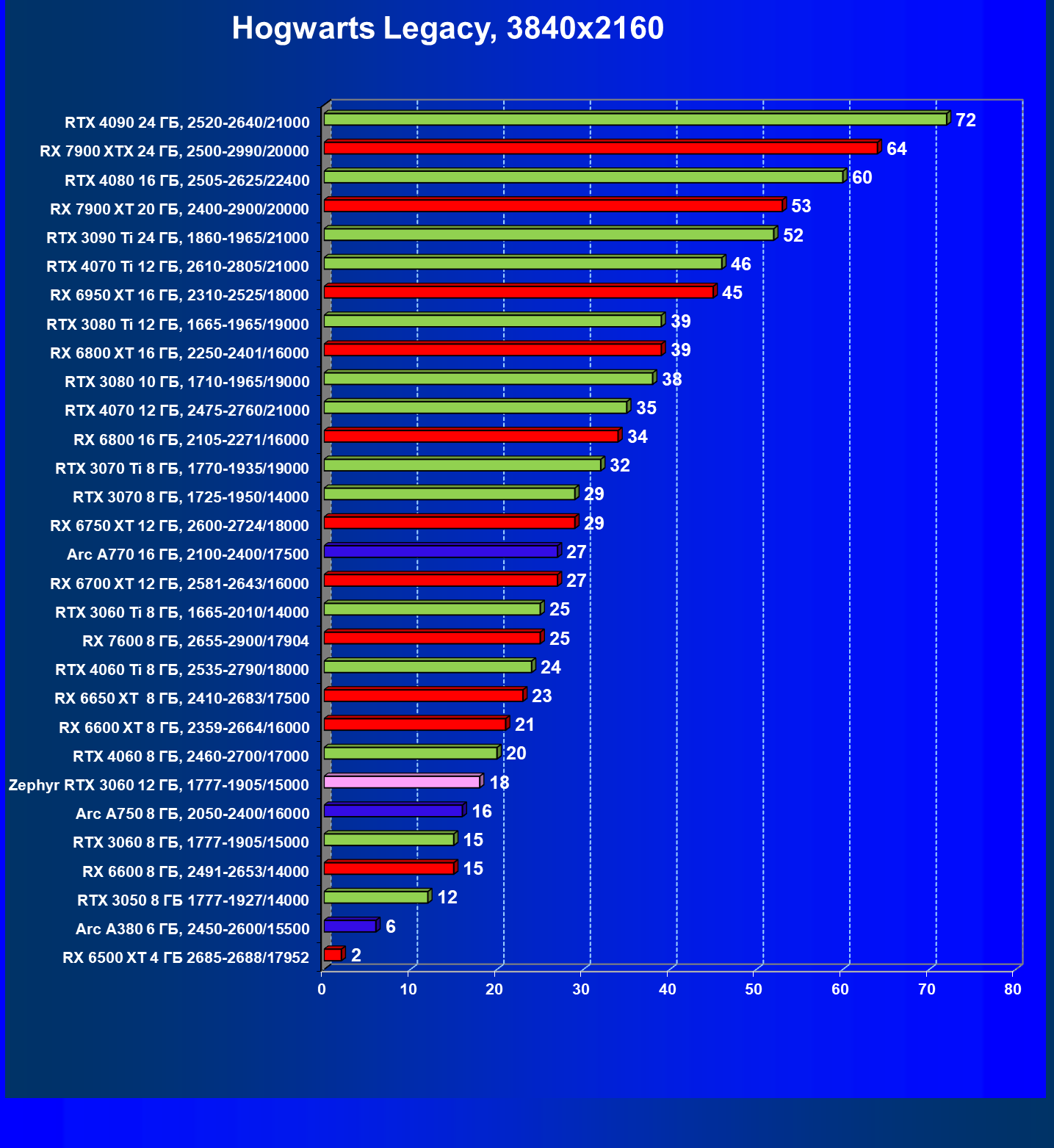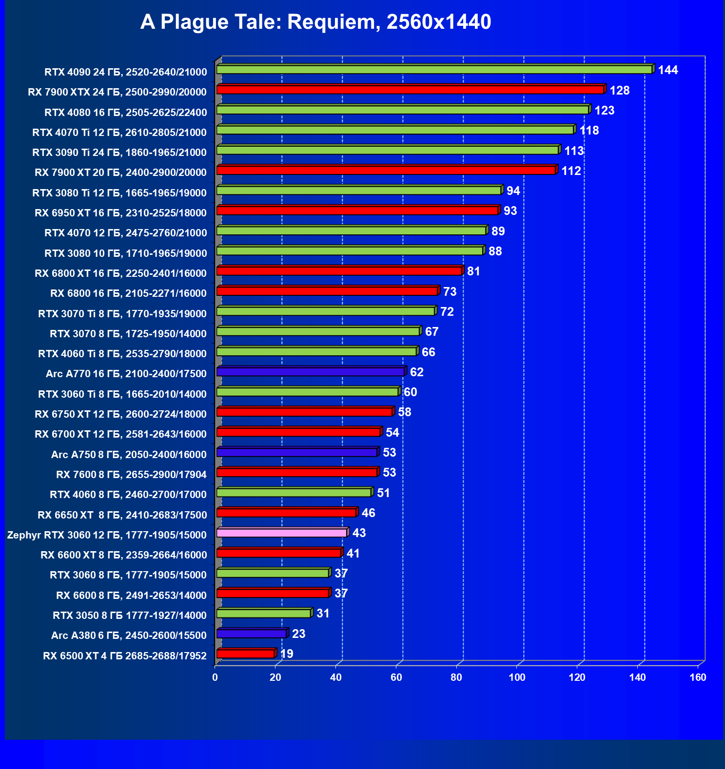 | 21 | Arc A750 8 ГБ, 2050—2400/16000 | 278 | 79 | 35 000 |