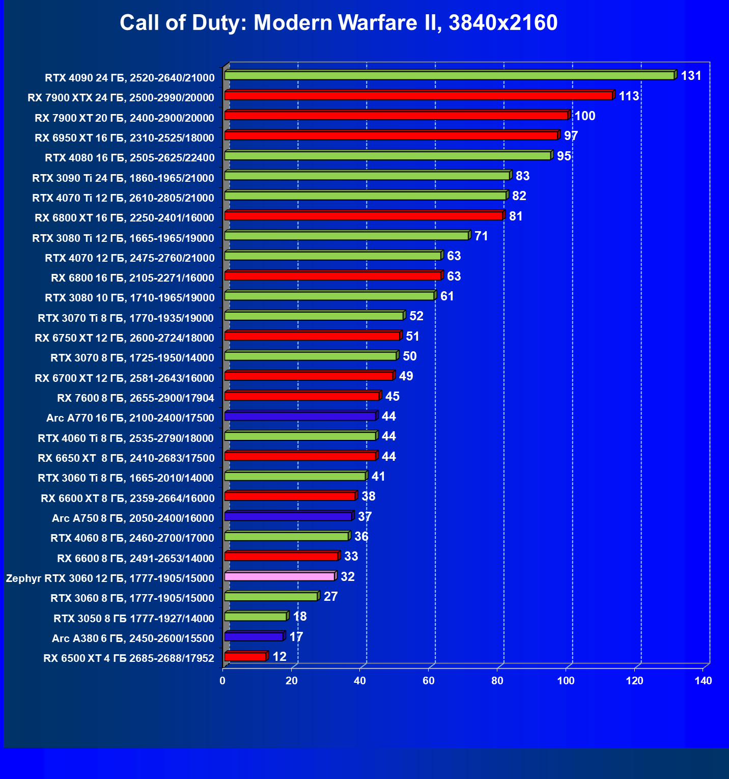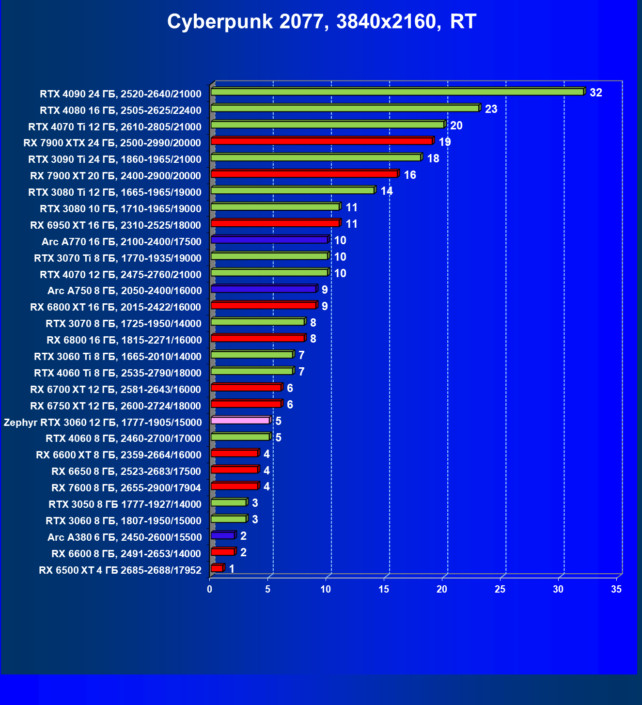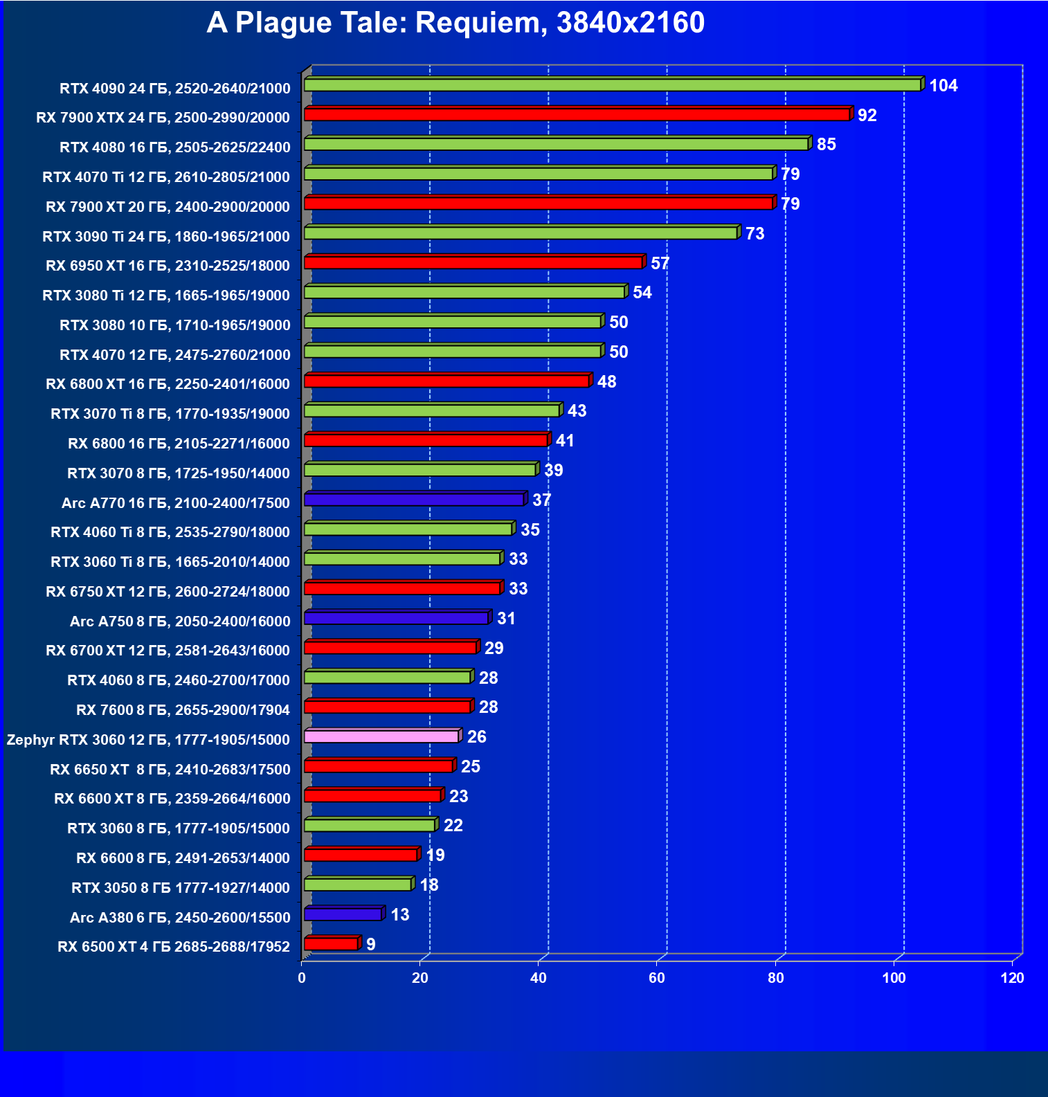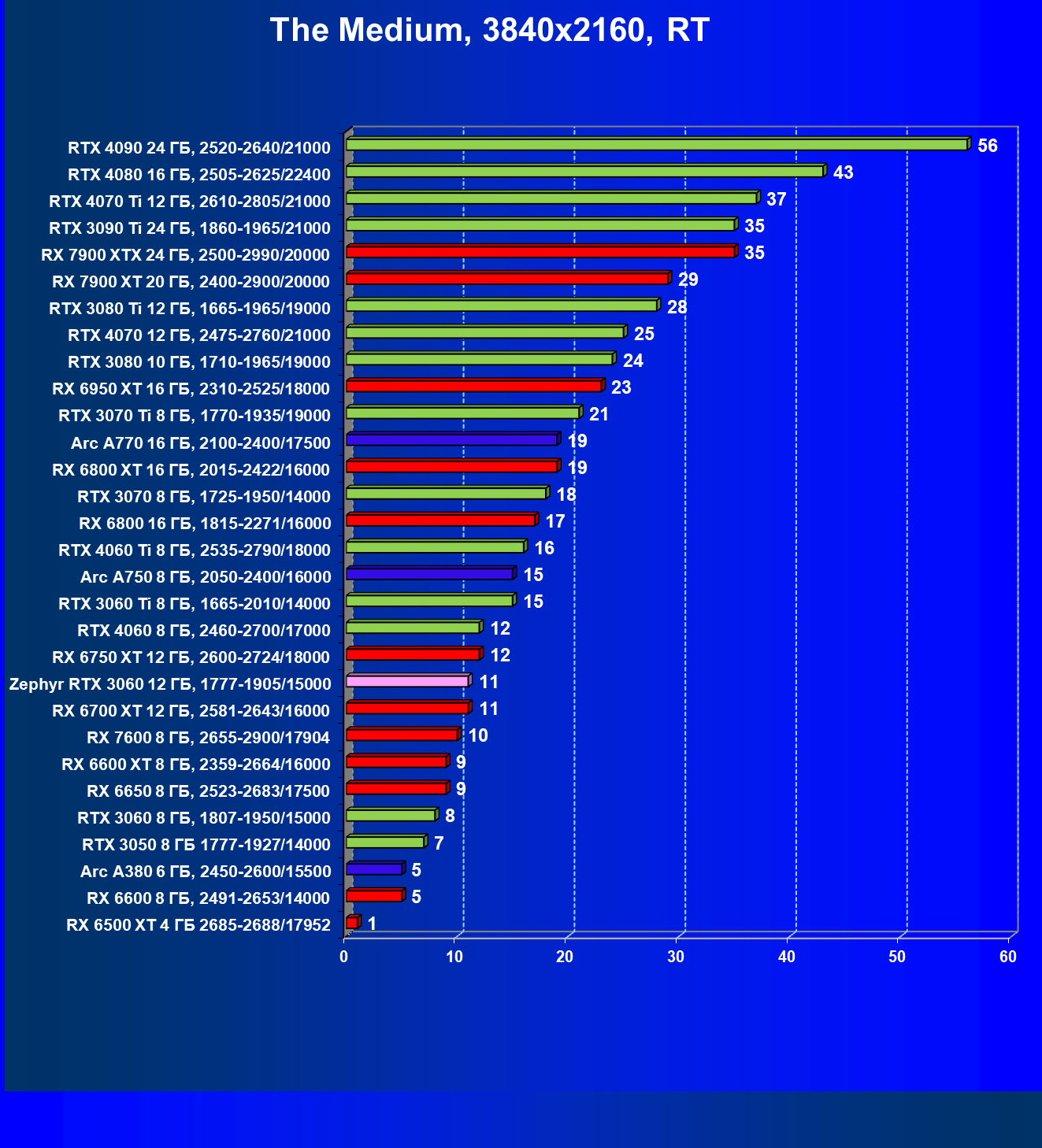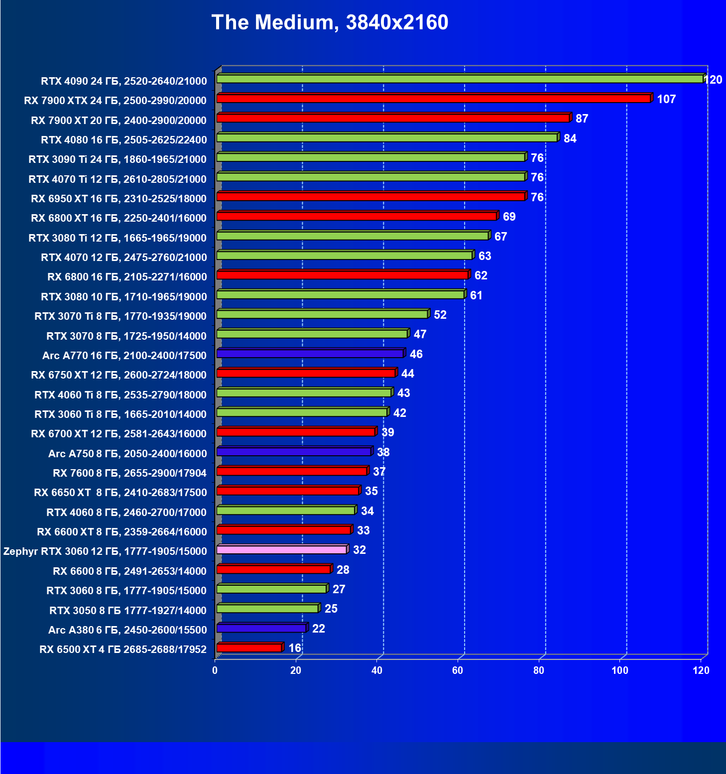 | 11 | Arc A750 8 ГБ, 2050—2400/16000 | 113 | 396 | 35 000 |