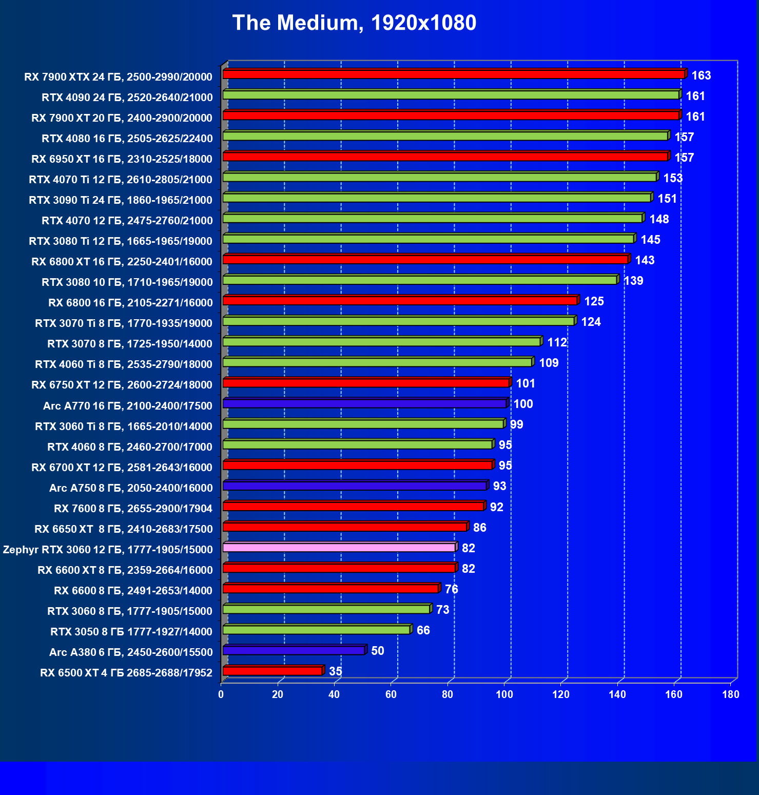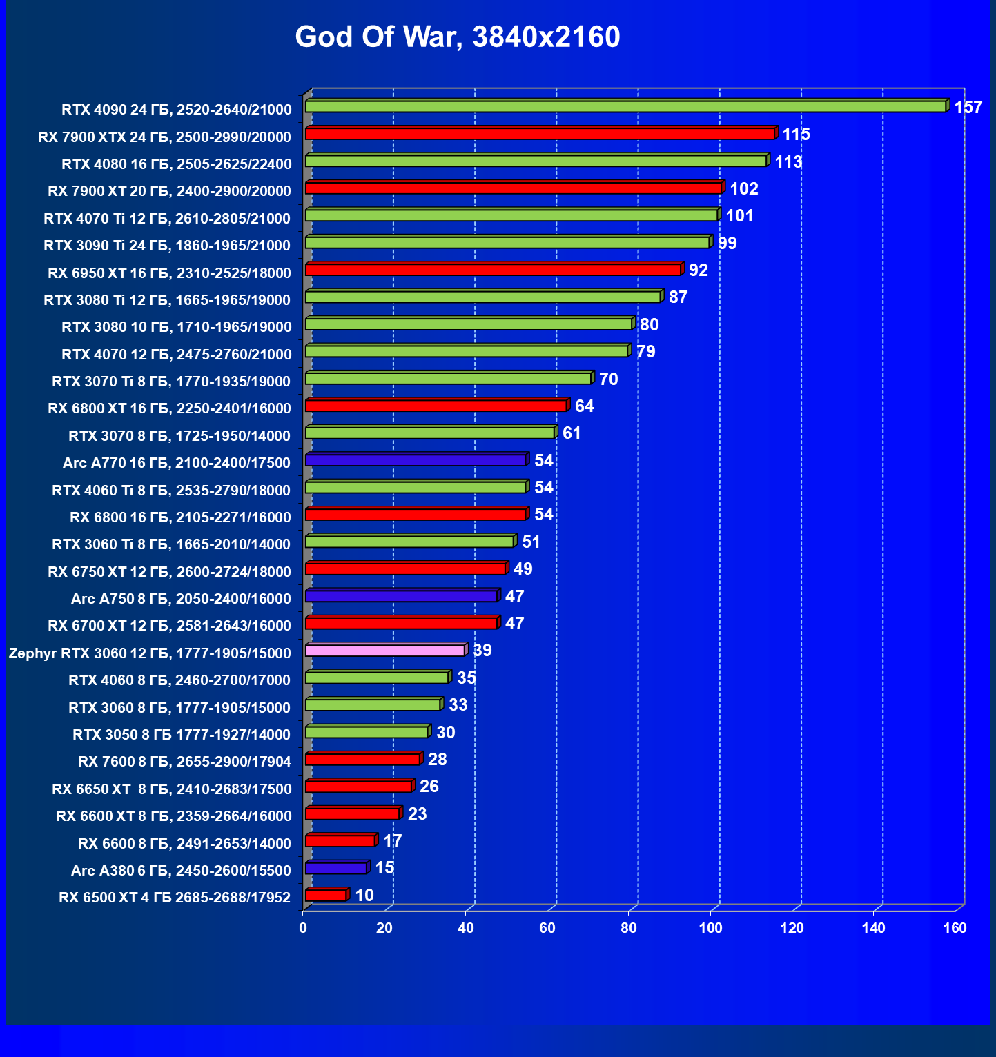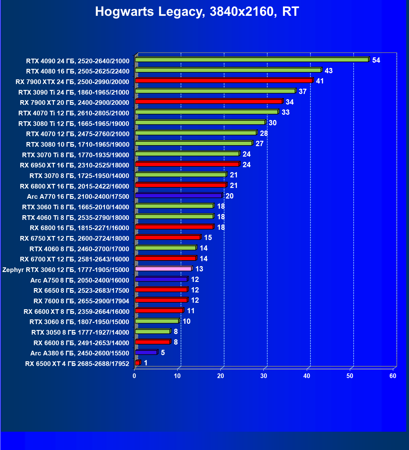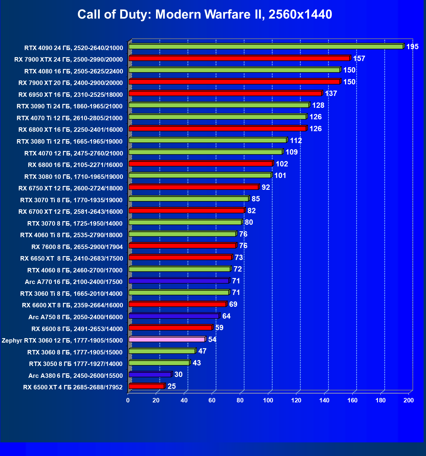 | 11 | Arc A750 8 ГБ, 2050—2400/16000 | 113 | 396 | 35 000 |