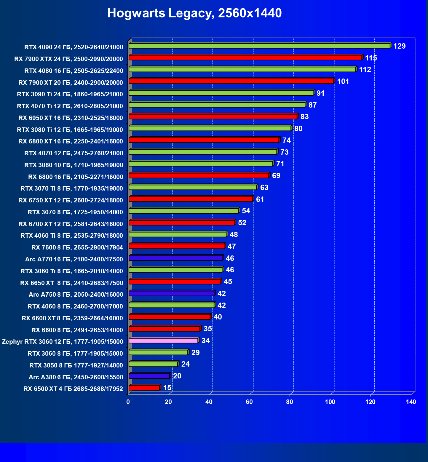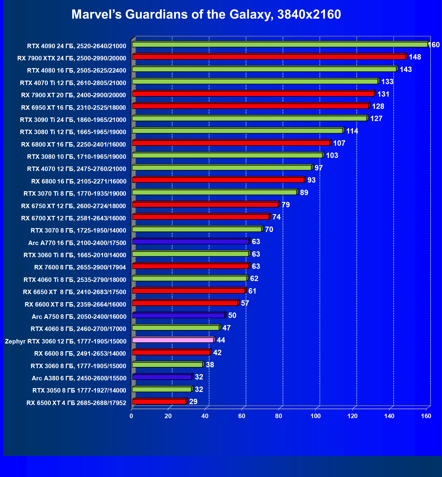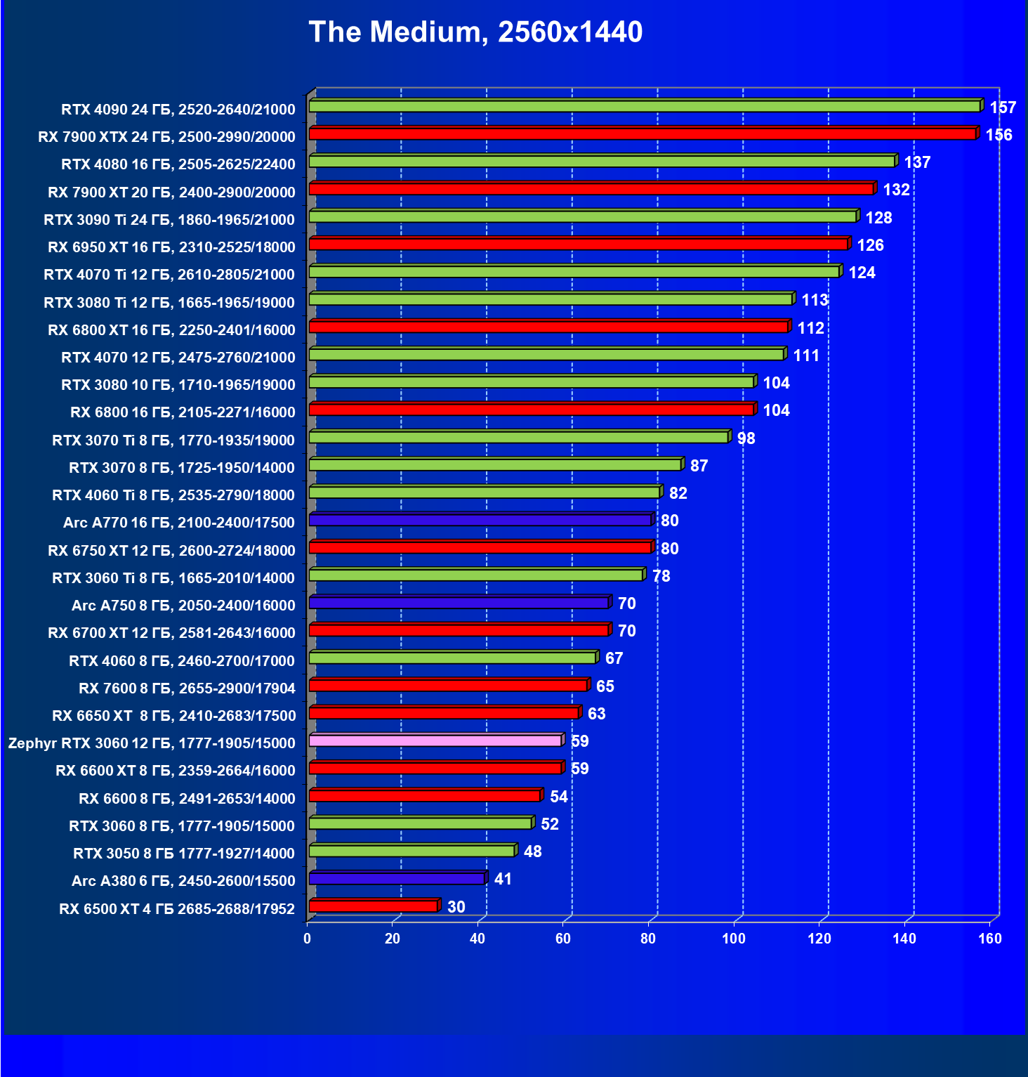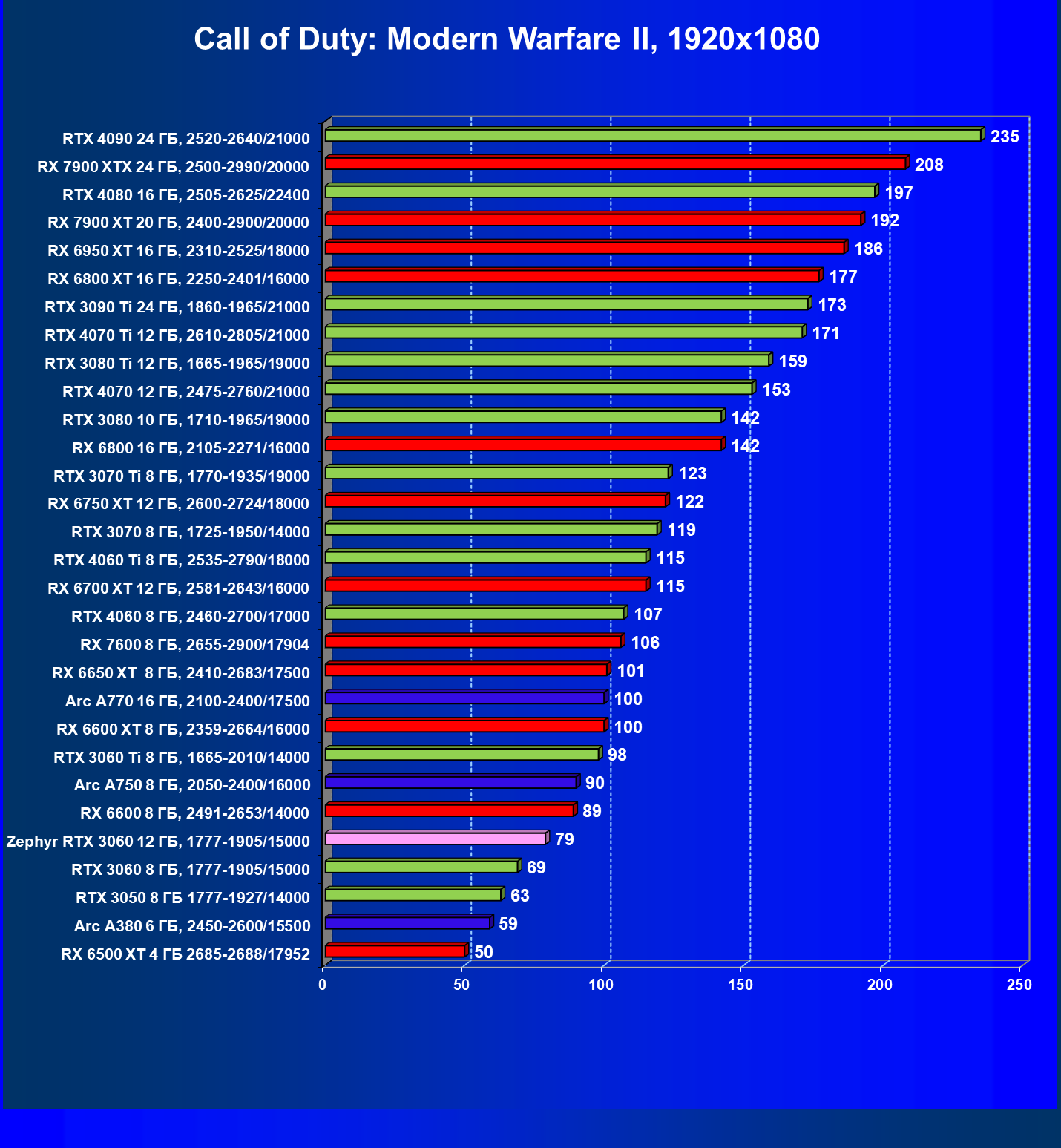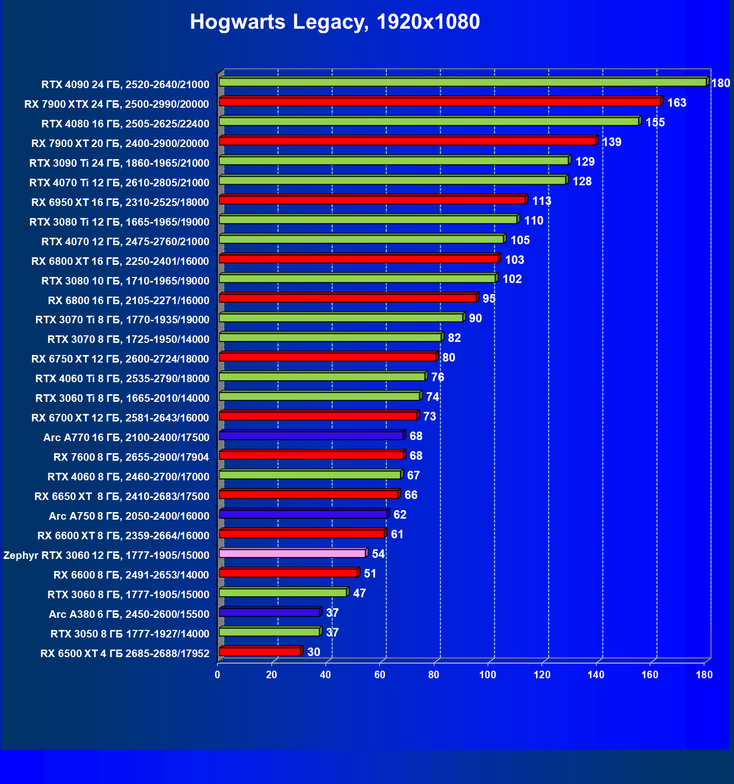 | 11 | Arc A750 8 ГБ, 2050—2400/16000 | 113 | 396 | 35 000 |