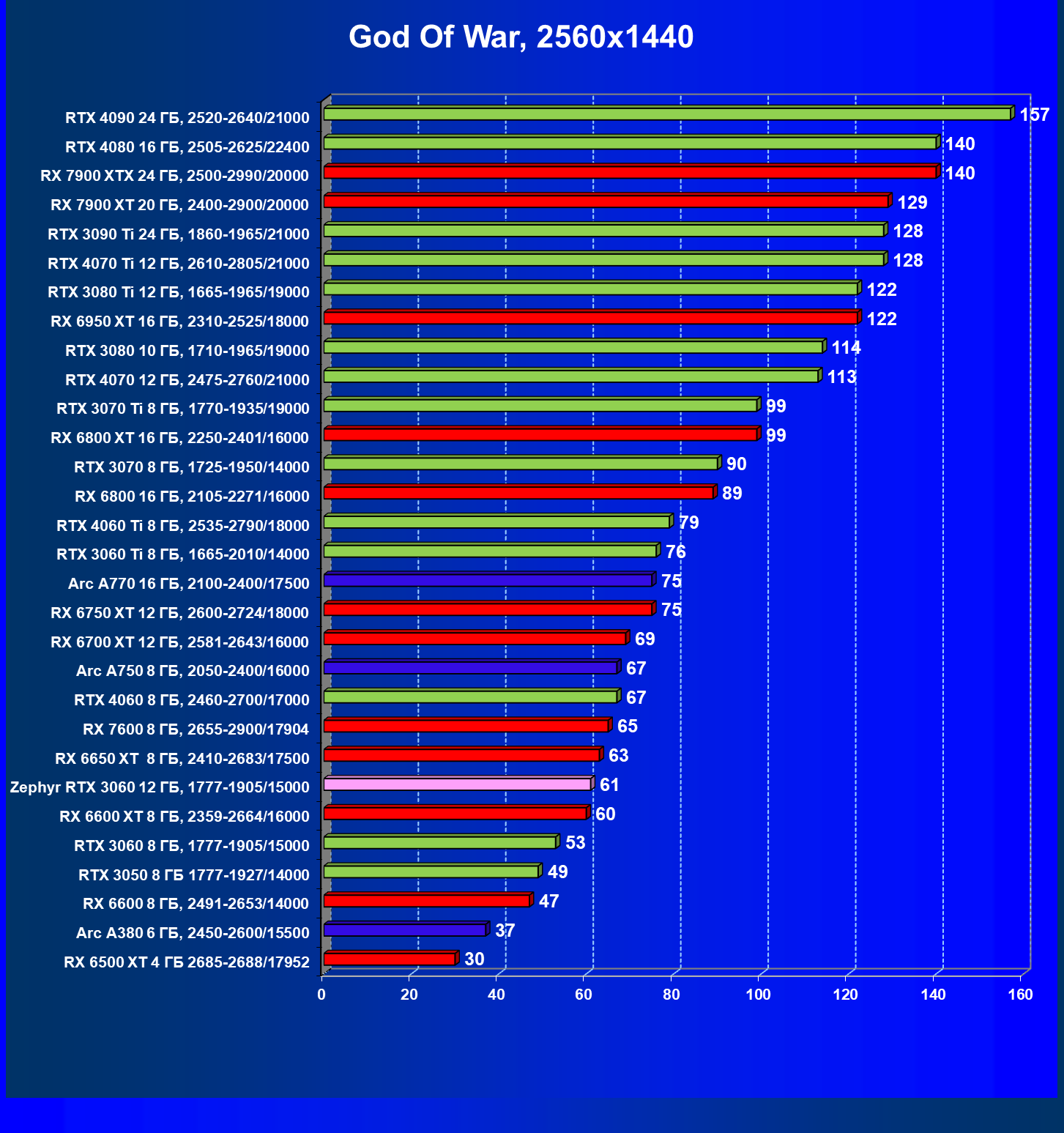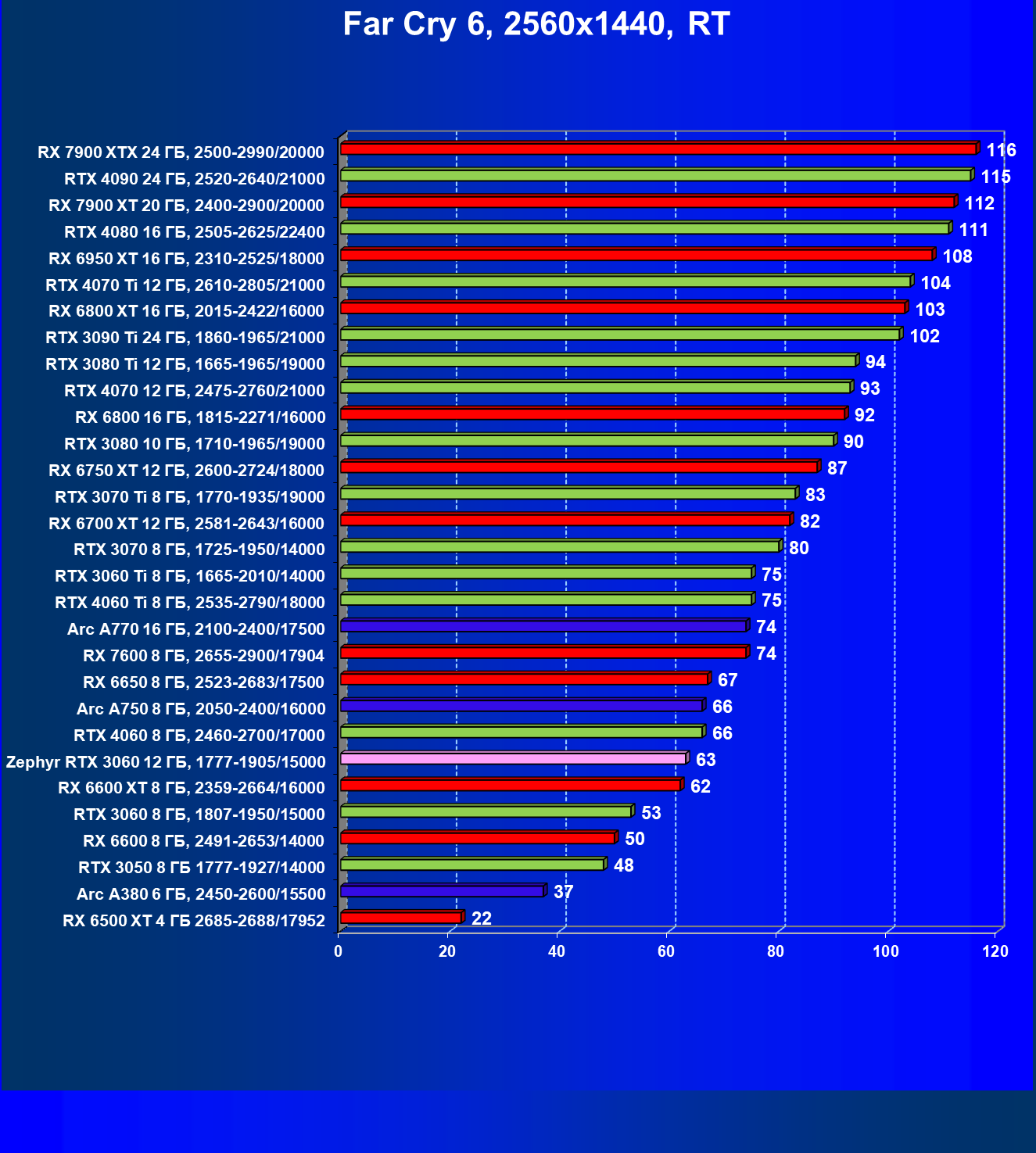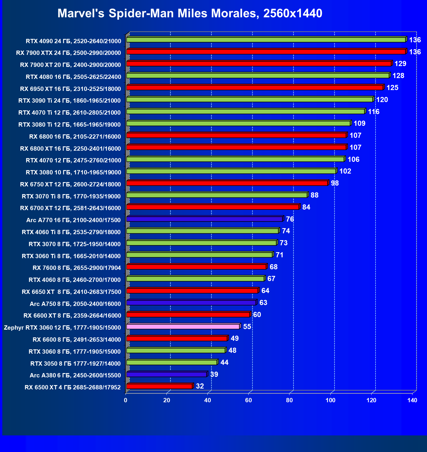 Отлично видно, что GeForce RTX 3060 создан для Full HD, однако и в 2.5K в ряде игр обеспечивает приличную производительность при максимальных настройках графики. Близкие соперники — Radeon RX 6600 и Radeon RX 6600 XT. А близкий по цене Arc A750 заметно опережает GeForce RTX 3060 с 12 ГБ.