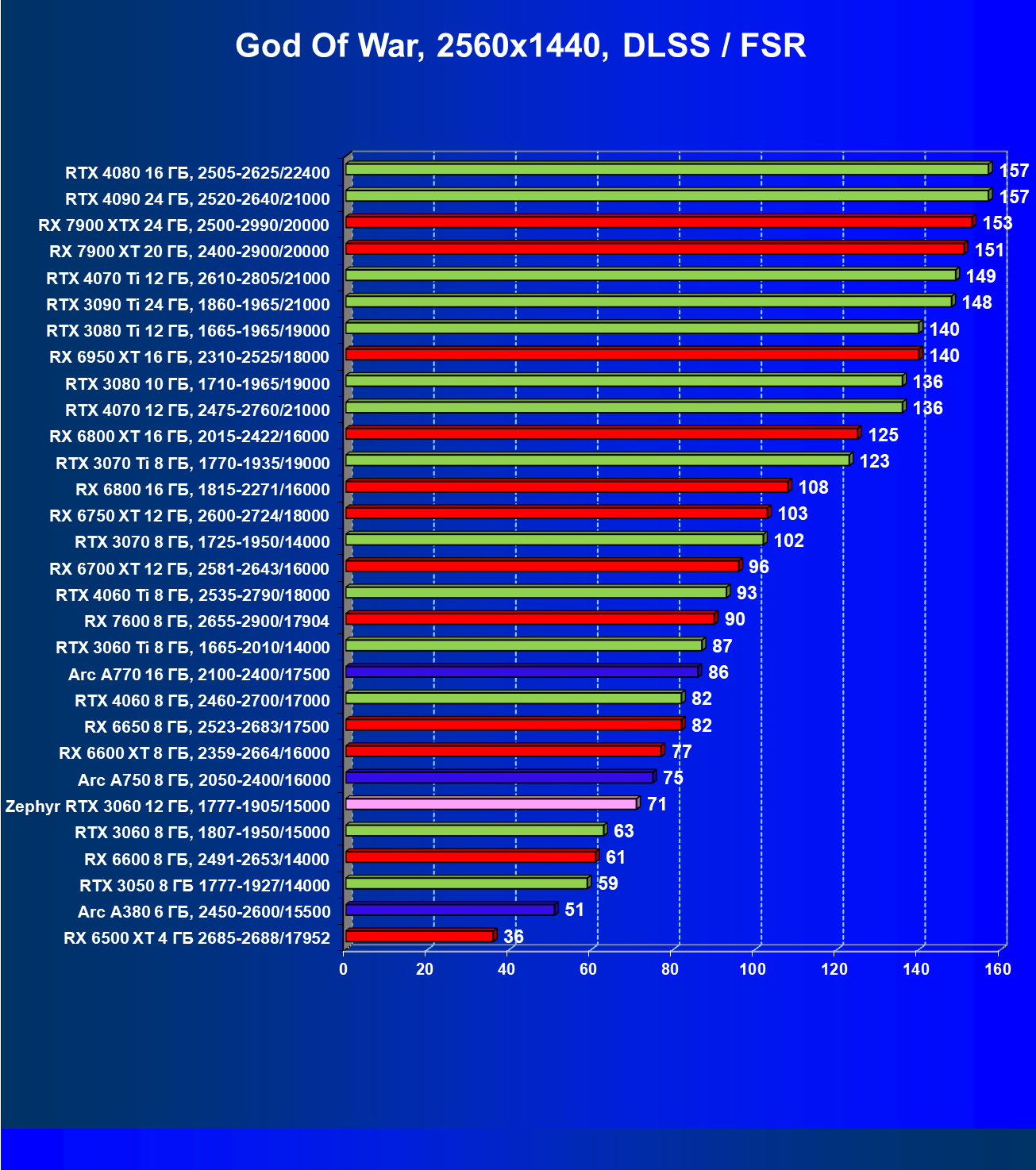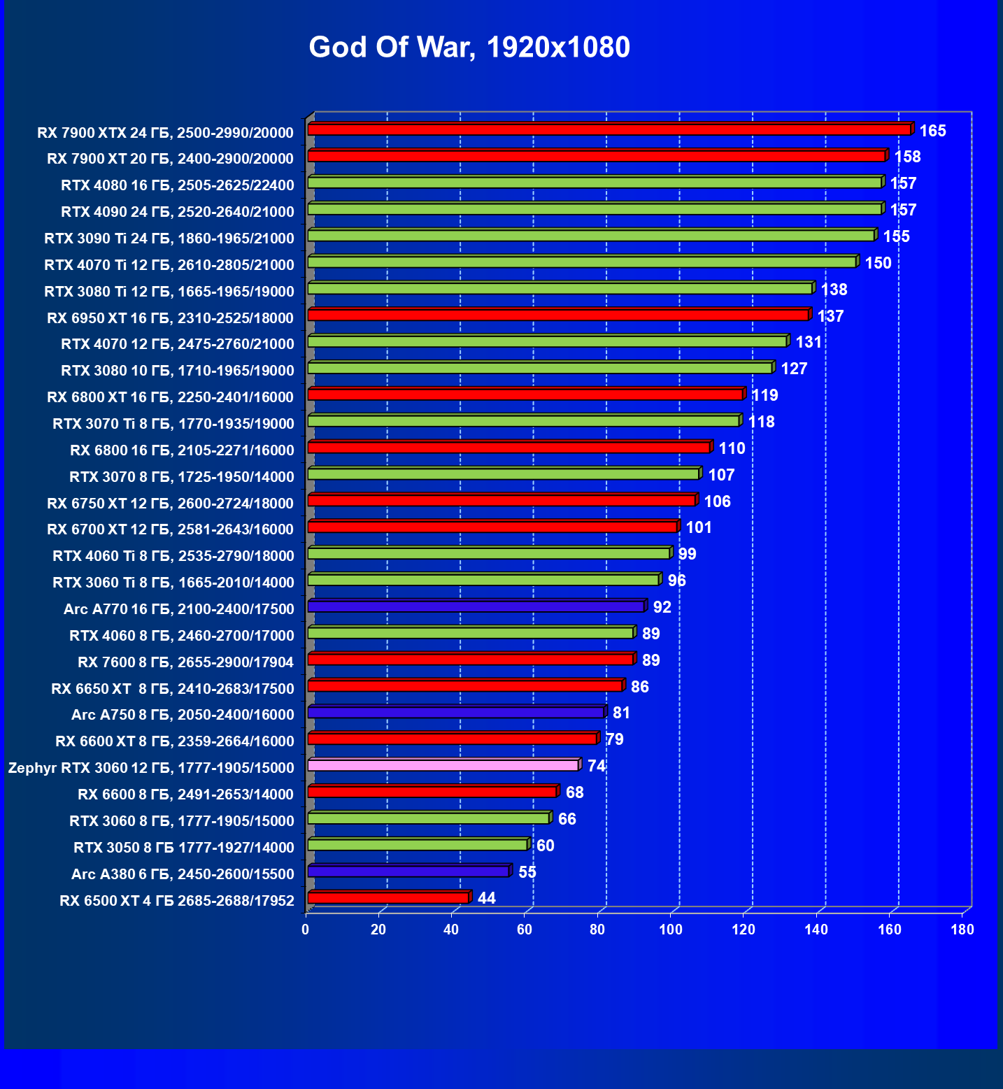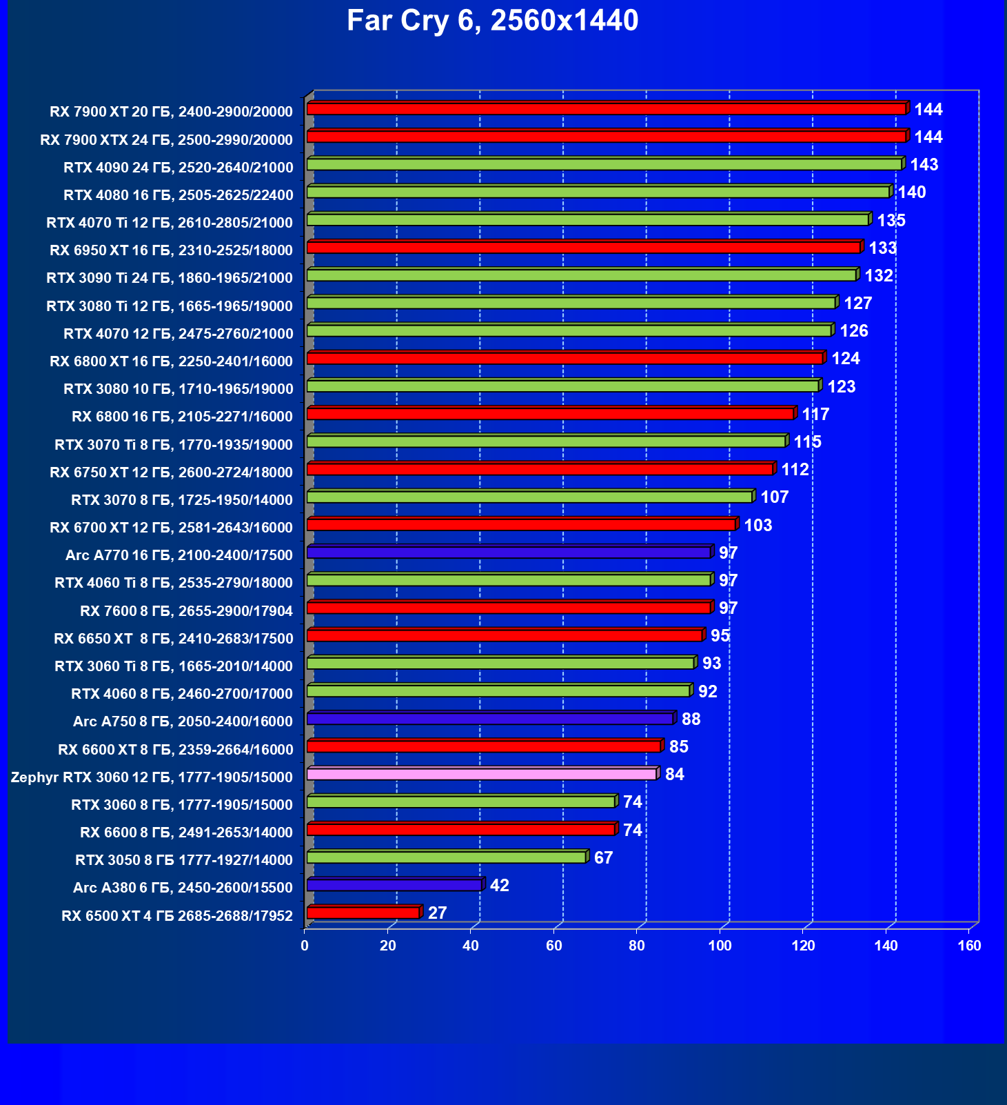 Отлично видно, что GeForce RTX 3060 создан для Full HD, однако и в 2.5K в ряде игр обеспечивает приличную производительность при максимальных настройках графики. Близкие соперники — Radeon RX 6600 и Radeon RX 6600 XT. А близкий по цене Arc A750 заметно опережает GeForce RTX 3060 с 12 ГБ.