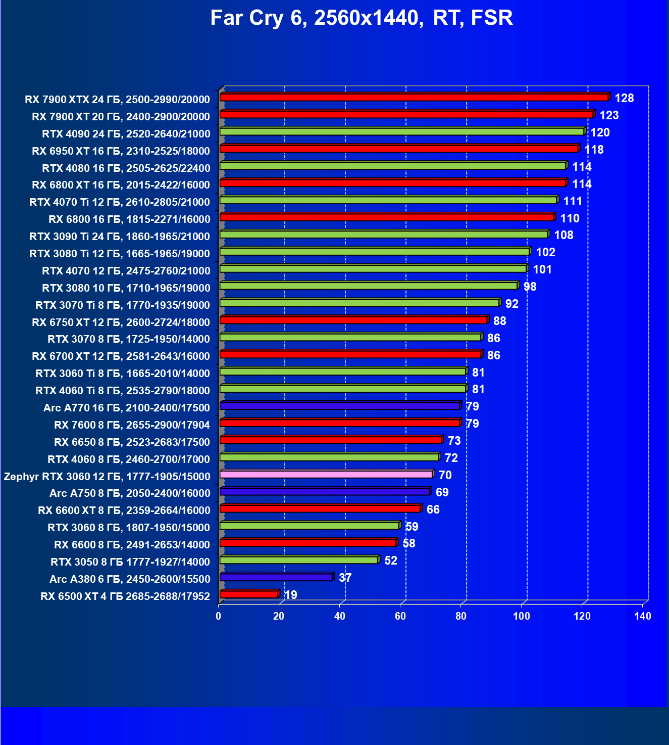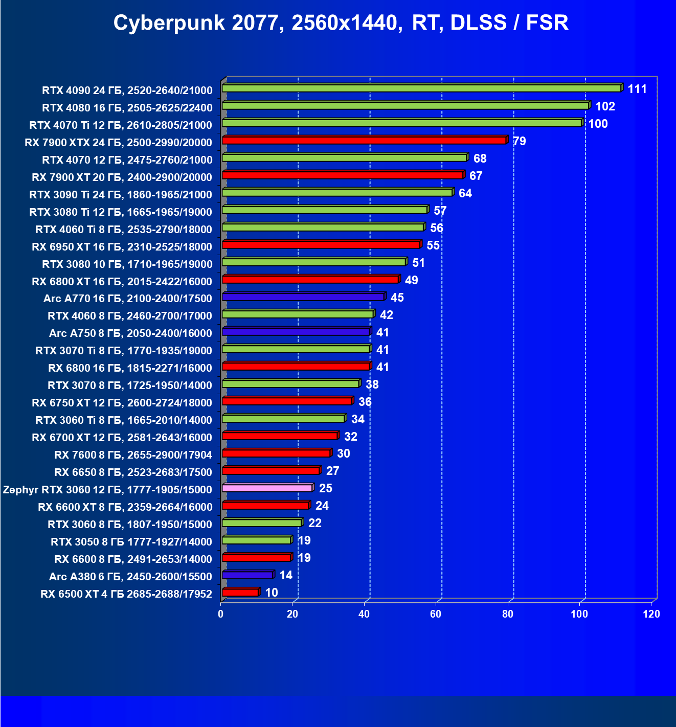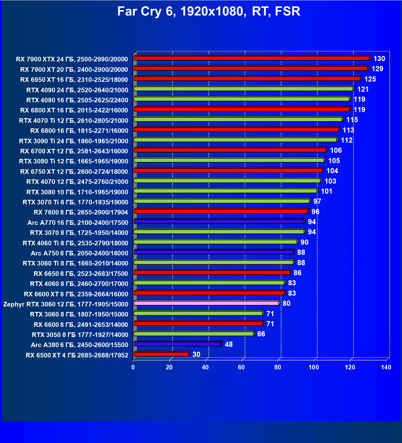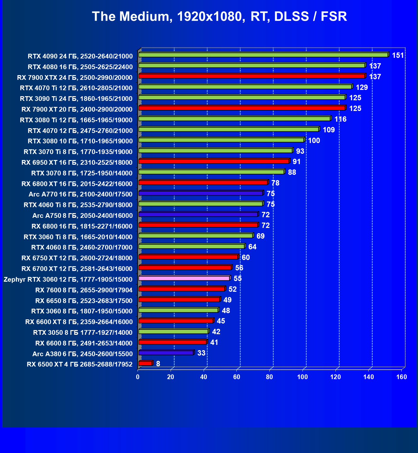 В данном случае у Radeon RX 6600 XT падение производительности из-за включения трассировки лучей более сильное, а включение FSR/XeSS не обеспечило полной компенсации этого падения. Поэтому карта Zephyr обошла соперника и почти догнала более дорогой Radeon RX 6650 XT.