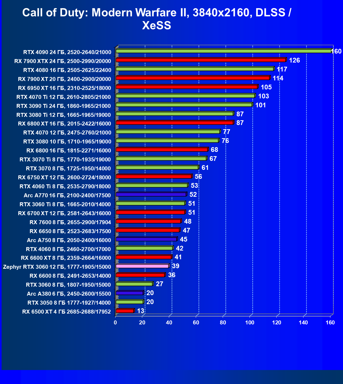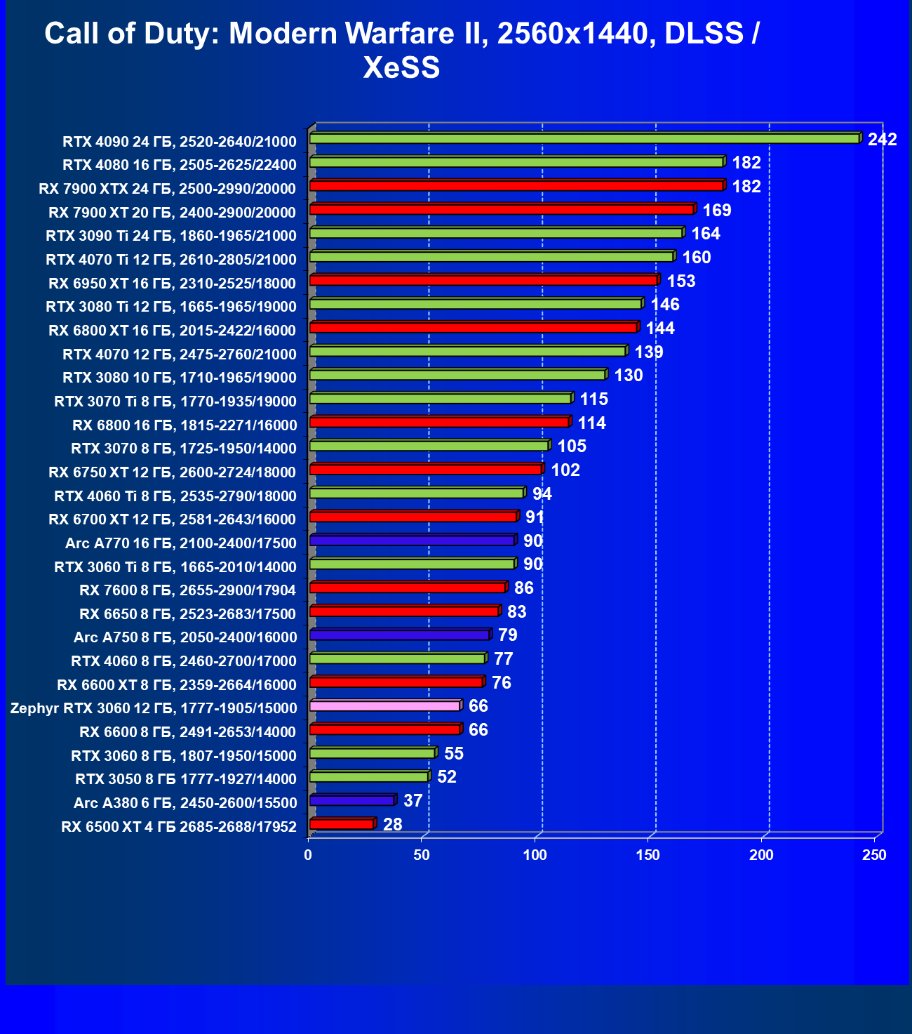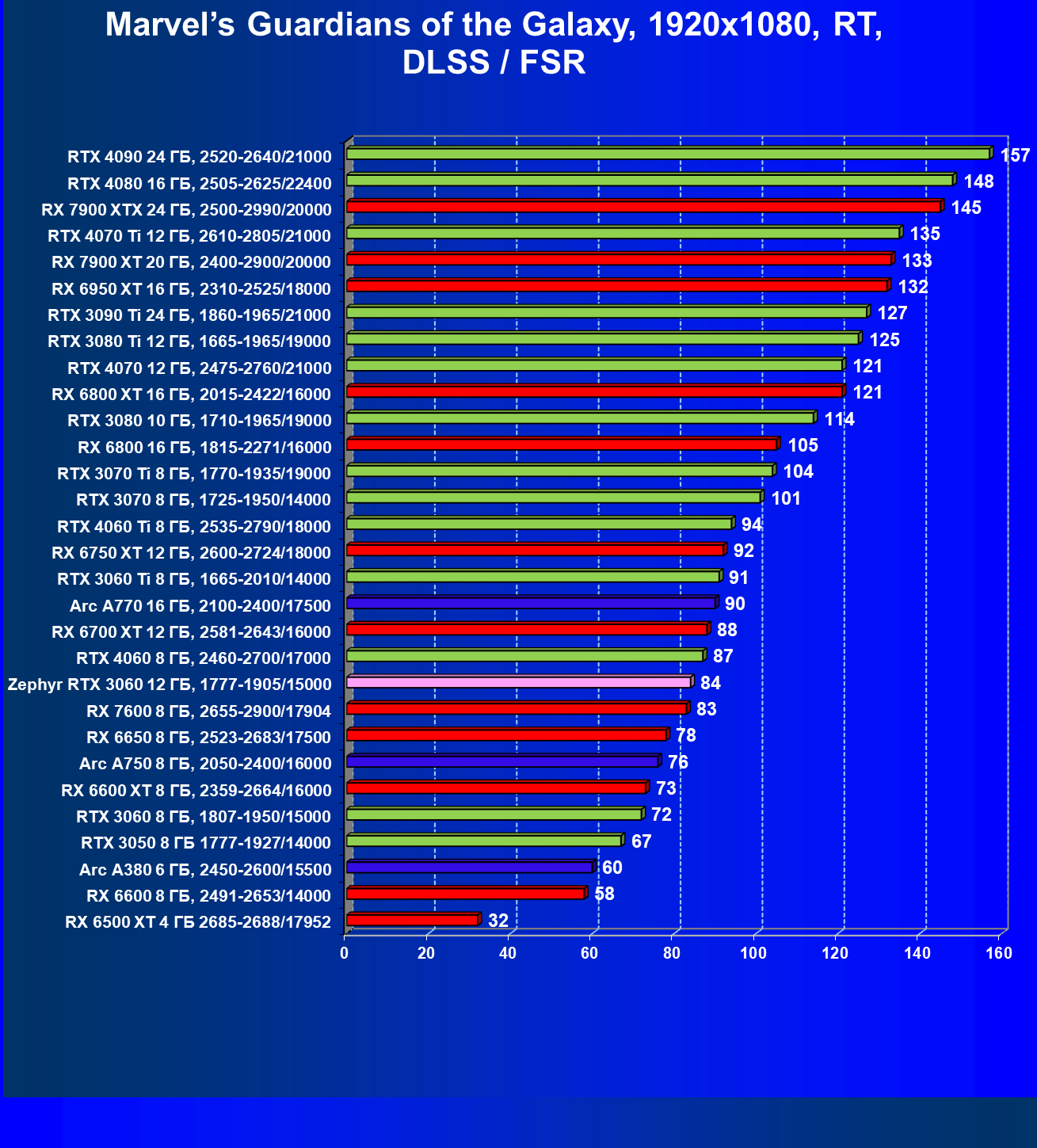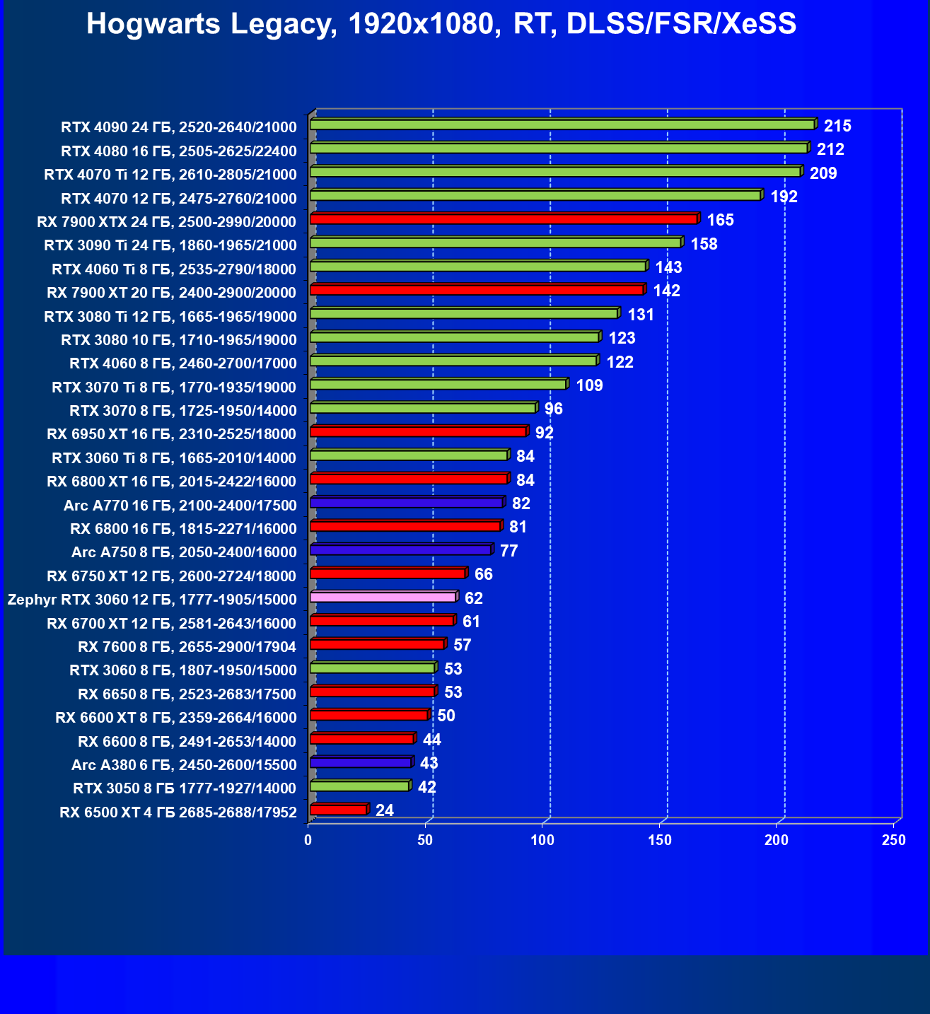 В данном случае у Radeon RX 6600 XT падение производительности из-за включения трассировки лучей более сильное, а включение FSR/XeSS не обеспечило полной компенсации этого падения. Поэтому карта Zephyr обошла соперника и почти догнала более дорогой Radeon RX 6650 XT.