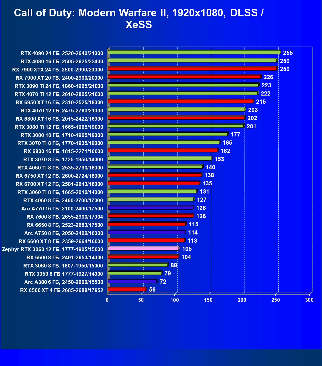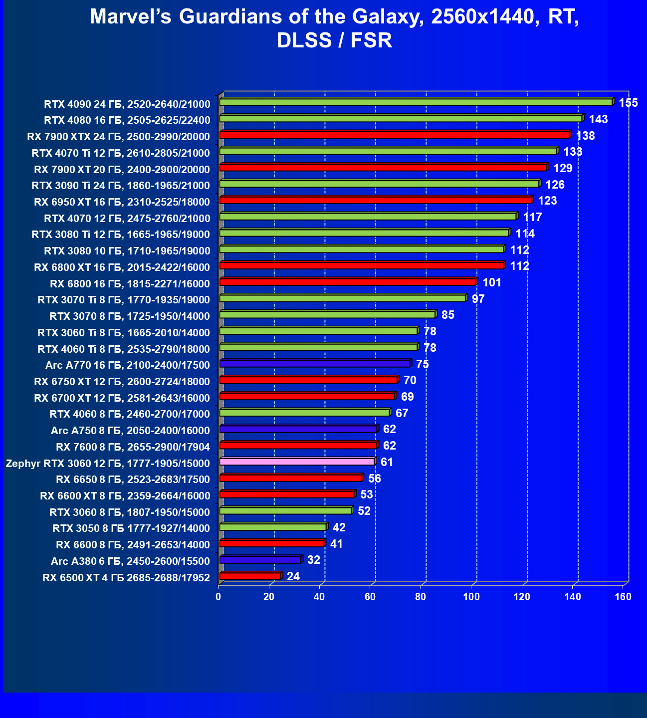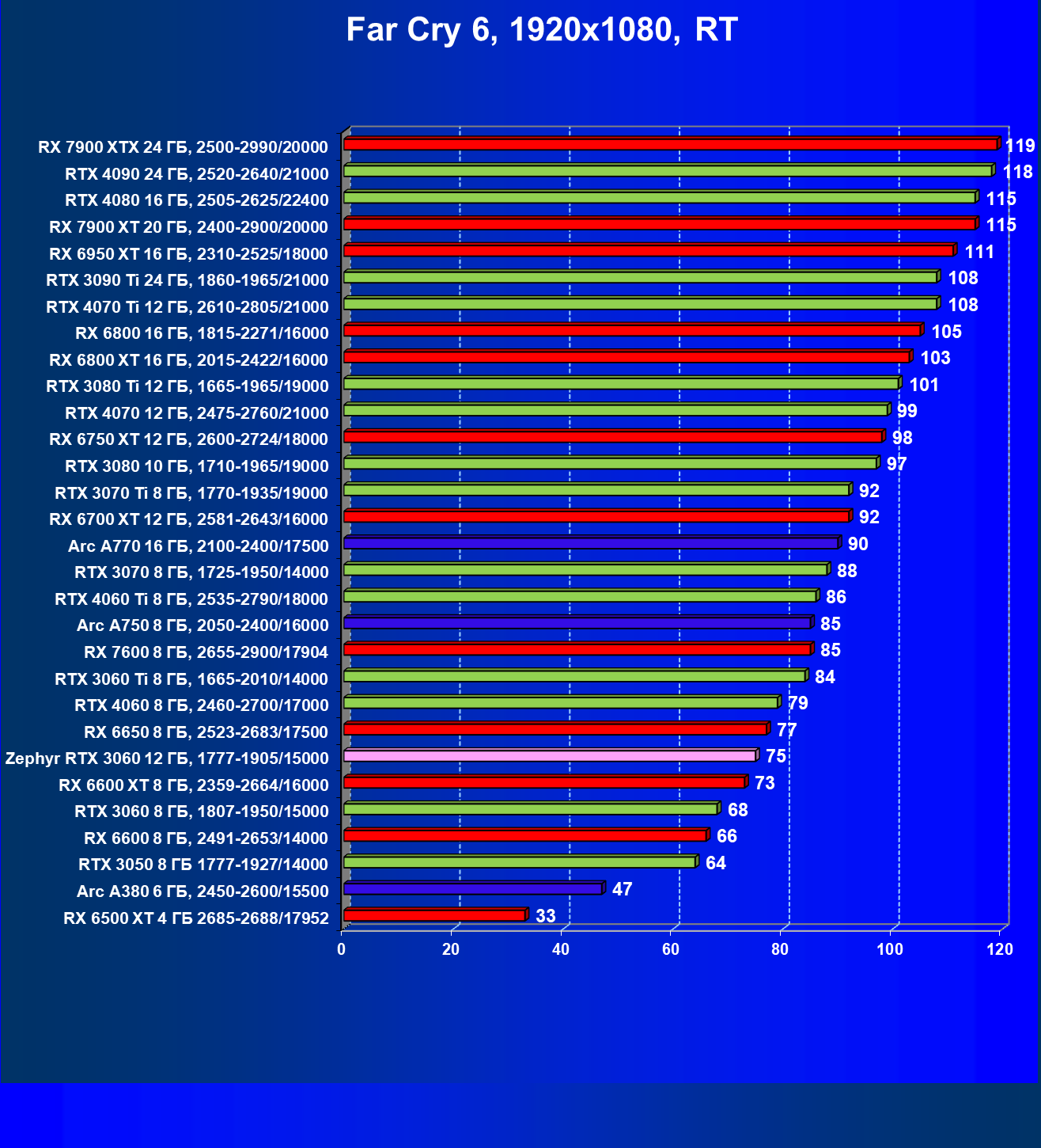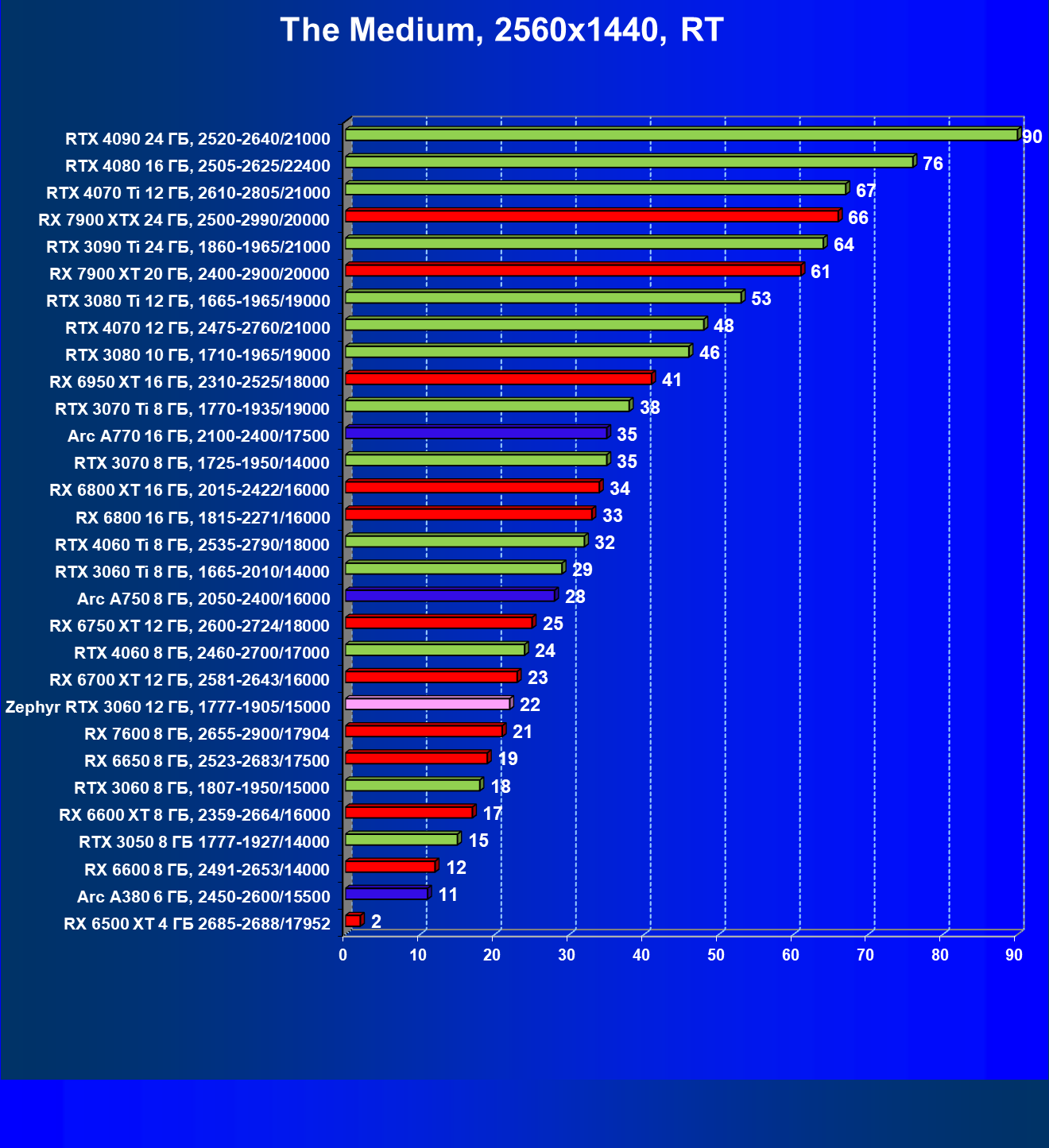 В данном случае у Radeon RX 6600 XT падение производительности из-за включения трассировки лучей более сильное, а включение FSR/XeSS не обеспечило полной компенсации этого падения. Поэтому карта Zephyr обошла соперника и почти догнала более дорогой Radeon RX 6650 XT.