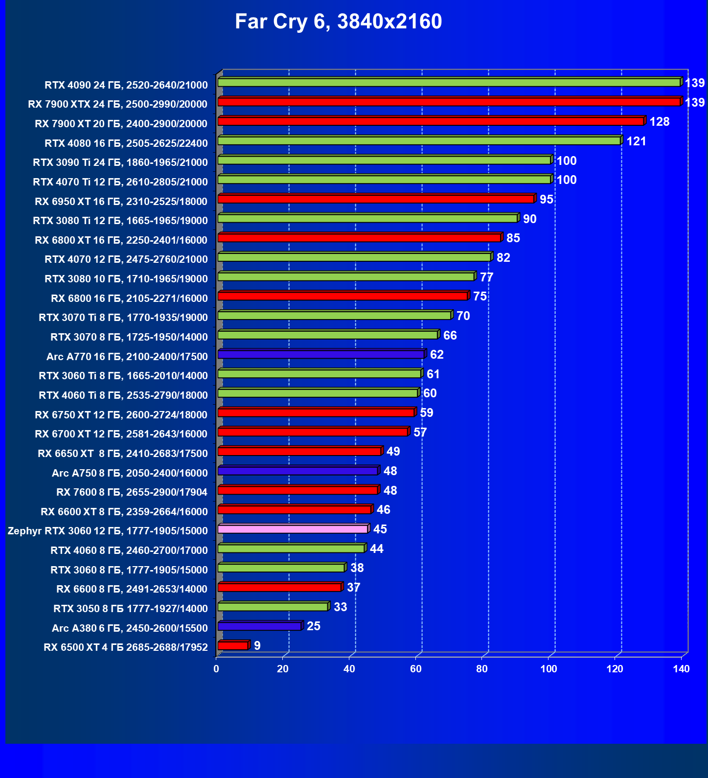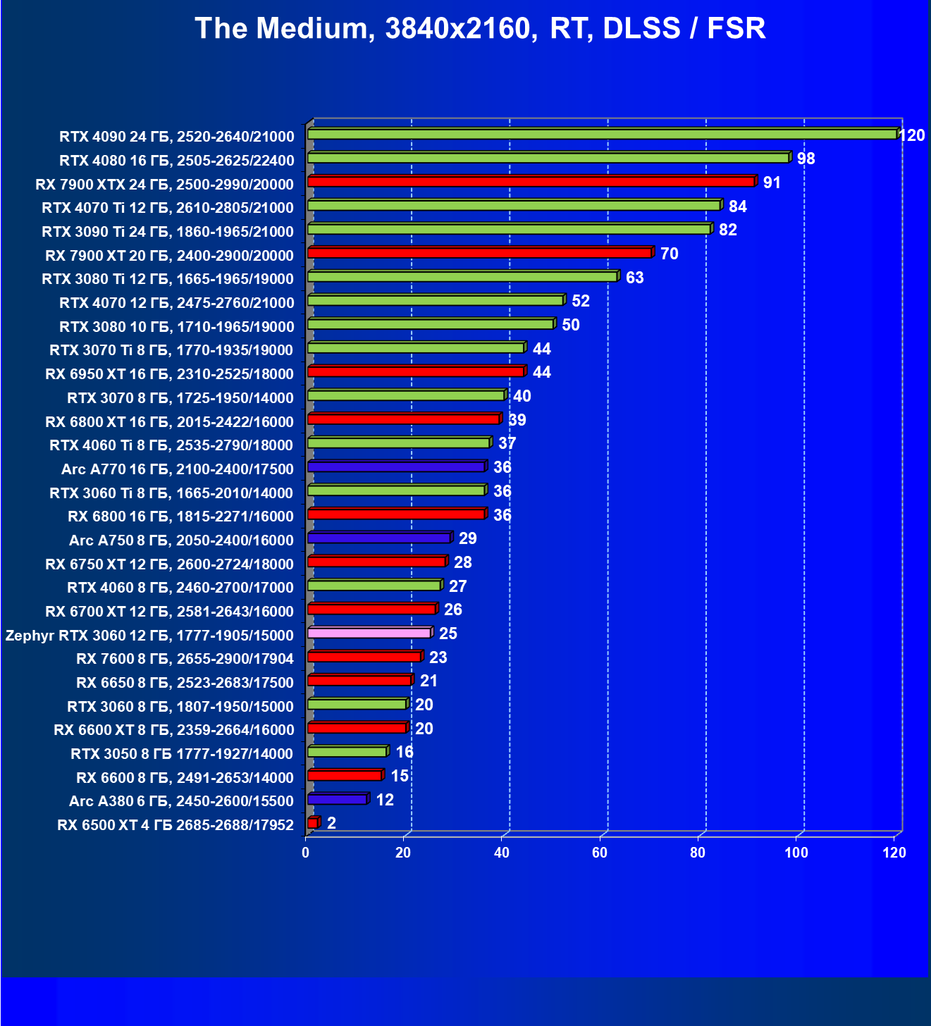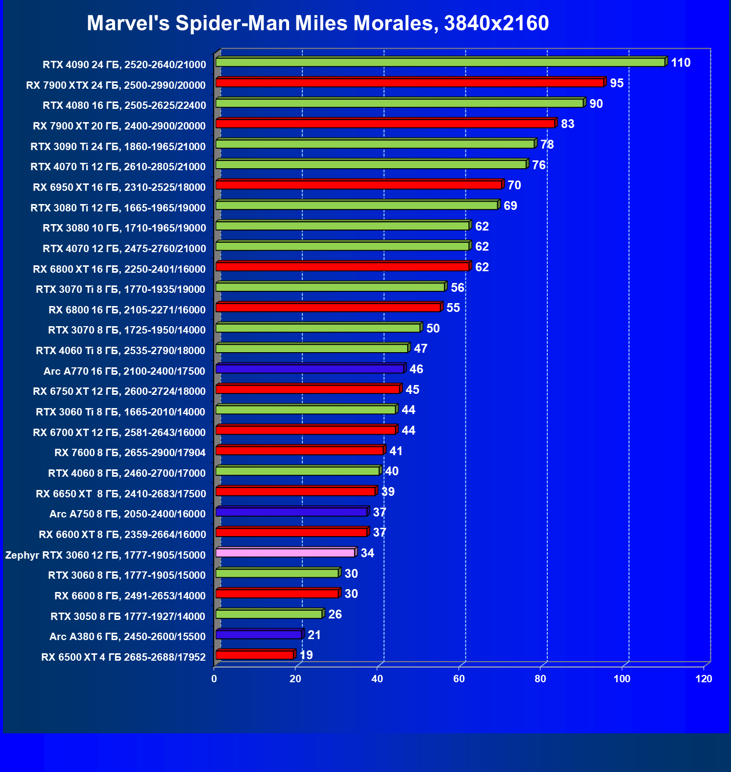 | 21 | Arc A750 8 ГБ, 2050—2400/16000 | 396 | 113 | 35 000 |