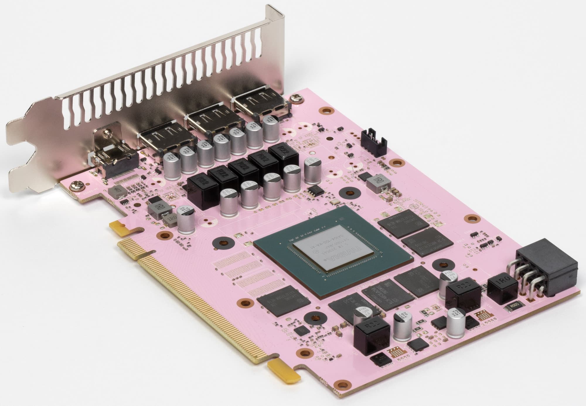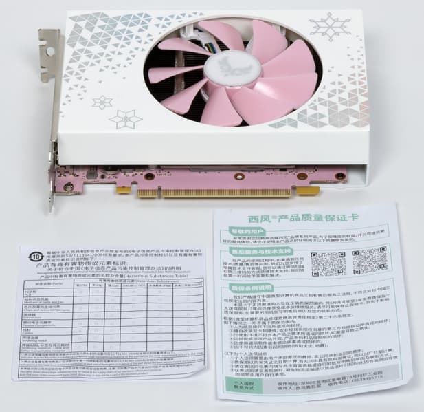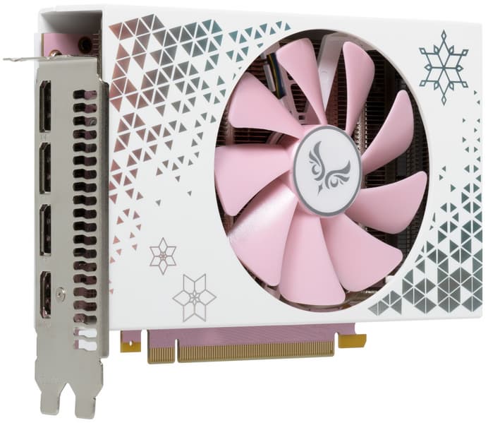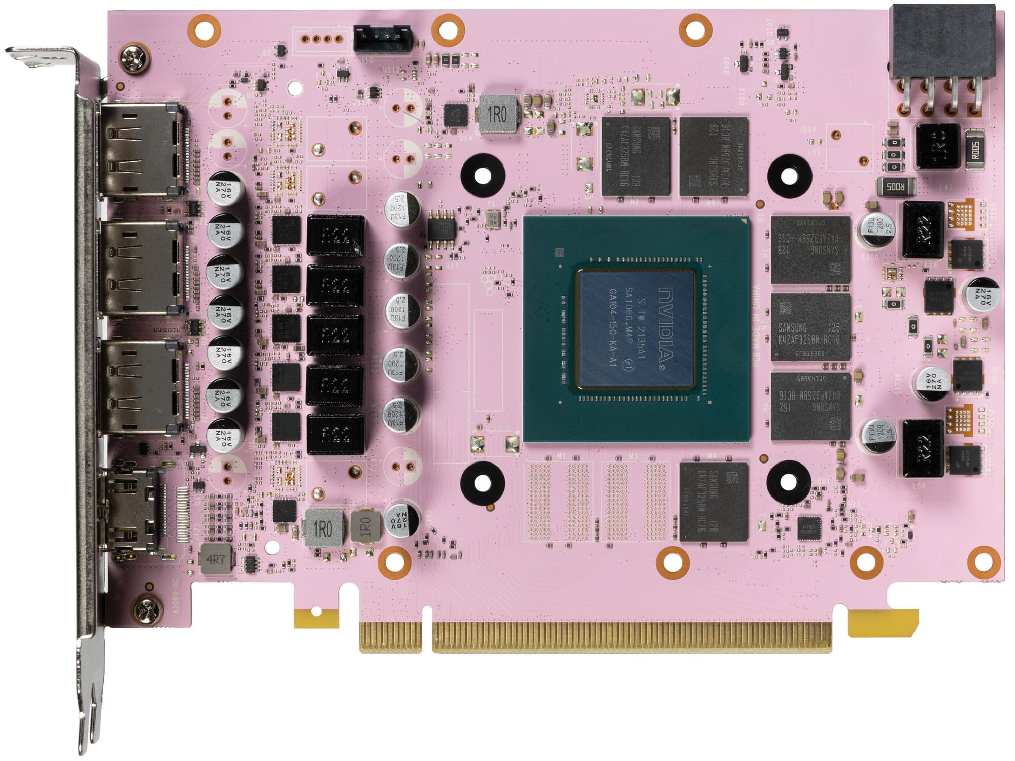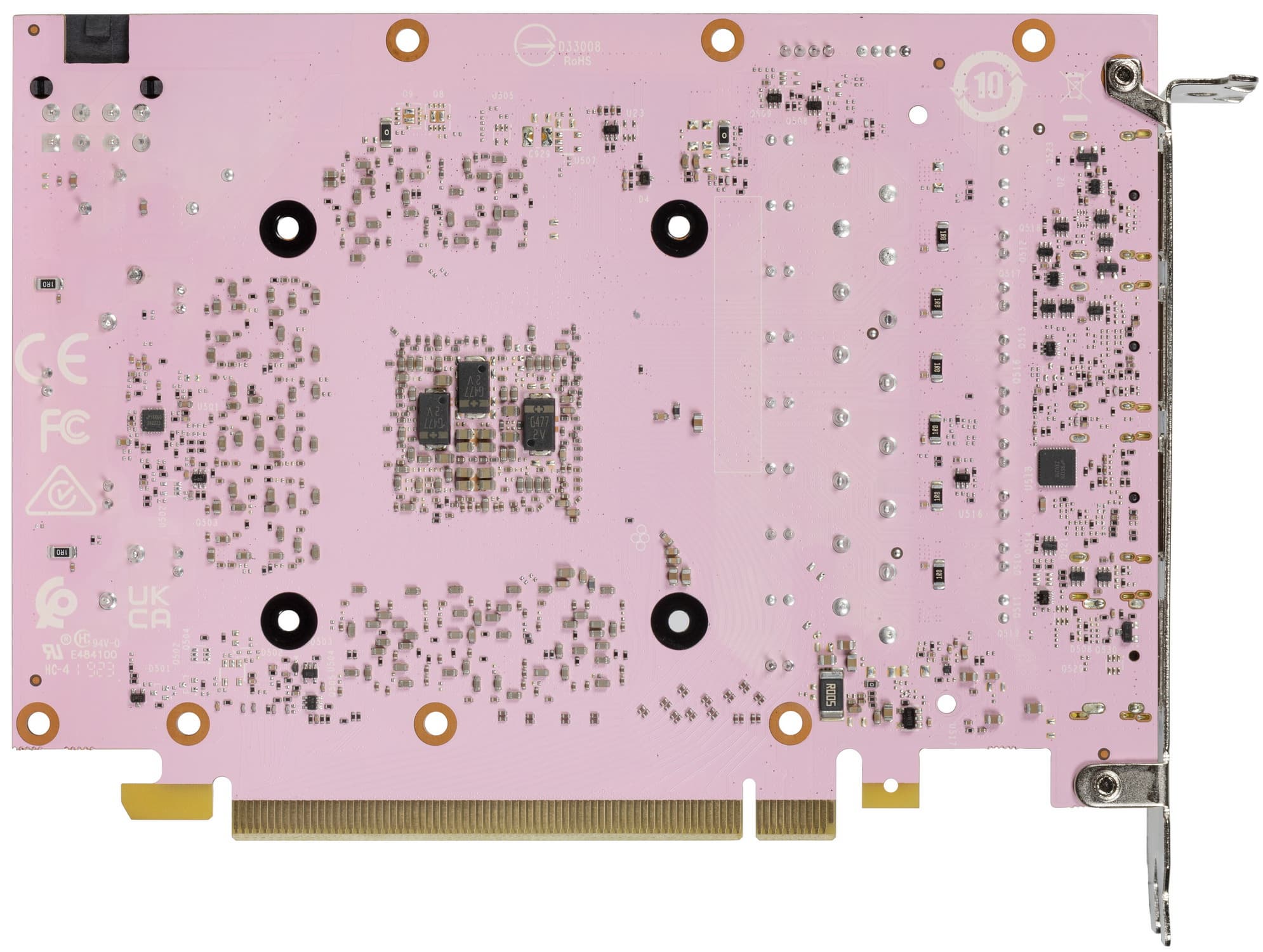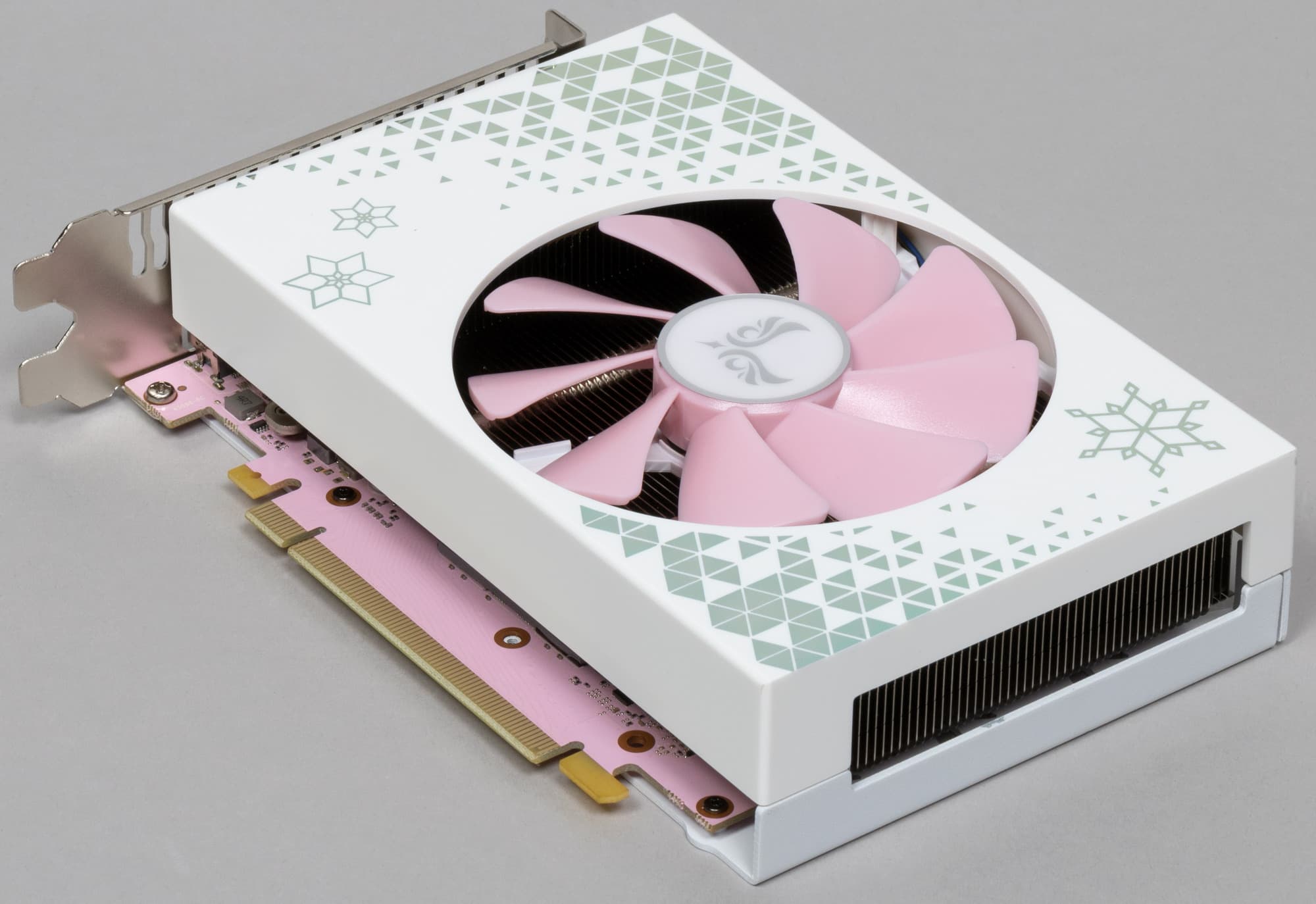 Уникальность расцветки еще и в том, что это первая виденная мною карта с розовой печатной платой. Белые, синие, зеленые, желтые, коричневые, красные — этого сколько угодно. Сейчас сплошь и рядом видеокарты с черными PCB. А вот розовых не было до сего момента.