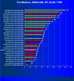Рейтинг составлен по 9 тестам, в которых используется технология трассировки лучей и одновременно технология Nvidia DLSS, AMD FSR или Intel XeSS. Этот рейтинг нормирован по самому слабому ускорителю в данной группе — Radeon RX 6500 XT (то есть сочетание скорости и функций Radeon RX 6500 XT приняты за 100%).