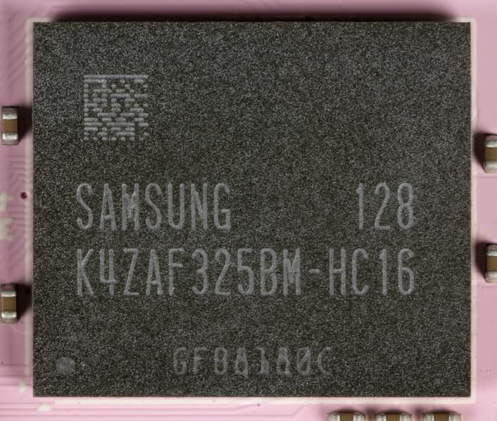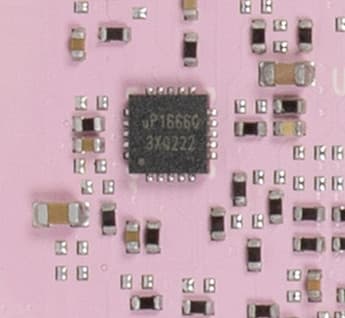 А контроллер uP1666Q управляет двумя фазами питания микросхем памяти. Оба контроллера расположены на обороте печатной платы.