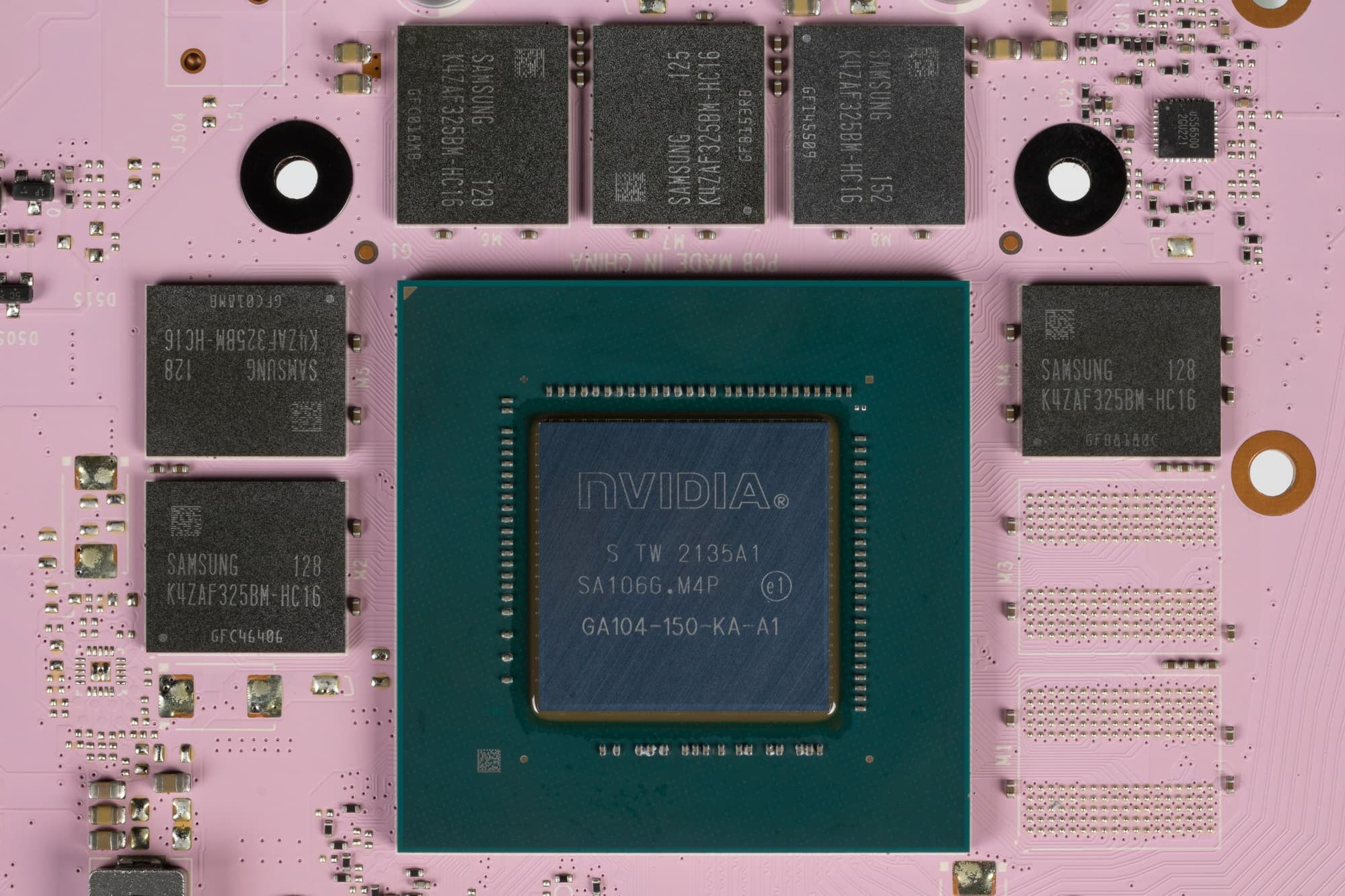 То есть у нашей карты выявилась еще одна уникальность: на ней установлено ядро от GeForce RTX 3070/3060 Ti, которое урезано по блокам до значений GeForce RTX 3060. Nvidia выпускала такие ядра официально, маркировка «-150» говорит как раз об этом (у GeForce RTX 3060 Ti — «-200/202», у GeForce RTX 3070 — «-300/302»).