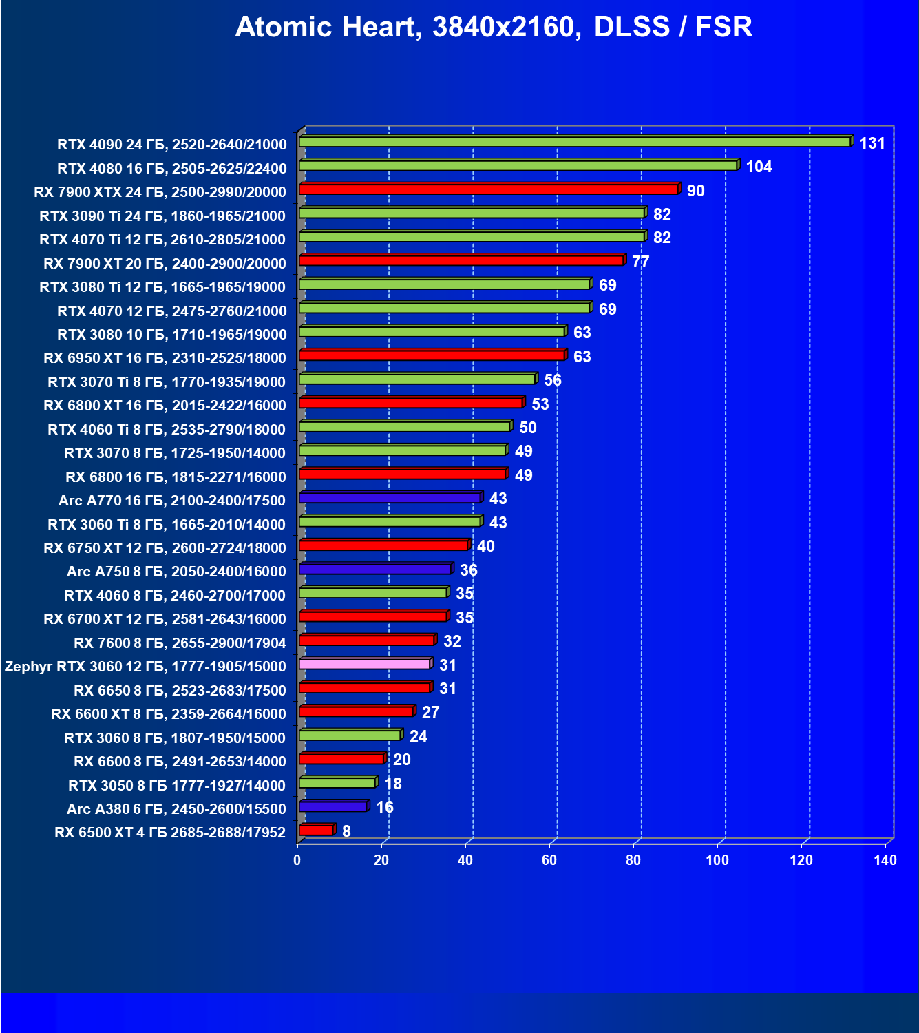 - Результаты тестов со включенной аппаратной трассировкой лучей и/или DLSS/FSR/XeSS в разрешениях 1920×1080, 2560×1440 и 3840×2160
