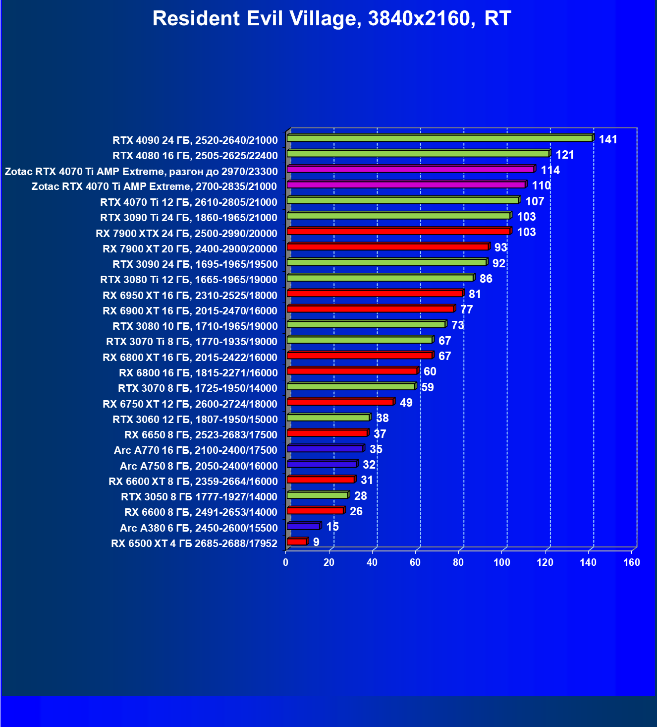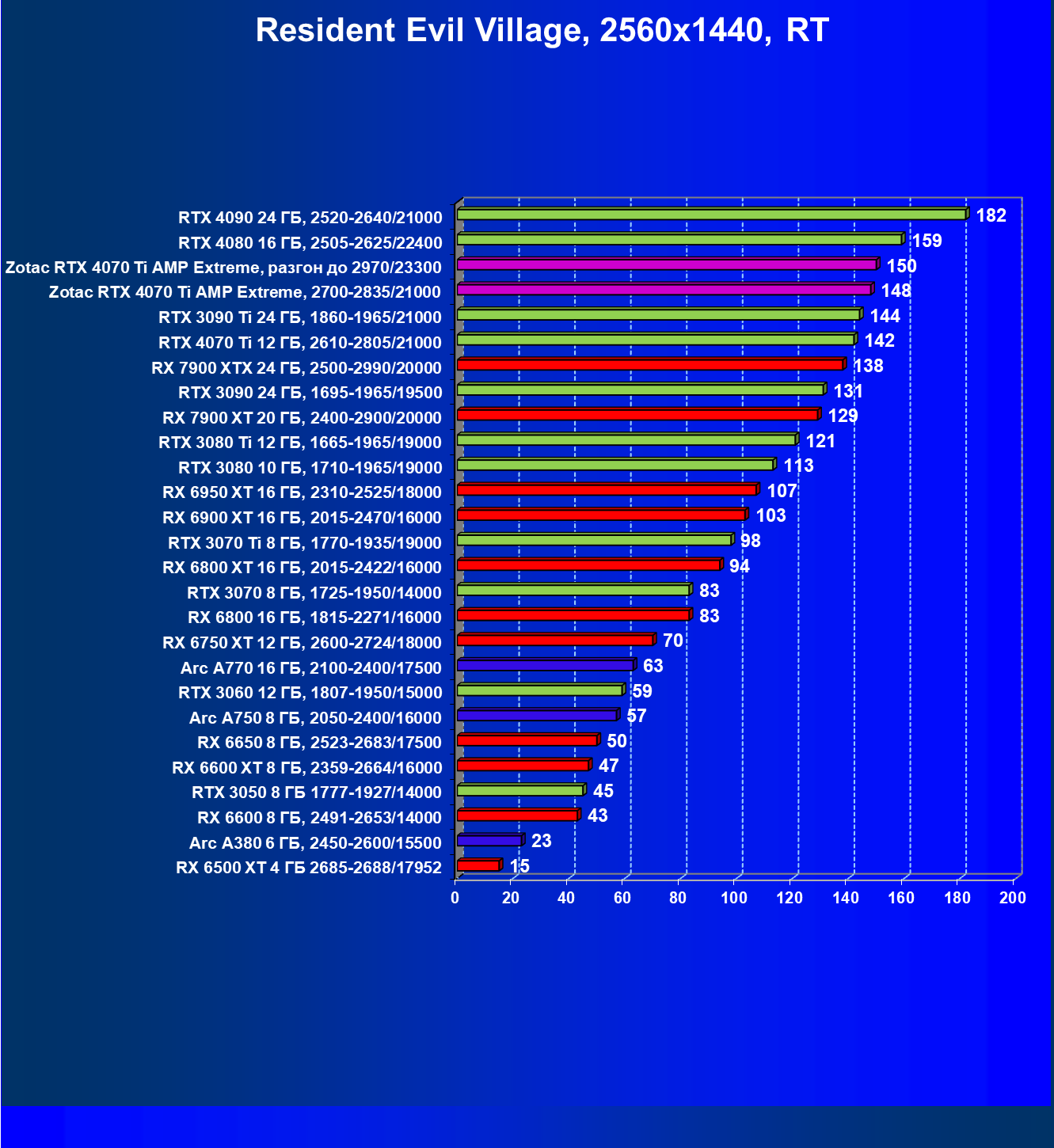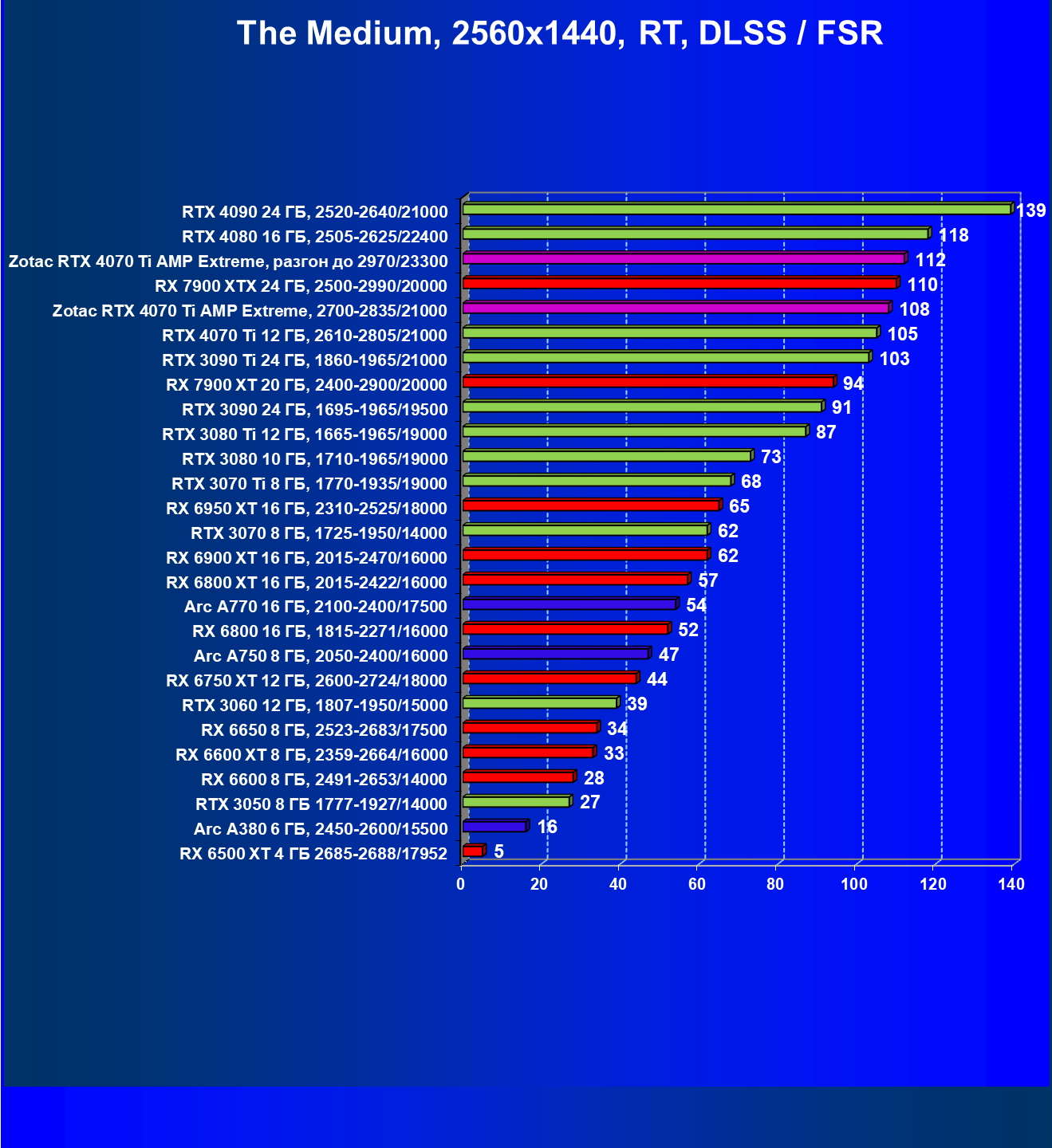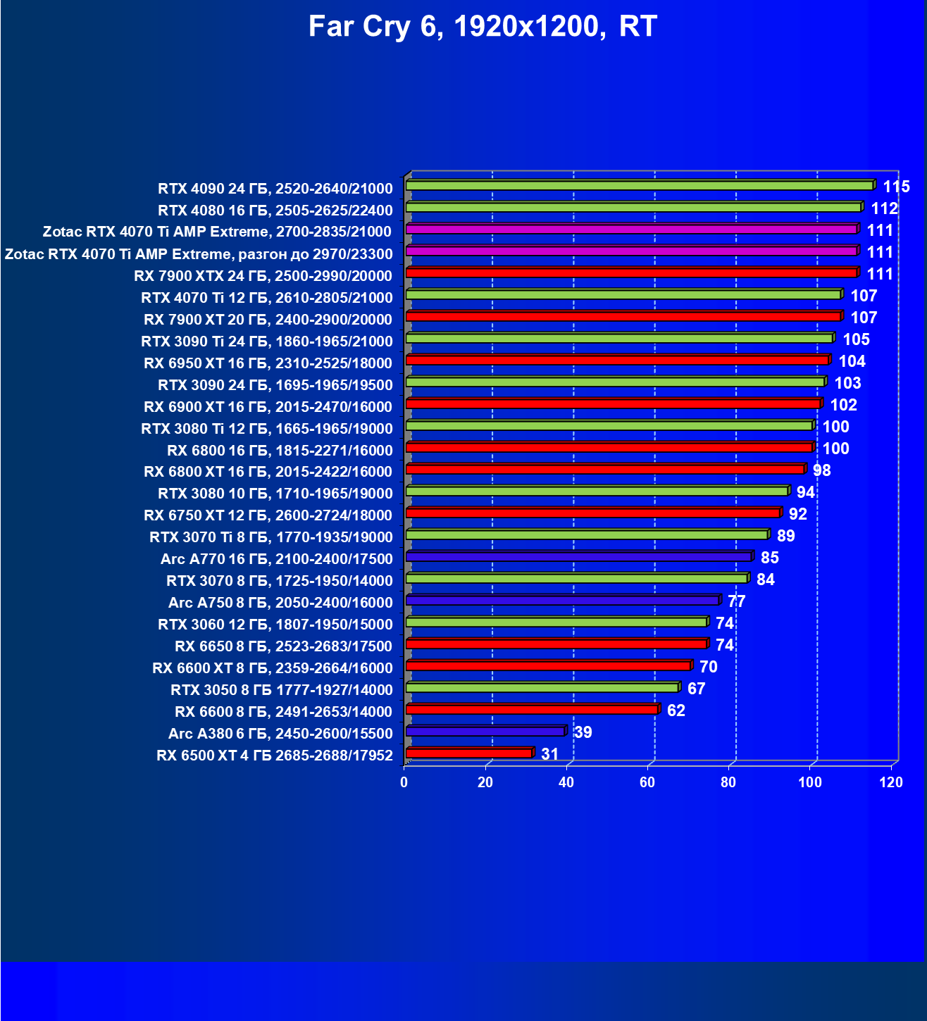 Падение FPS от активации рейтрейсинга до сих пор более ощутимо на решениях от AMD, поэтому в играх с RT (и DLSS) карта Zotac засчет фабричного разгона смогла догнать даже флагман AMD — Radeon RX 7900 XTX, который существенно дороже, когда как референс-аналог RTX 4070 Ti все же уступает лидеру из стана «красных».