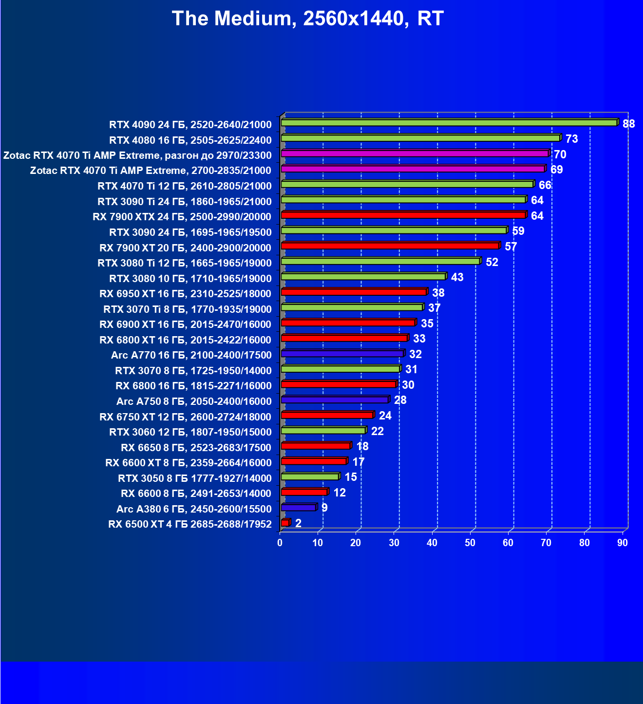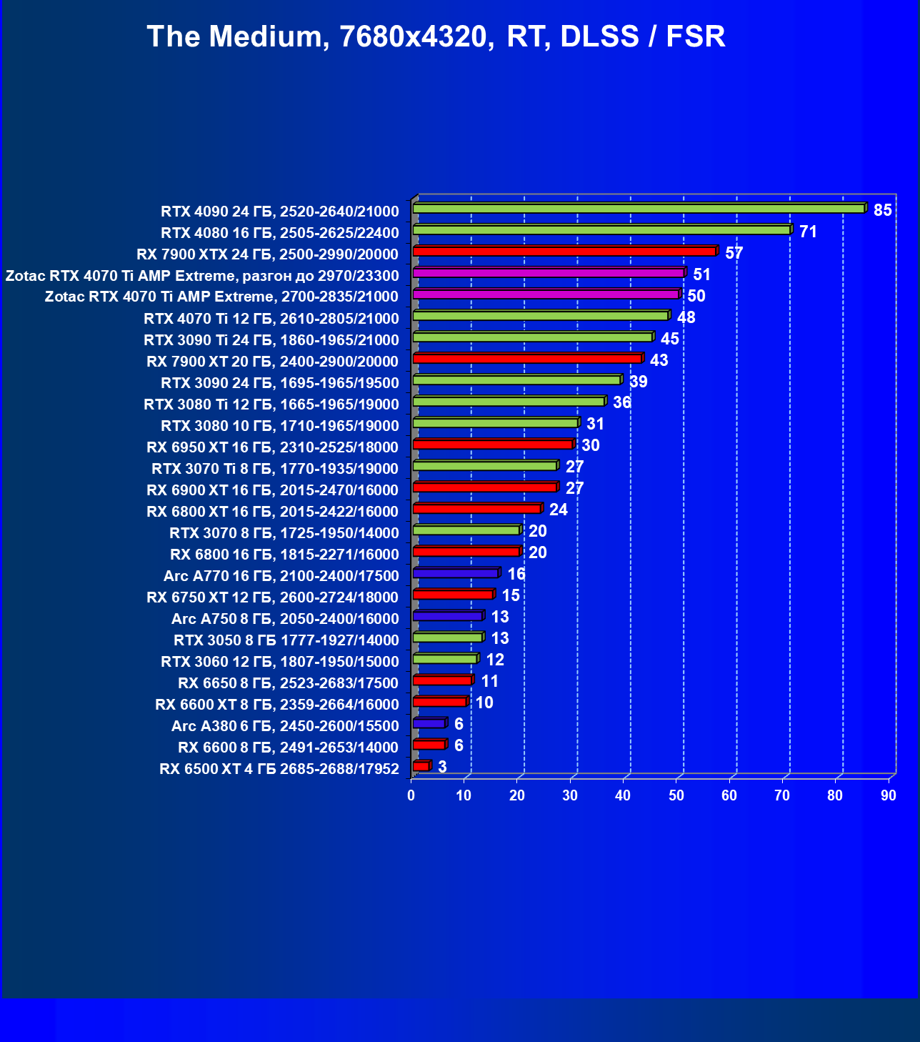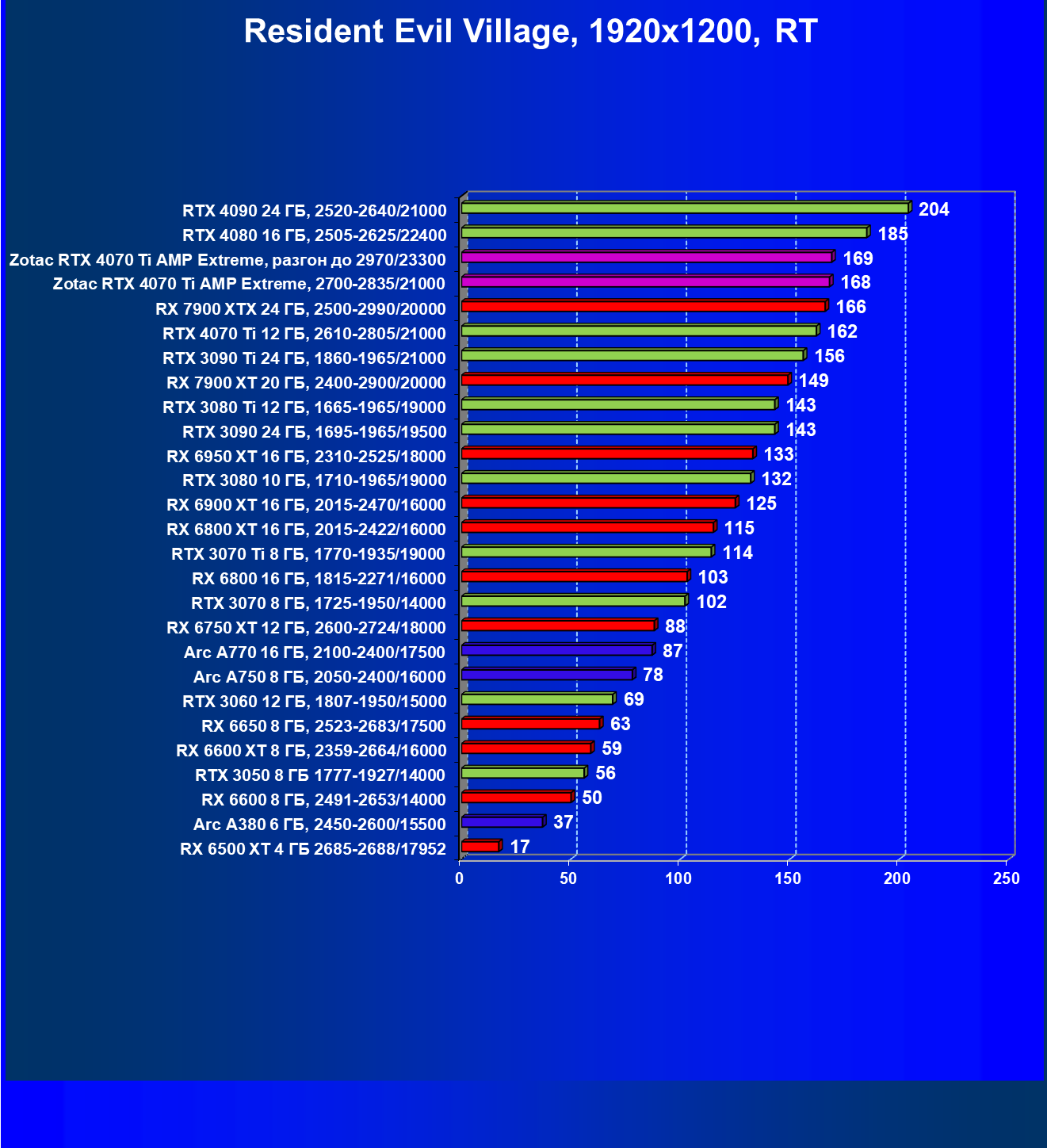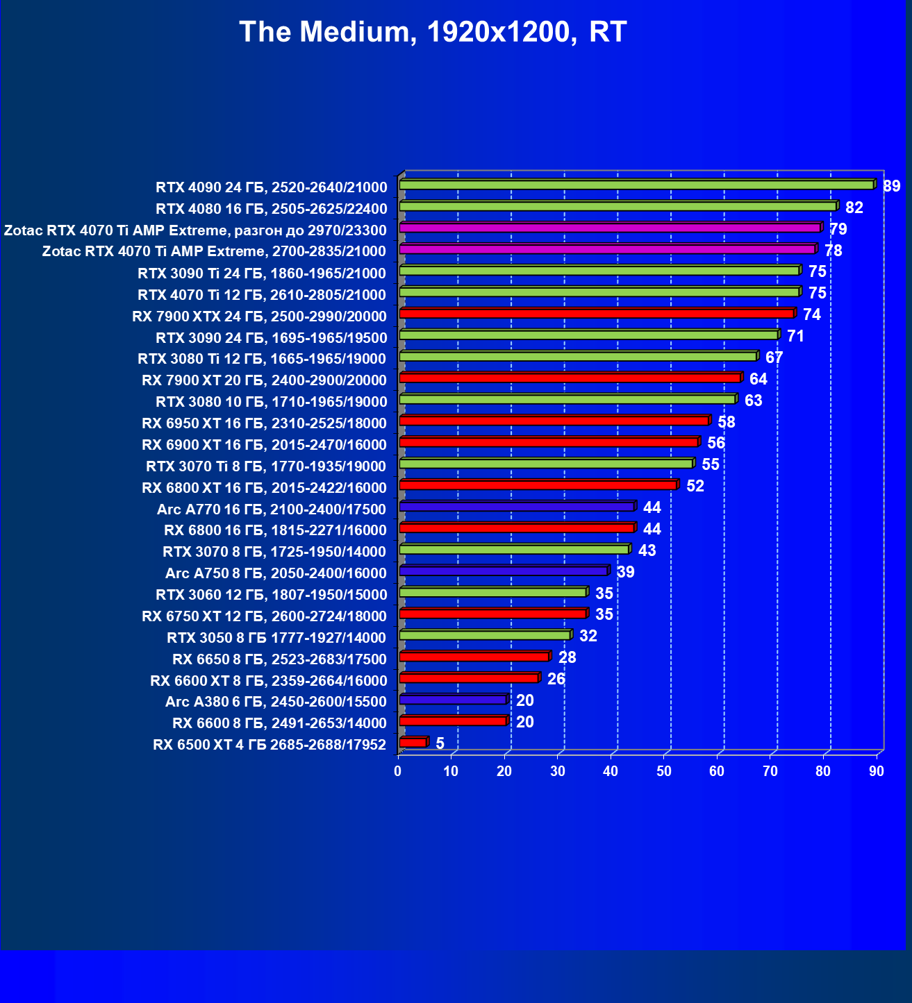 Падение FPS от активации рейтрейсинга до сих пор более ощутимо на решениях от AMD, поэтому в играх с RT (и DLSS) карта Zotac засчет фабричного разгона смогла догнать даже флагман AMD — Radeon RX 7900 XTX, который существенно дороже, когда как референс-аналог RTX 4070 Ti все же уступает лидеру из стана «красных».
