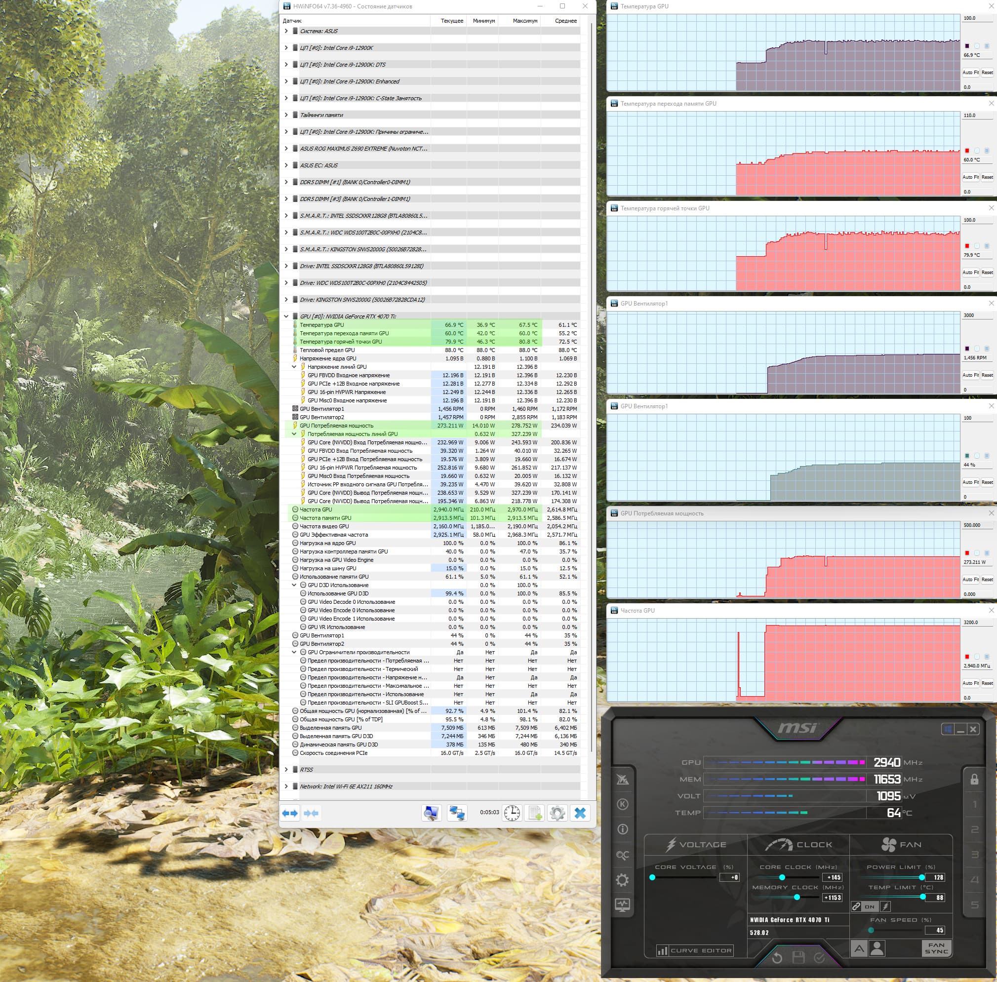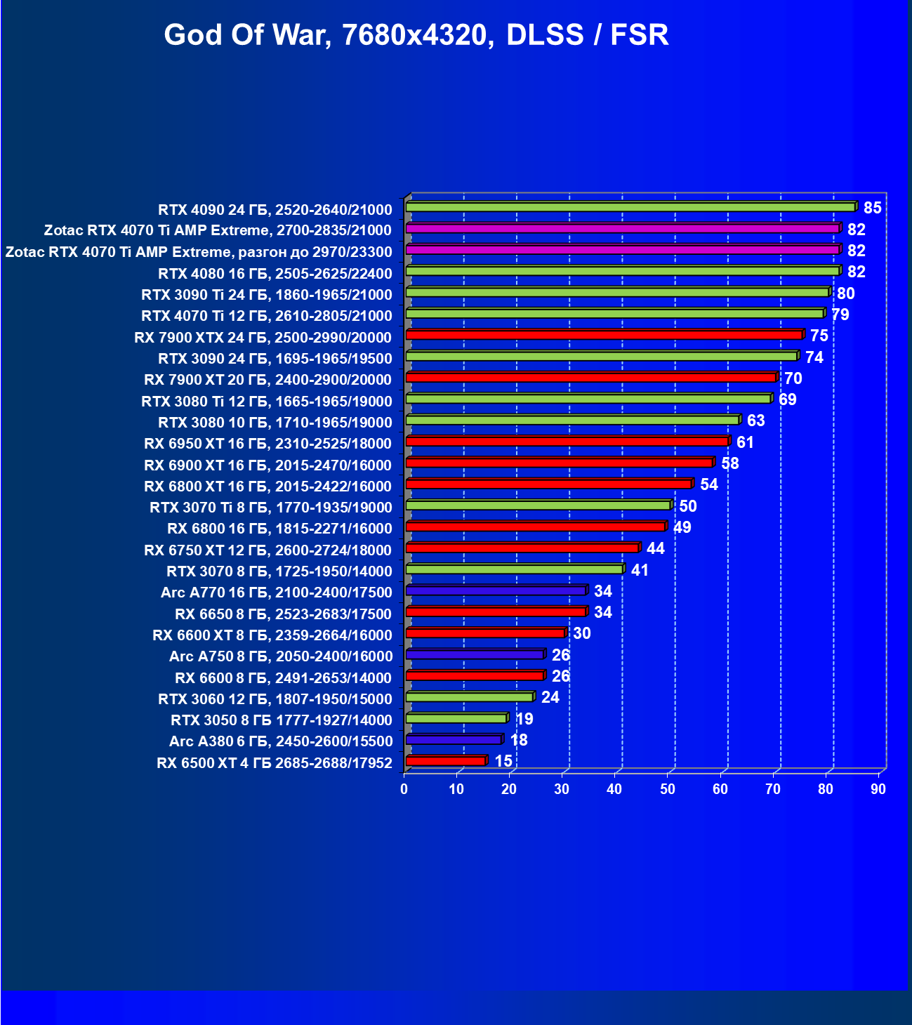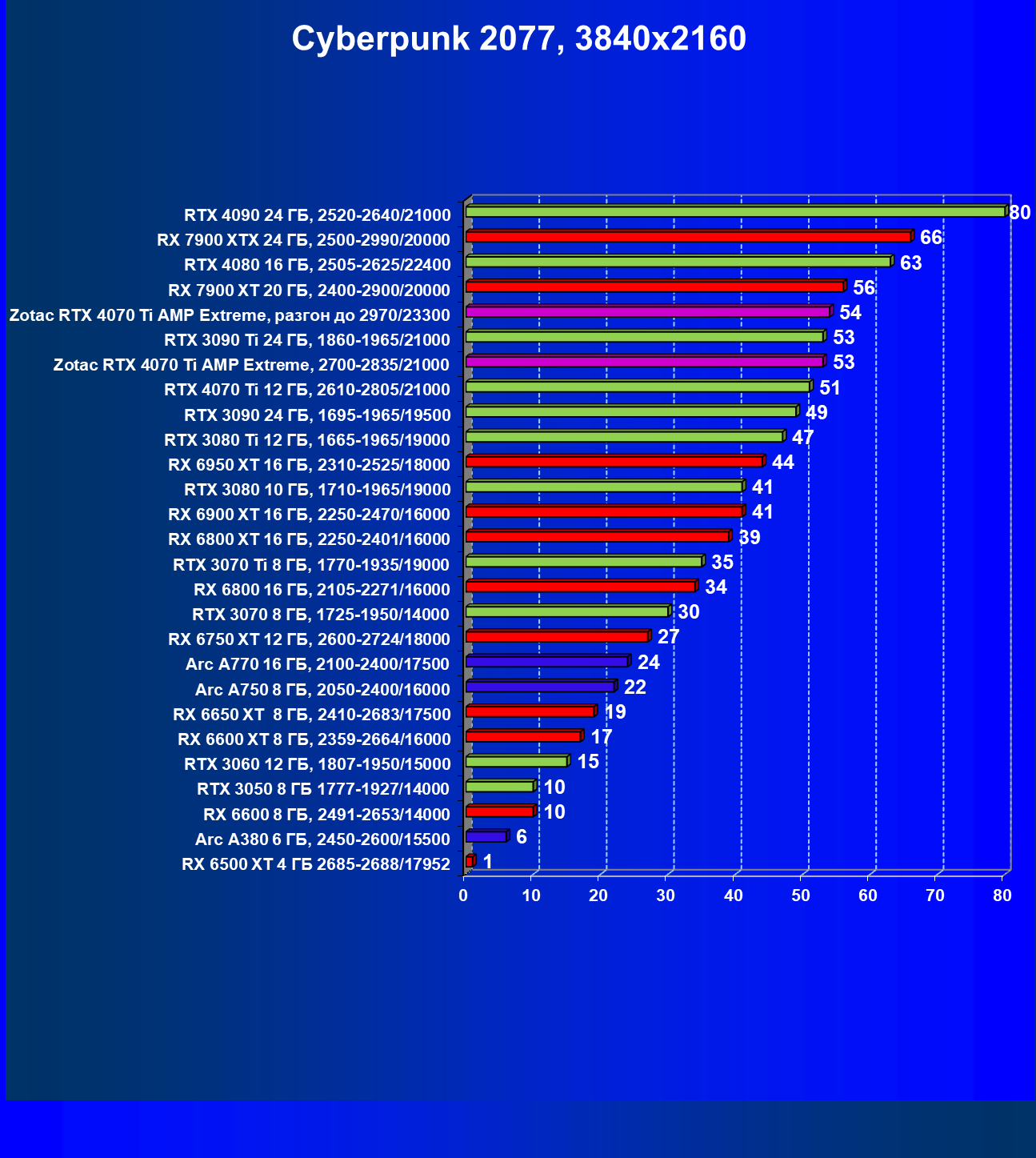 | 04 | Zotac RTX 4070 Ti Amp Extreme, разгон до 2970/23300 | 500 | 61 | 82 000 |