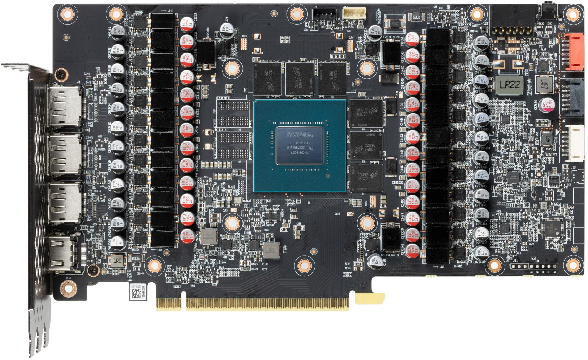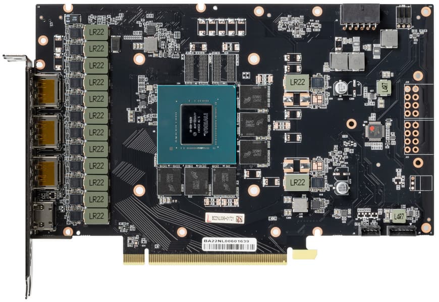Карта имеет 12 ГБ памяти GDDR6X SDRAM, размещенной в 6 микросхемах по 16 Гбит на лицевой стороне PCB. Микросхемы памяти Micron (GDDR6X, MT61K512M32KPA-21 / D8BZC) рассчитаны на номинальную частоту работы в 2625 (21000) МГц.