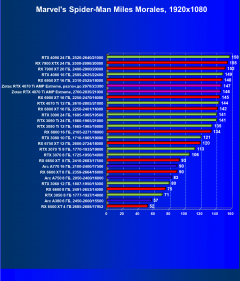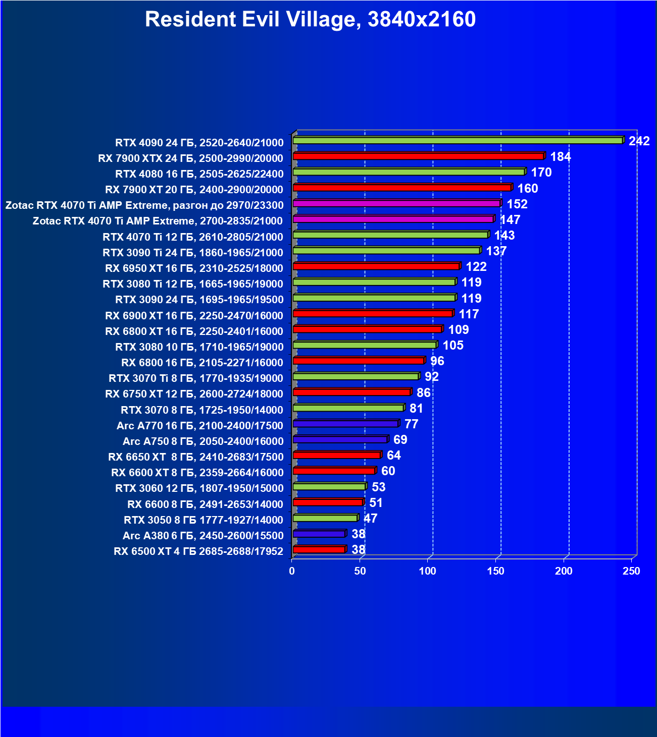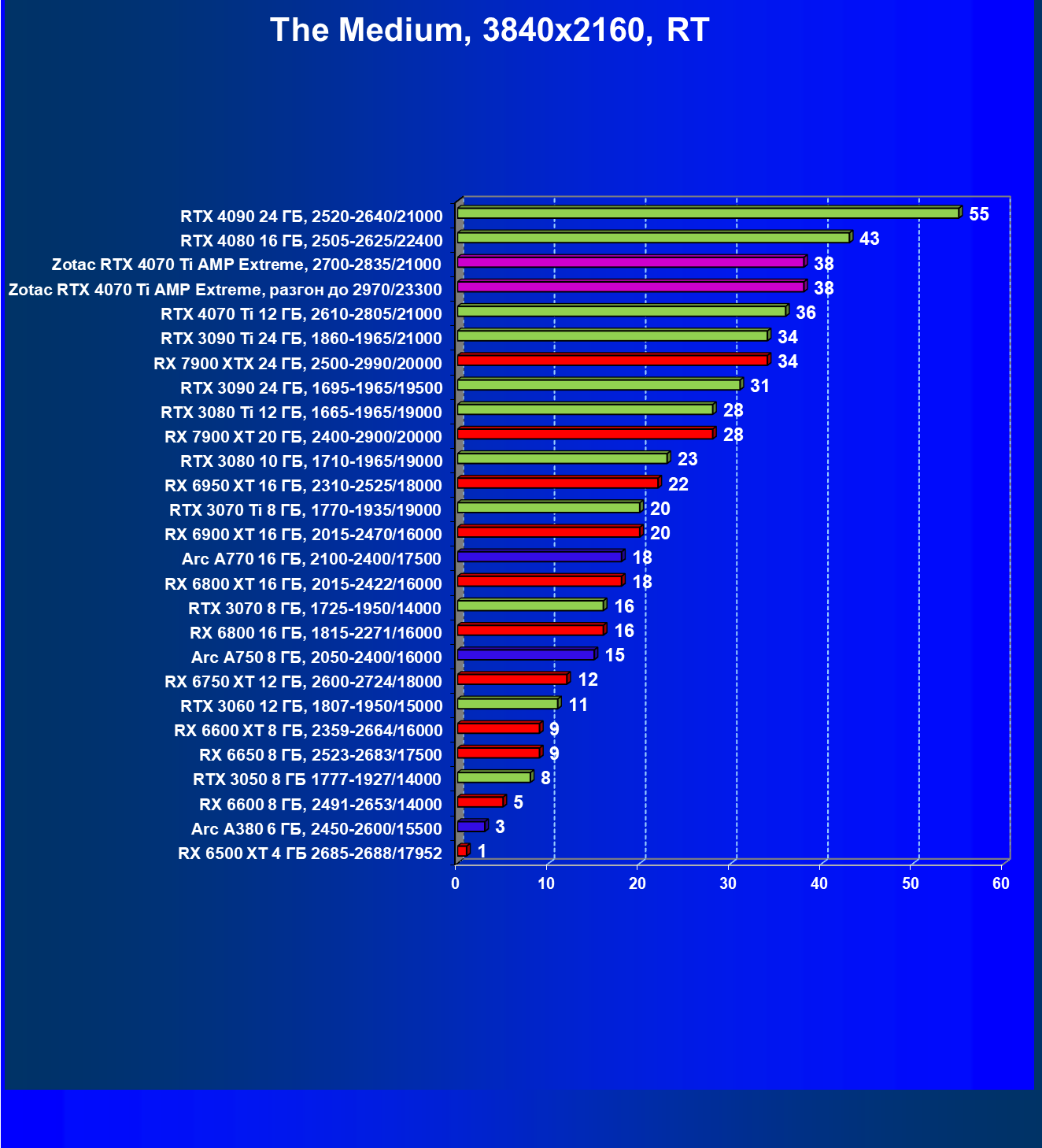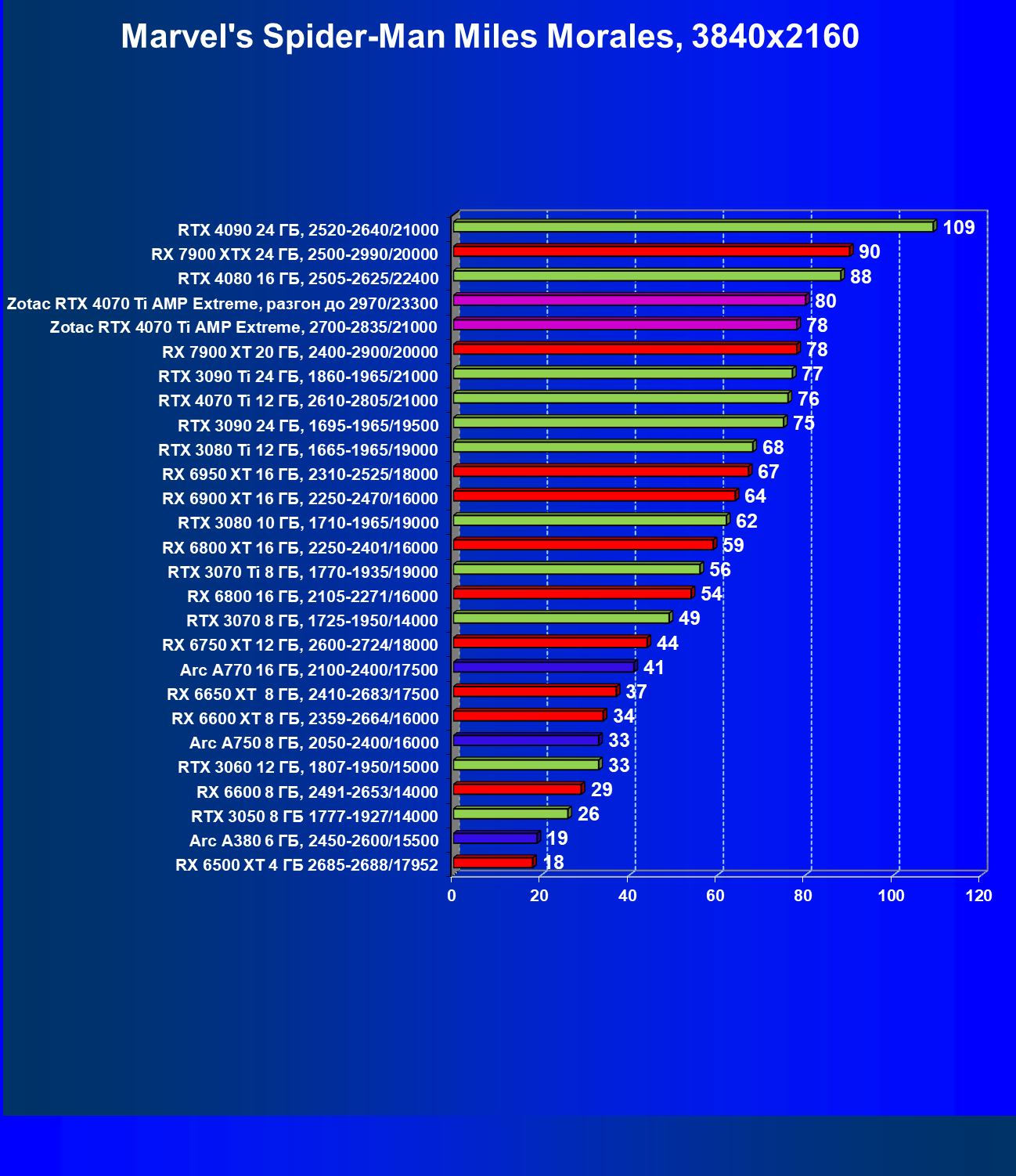 Я думаю, что диаграмма выше всё прекрасно демонстрирует: даже в разрешении 4K во многих играх общая производительность ограничивается уже не видеокартой, а другими компонентами системы, чаще всего упирается в возможности центрального процессора. Что касается карты Zotac, то она явно входит в пятерку-шестерку лидеров, и этой карте по плечу любое из представленных выше разрешений при условии игры с максимальными настройками графики (но без рейтрейсинга и/или DLSS/FSR/XeSS).