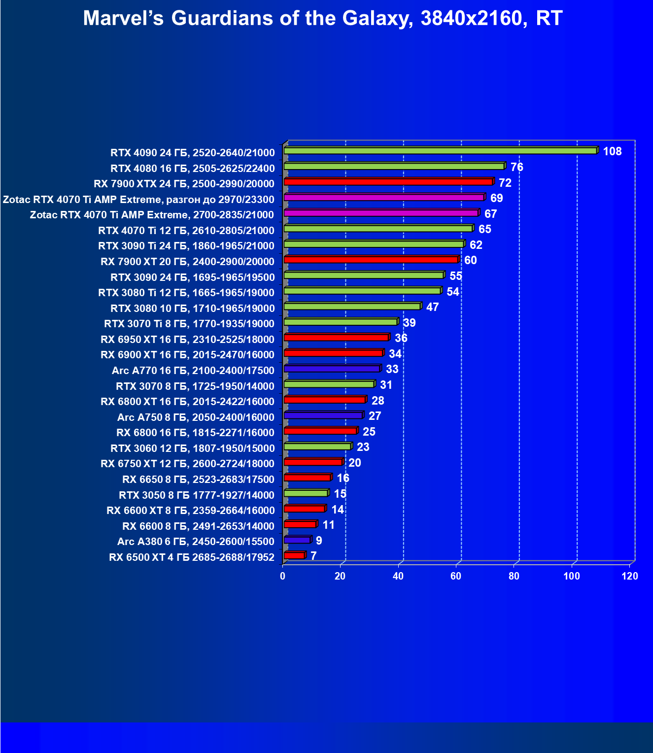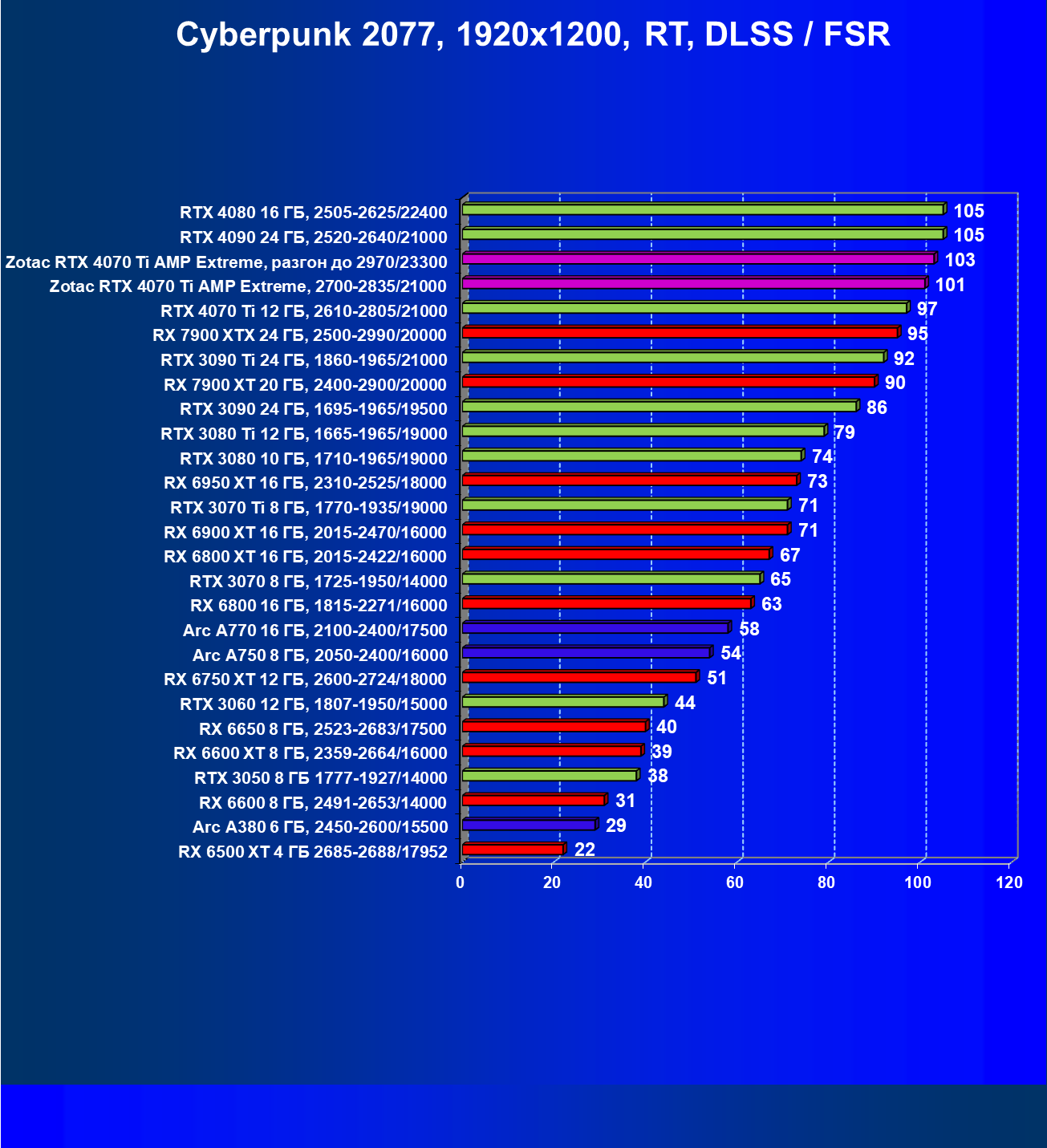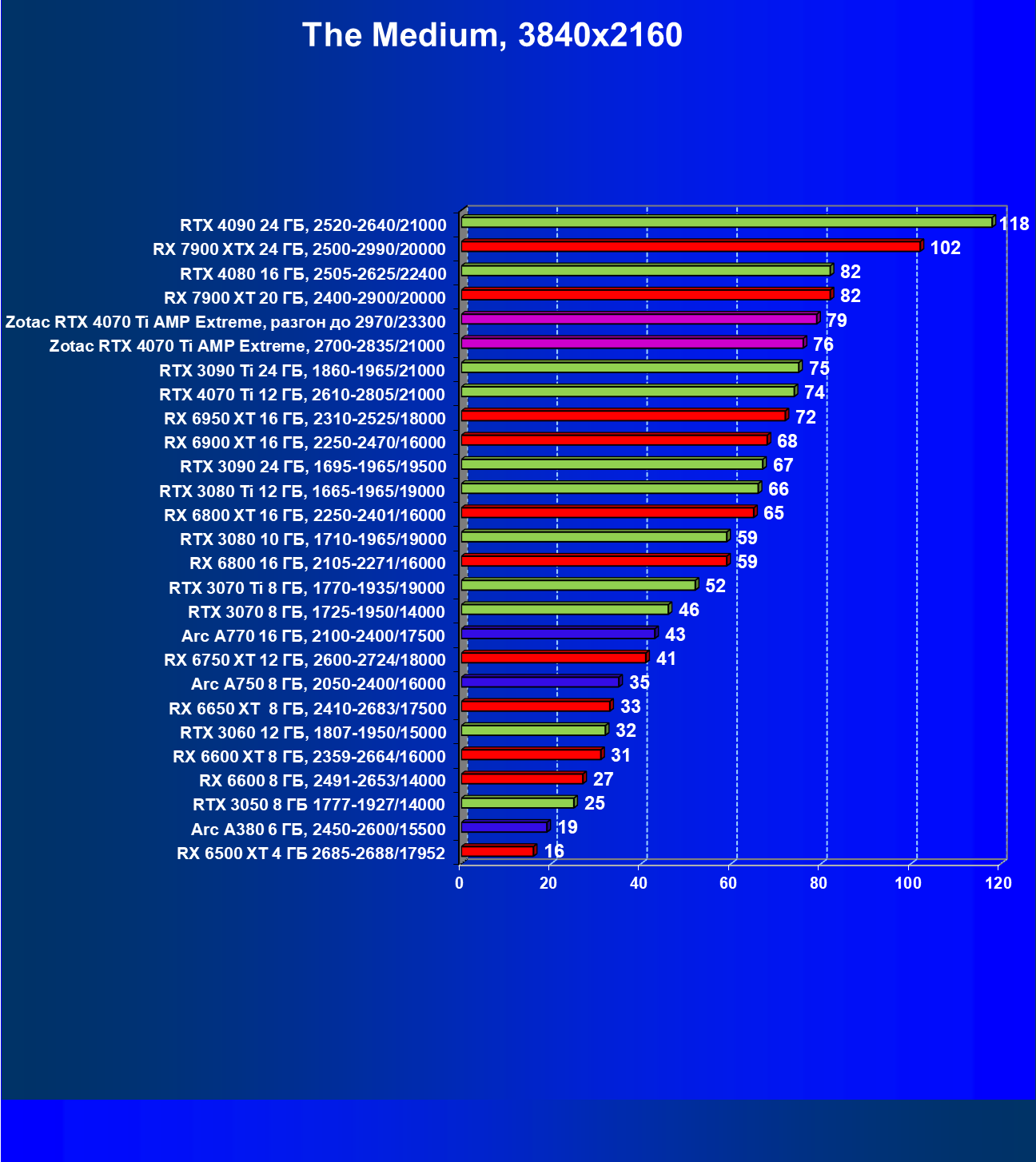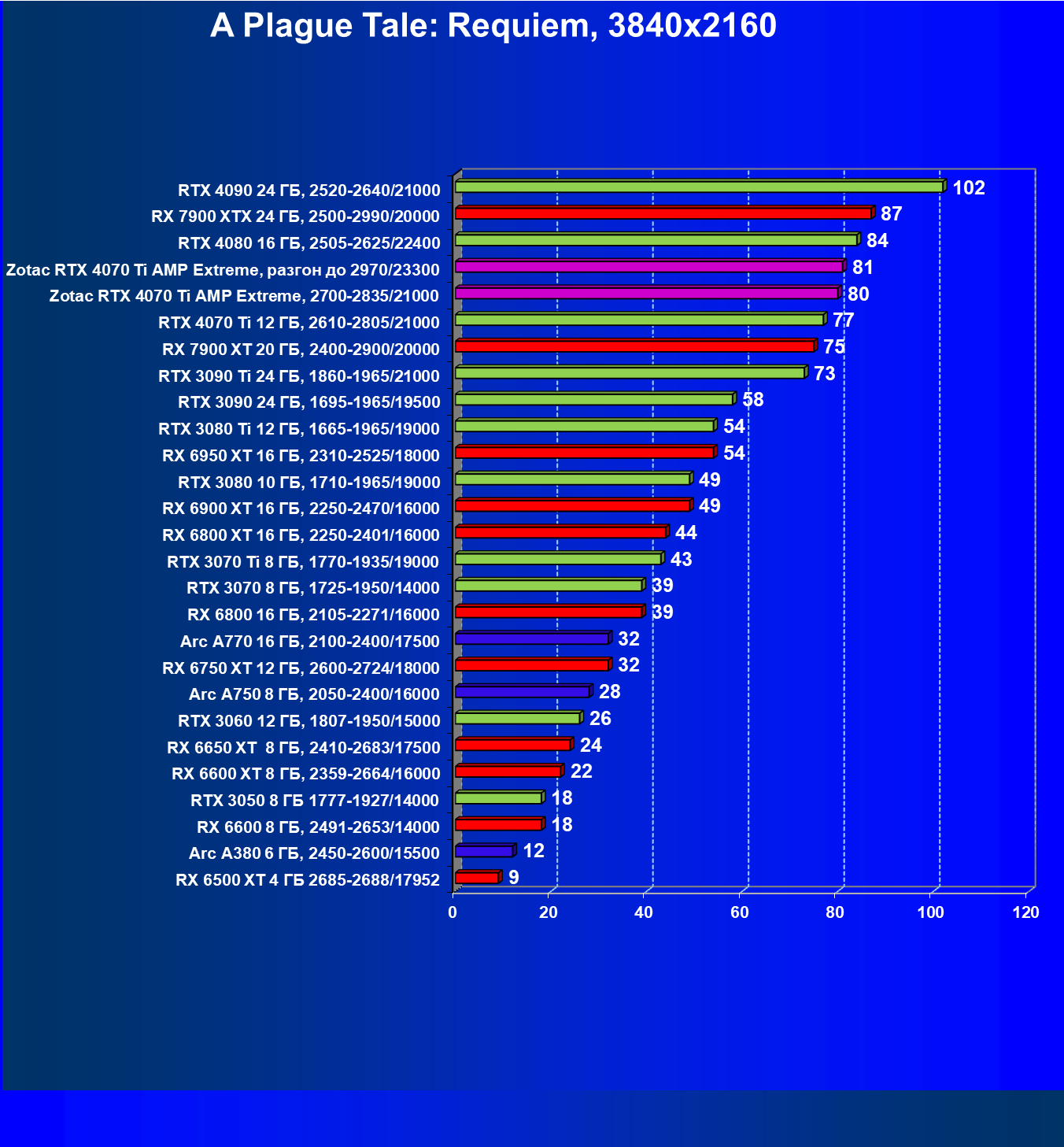 | 03 | Zotac RTX 4070 Ti Amp Extreme, разгон до 2970/23300 | 844 | 103 | 82 000 |