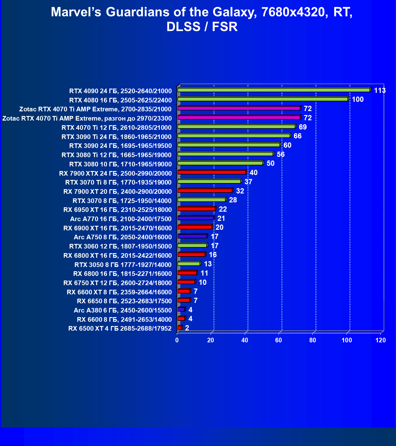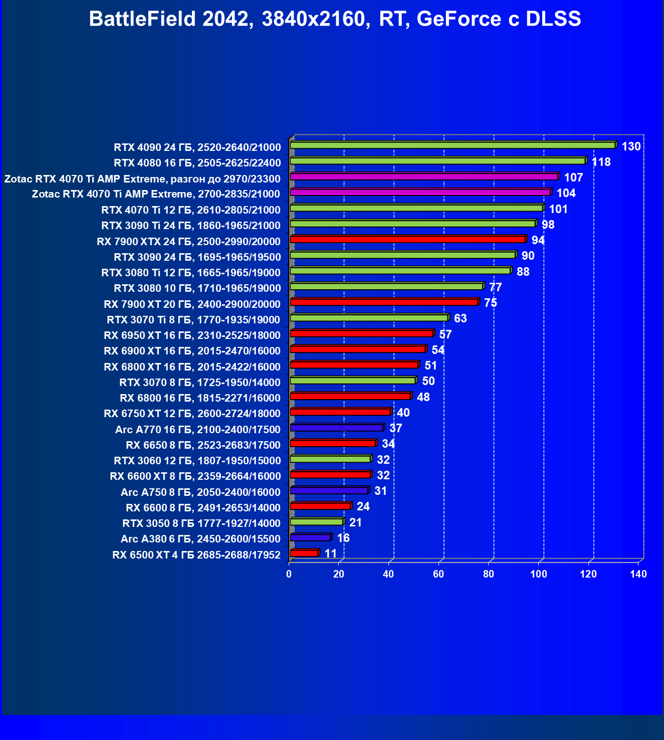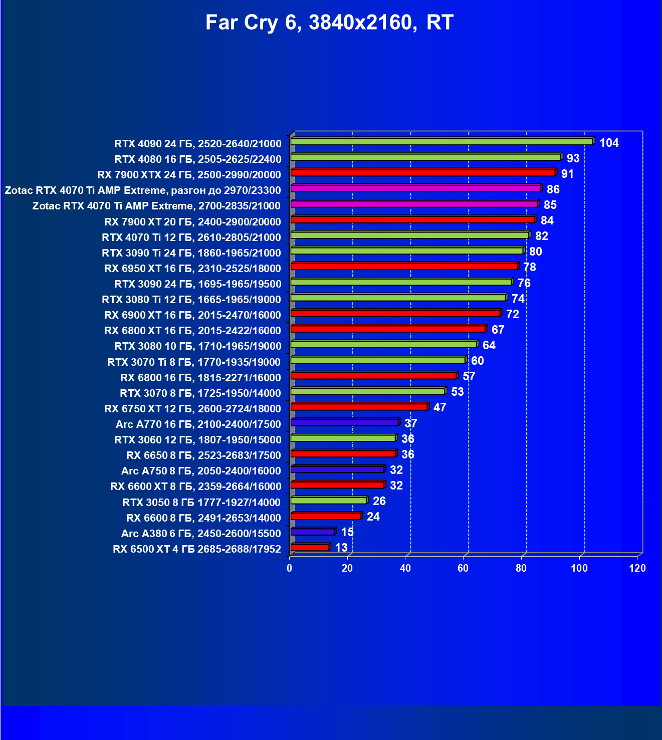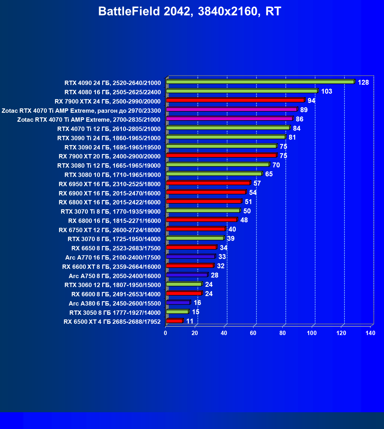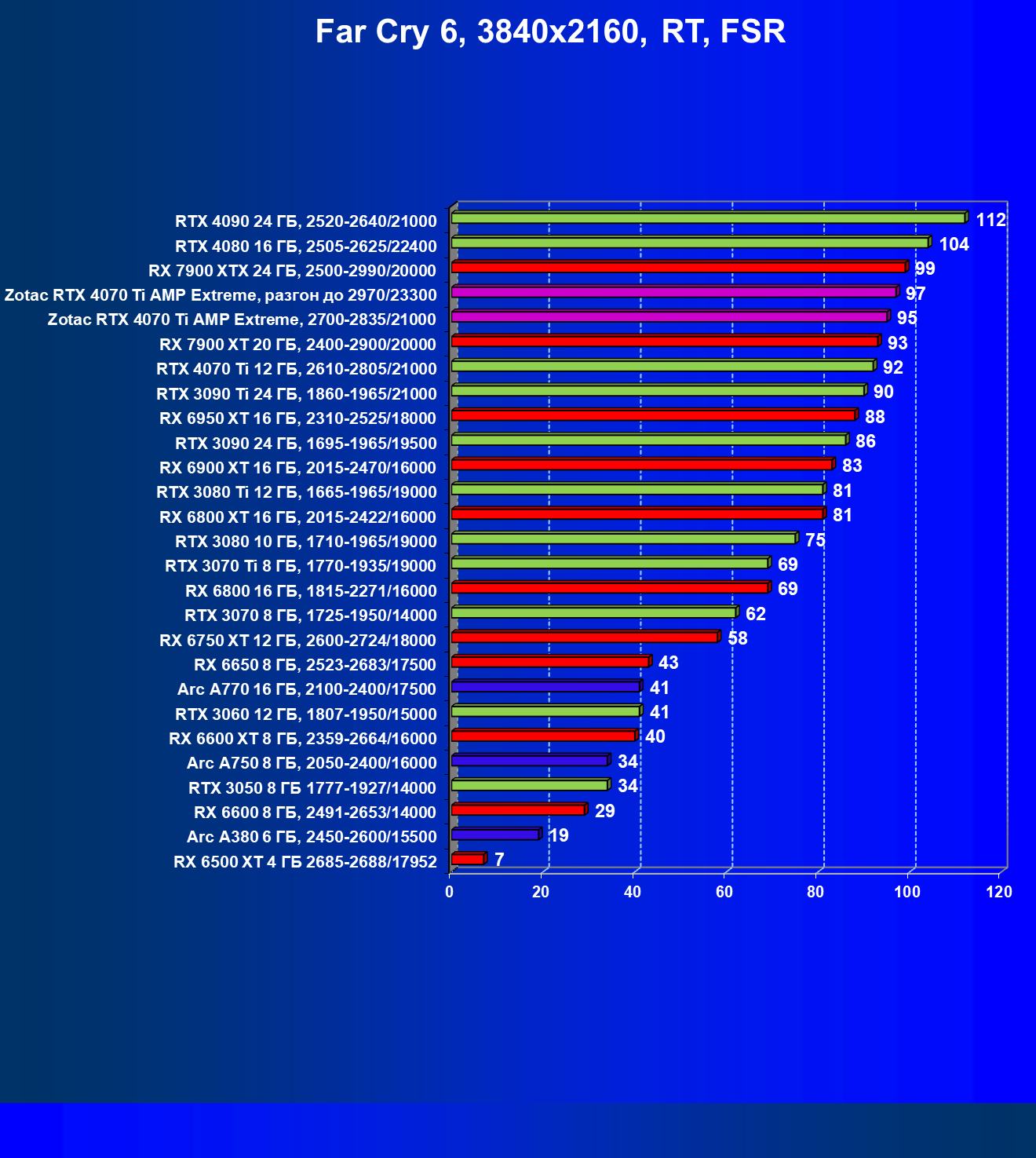 | 03 | Zotac RTX 4070 Ti Amp Extreme, разгон до 2970/23300 | 844 | 103 | 82 000 |