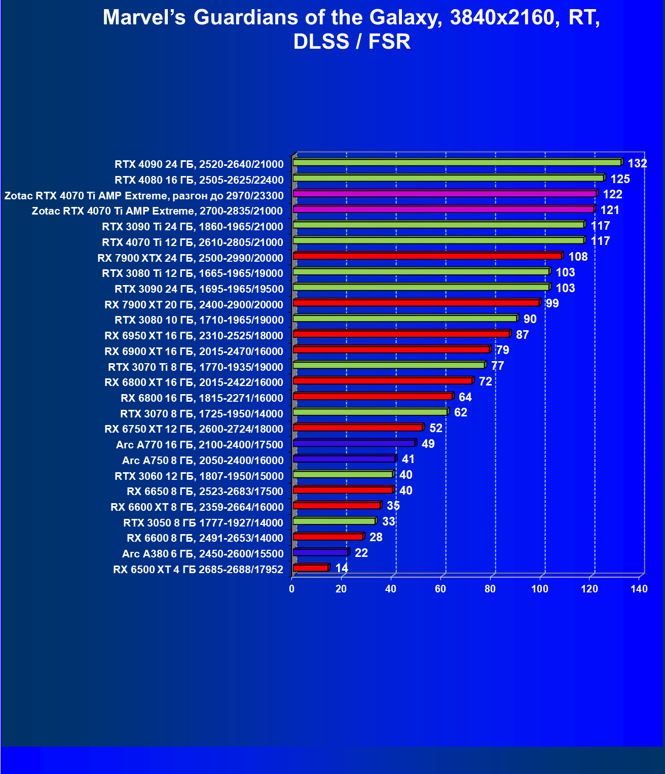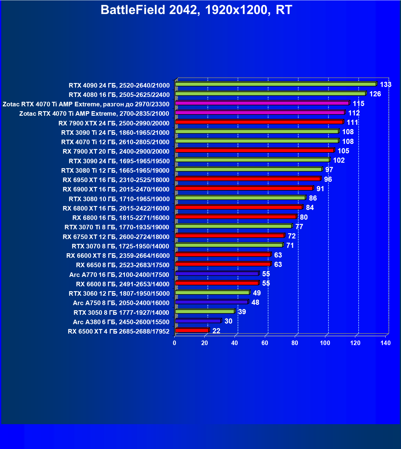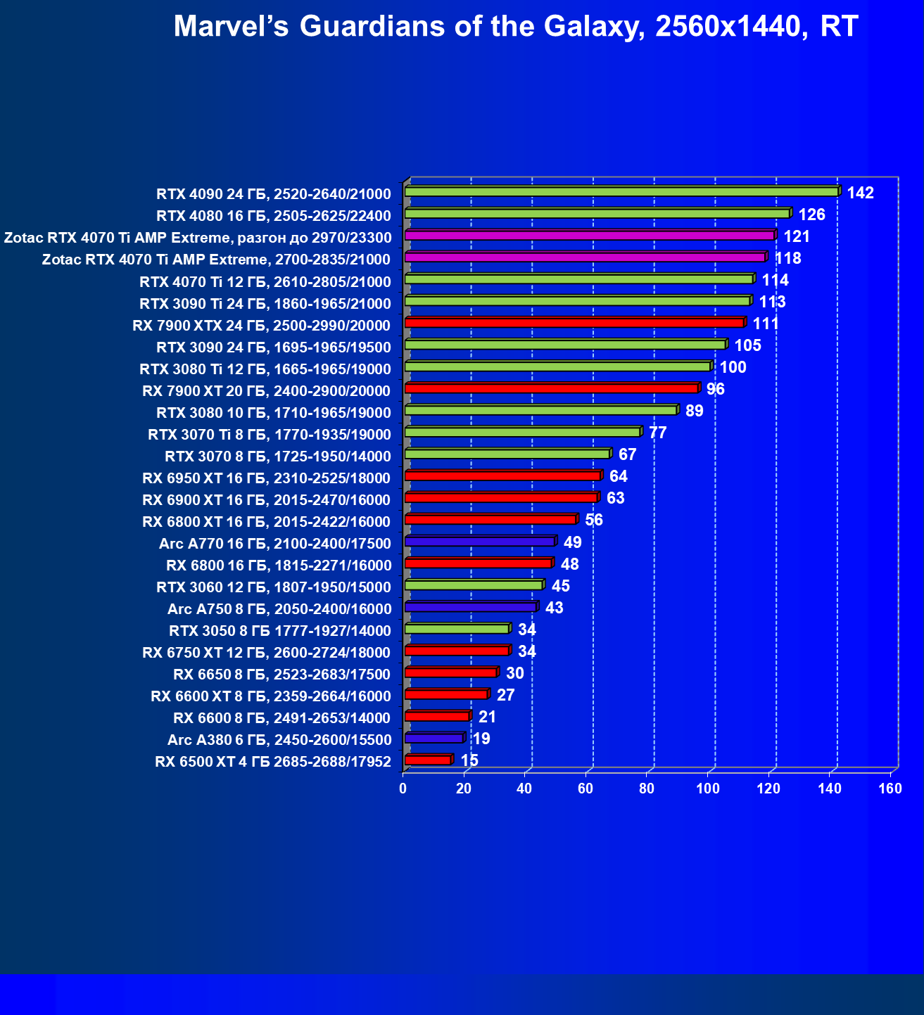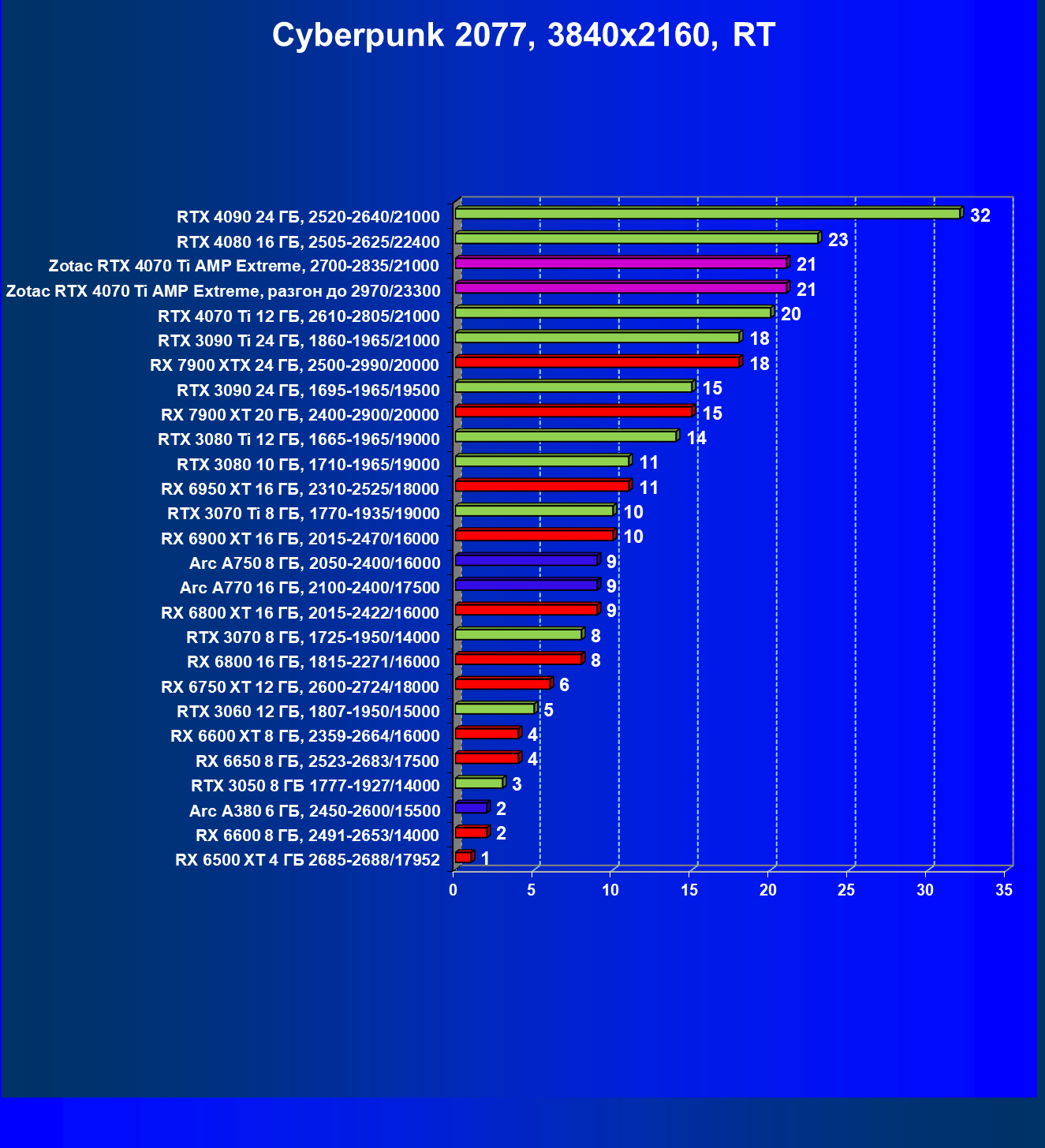 | 03 | Zotac RTX 4070 Ti Amp Extreme, разгон до 2970/23300 | 163 | 1340 | 82 000 |