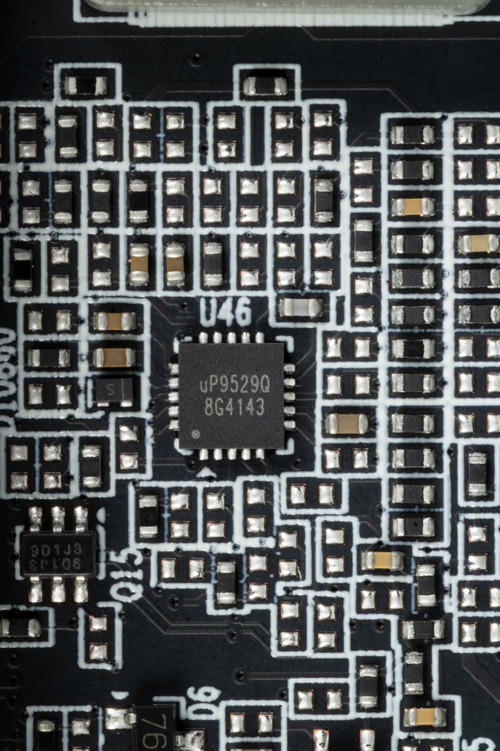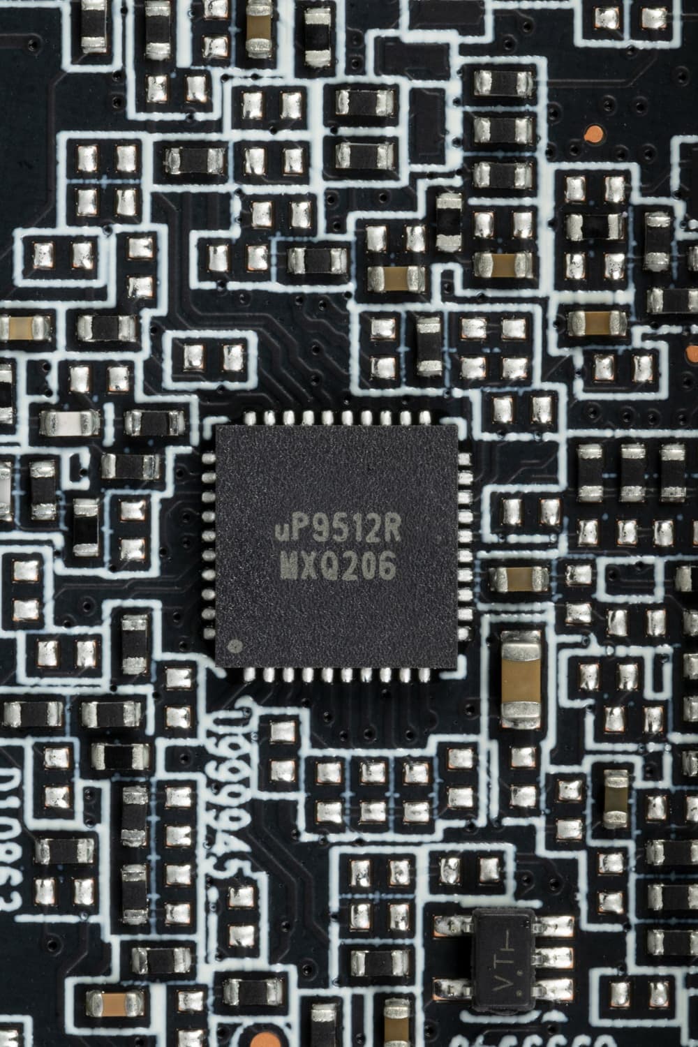 24 фазами питания ядра управляет ШИМ-контроллер uP9512R (uPI Semiconductor). Он рассчитан максимум на 12 фаз. Так что перед нами налицо параллельное управление фазами питания, то есть каждые 2 фазы контроллером управляются как одна.