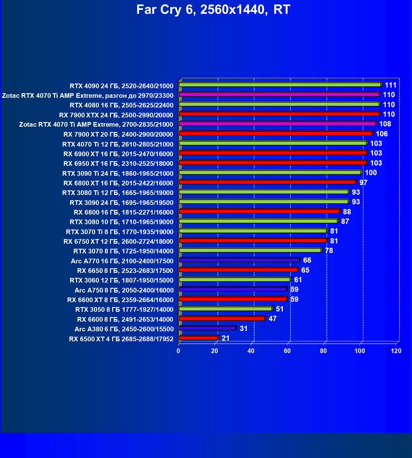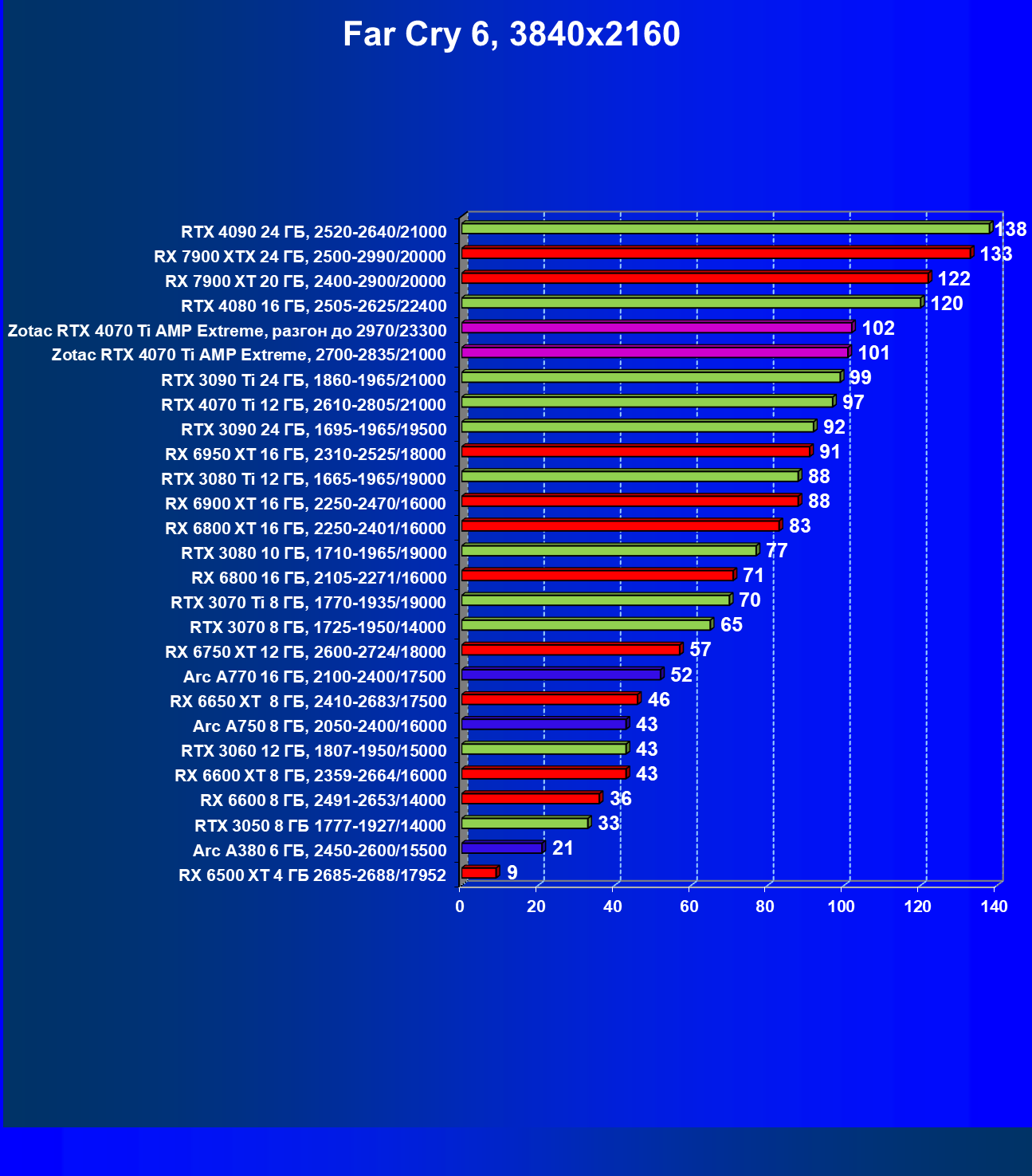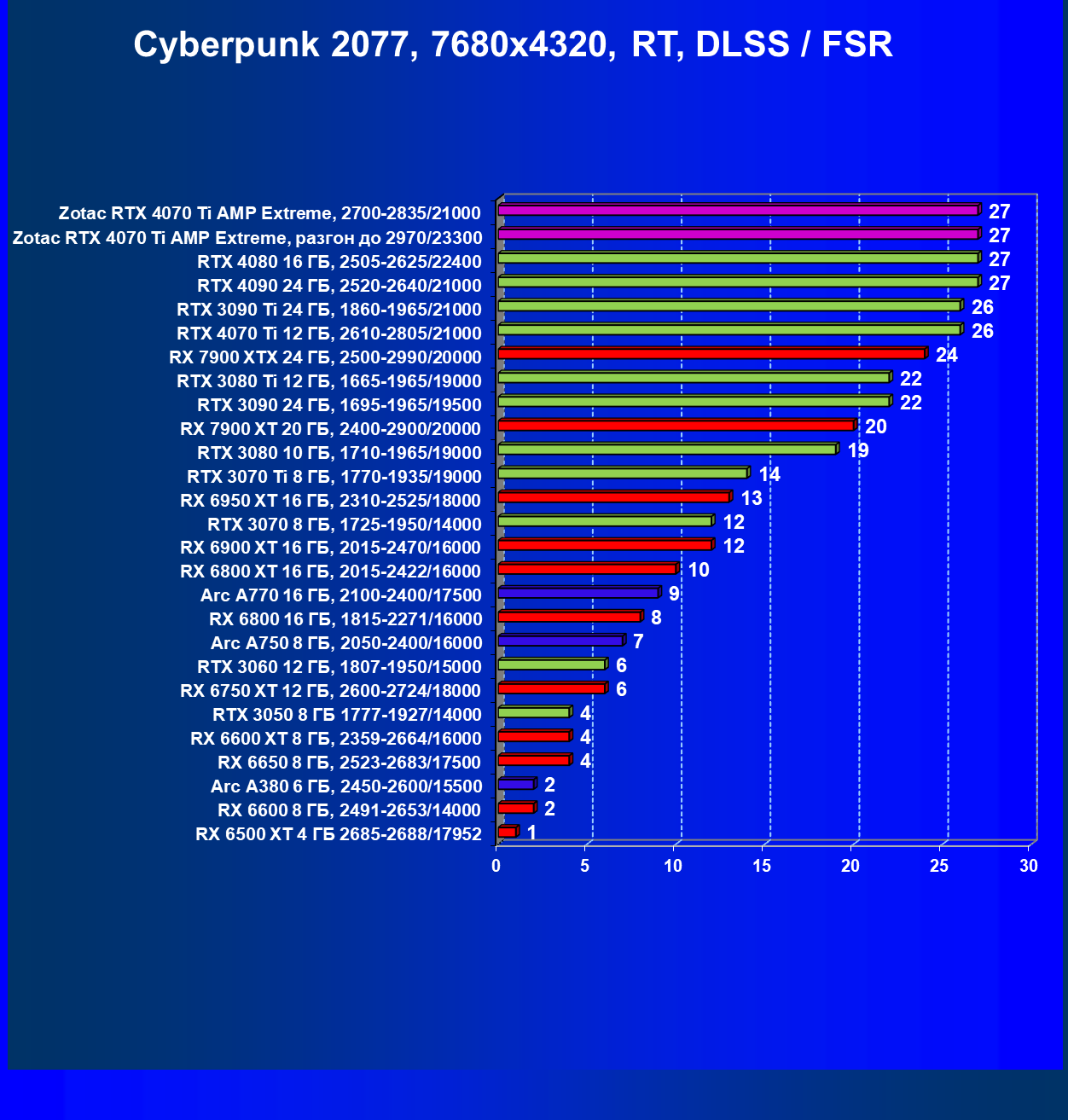 | 14 | Zotac RTX 4070 Ti Amp Extreme, 2700—2835/21000 | 91 | 743 | 82 000 |
