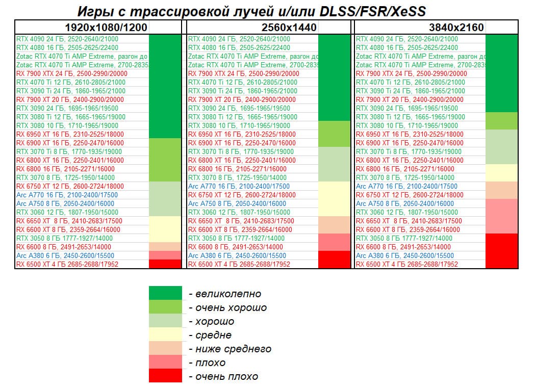В вышеуказанном разрешении смогут себе позволить поиграть владельцы RTX 4090/4080/4070 Ti/3090 Ti/3090/, а также RX 7900 XTX/7900 XT/6950/6900 XT, да и то для приемлемого комфорта в таких играх требуется обязательная поддержка DLSS (или FSR). Однако поиграть все же можно.