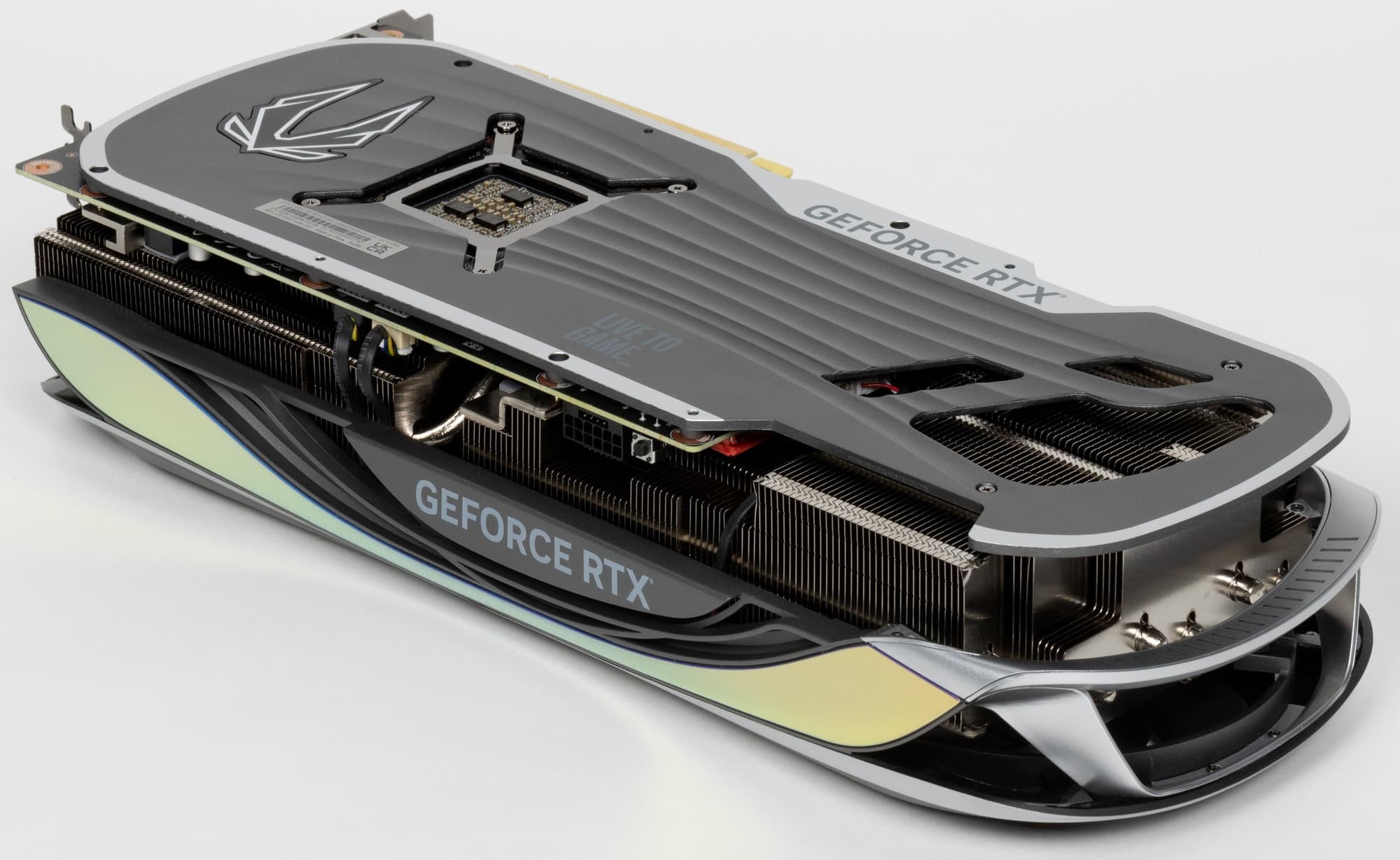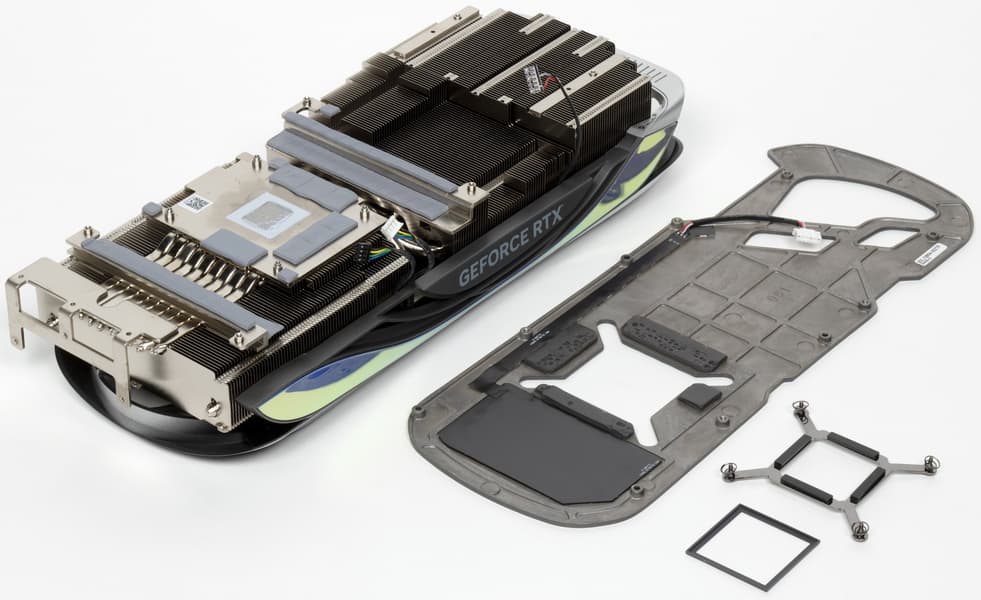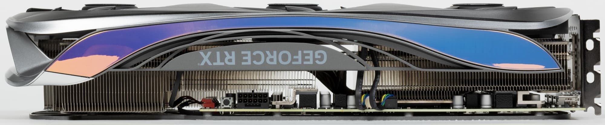 Еще в 2020 году возникла новая концепция охлаждения видеокарт, продвигаемая Nvidia: видеокарты имеют относительно компактную PCB, при этом радиатор системы охлаждения намного более длинный, так что правый вентилятор СО может продувать радиатор насквозь. Здесь мы видим кулер, выполненный именно по этой концепции: его основой является огромный многосекционный пластинчатый никелированный радиатор с тепловыми трубками, распределяющими тепло по ребрам радиатора.