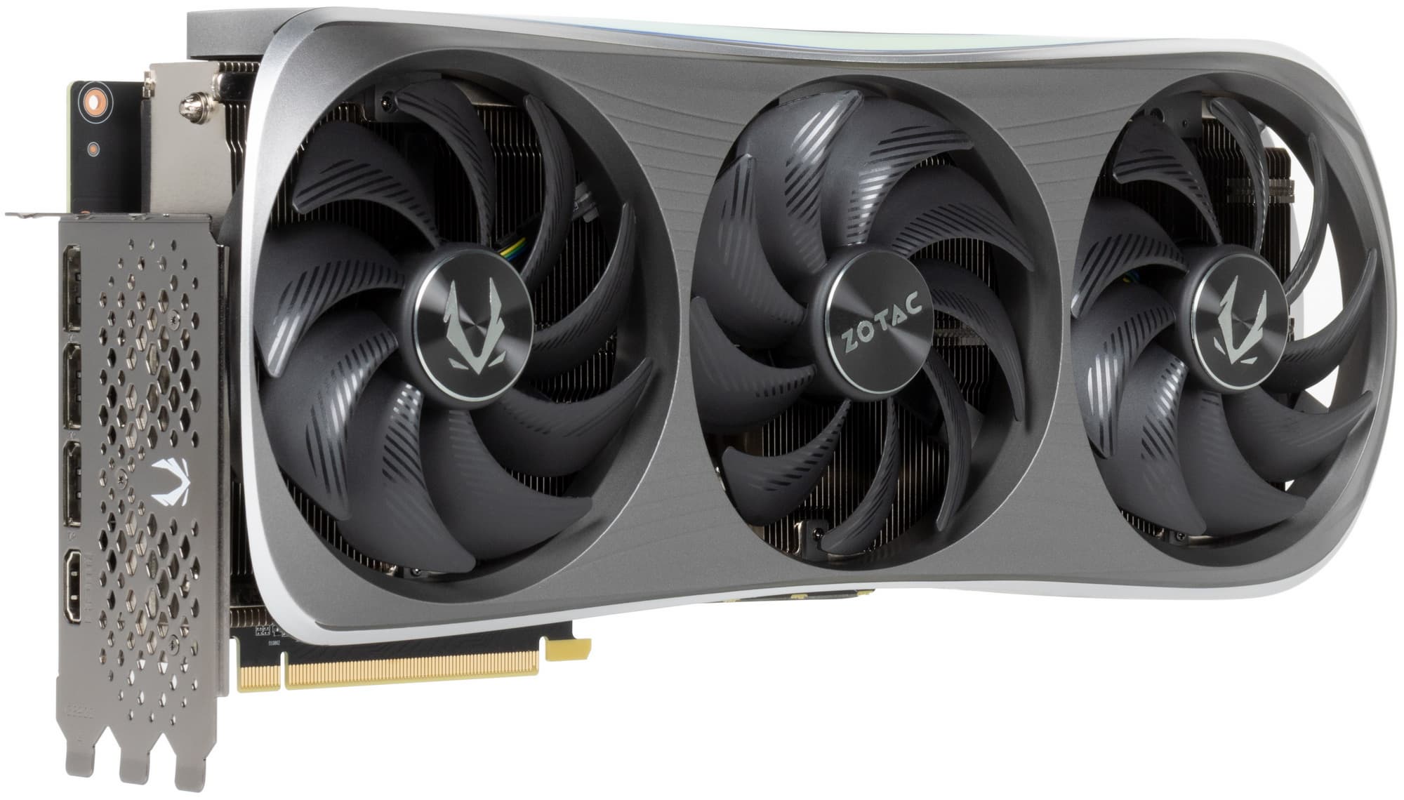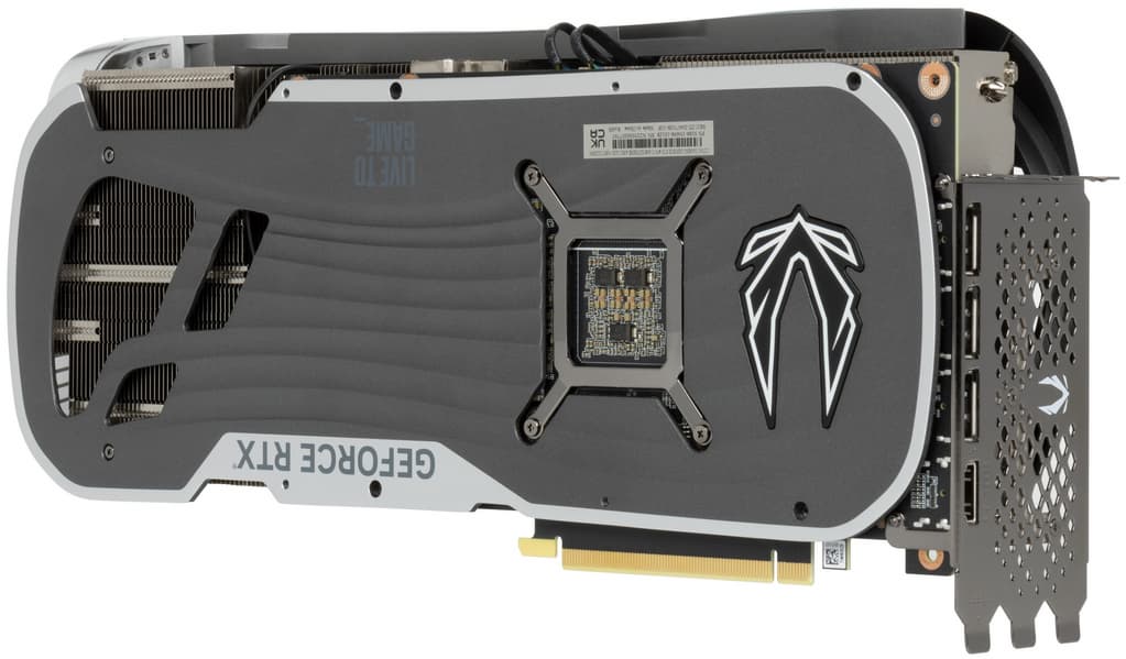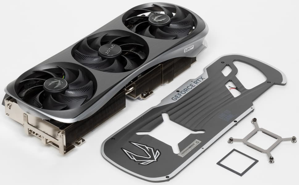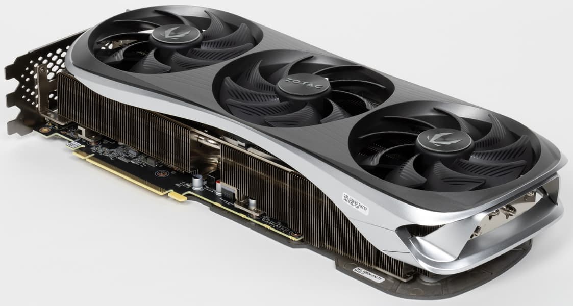 Карта Zotac имеет 16-контактный разъем питания версии PCIe 5.0. Хотя в комплекте поставки имеется адаптер-переходник для подключения разъемов питания типа PCIe 2.0 (с 3 таких разъемов), лучше все же использовать блоки питания стандарта ATX 3.0 с полноценной поддержкой питания PCIe 5.0 (с кабелем 12VHPWR). Имеющийся же переходник питания ни в коем случае нельзя изгибать непосредственно после 16-контактного разъема.