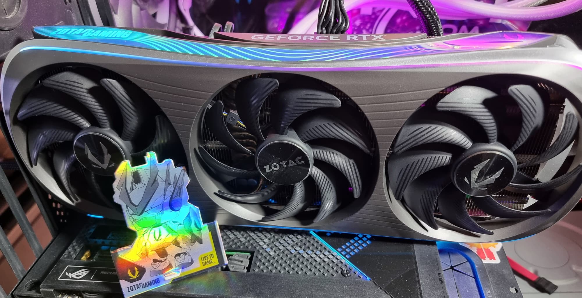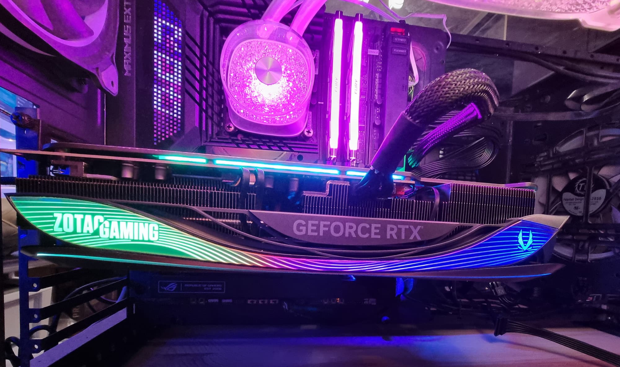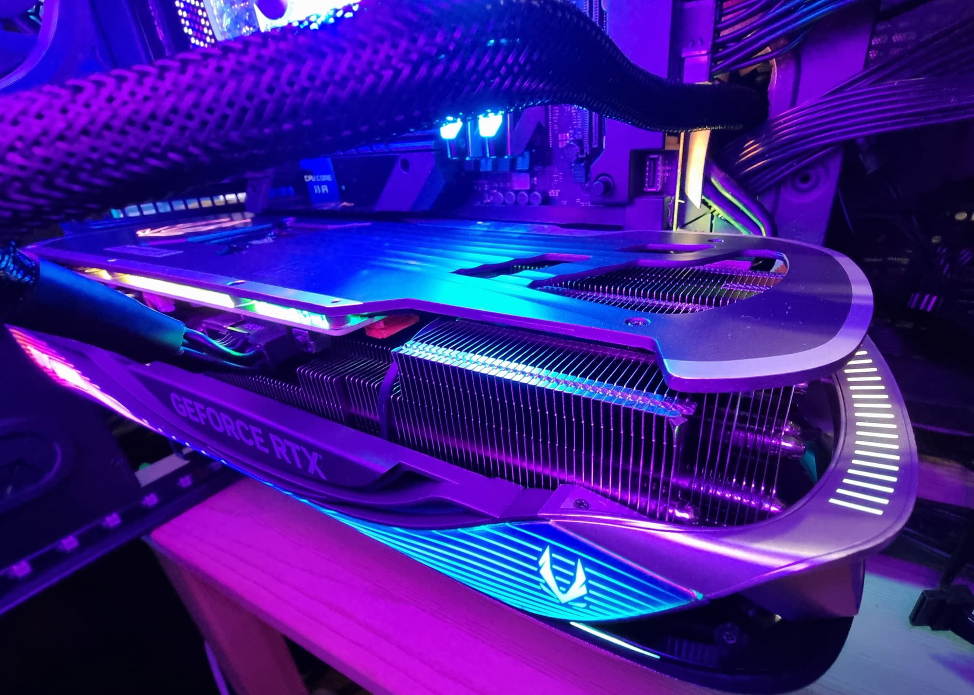 В общем, экспериментируя с освещением внутри ПК и подсветкой самой карты можно найти очень интересные сочетания, когда карта смотрится очень экзотично и перестает быть похожей на видеокарту.