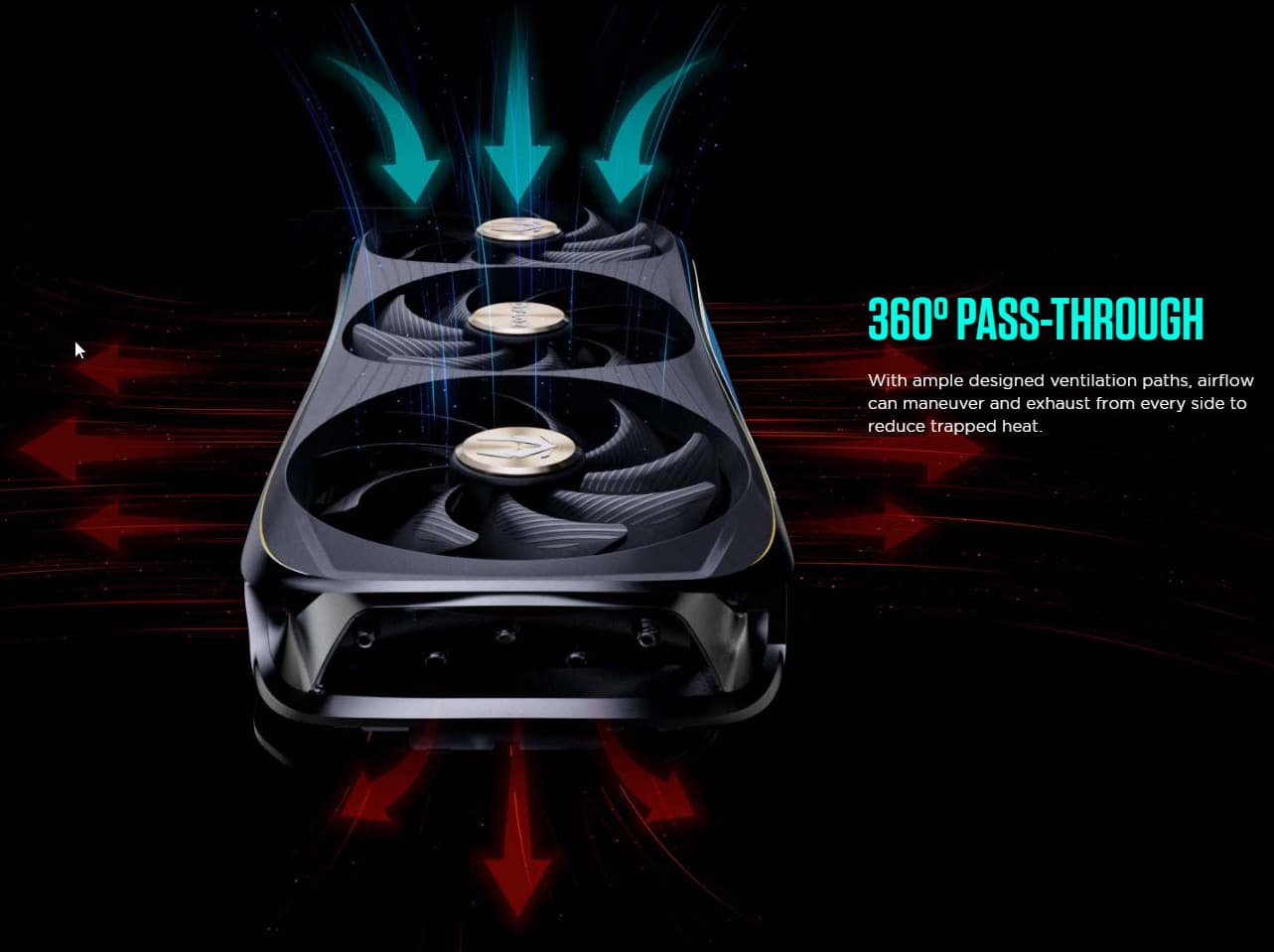 Поверх радиатора установлен кожух с тремя вентиляторами ∅110 мм, у которых имеются рифленые лопасти. Центральный вентилятор вращается в противоположную сторону относительно крайних, что обеспечивает эдакий «эффект шестеренок», помогая бороться с турбулентностью потока воздуха.