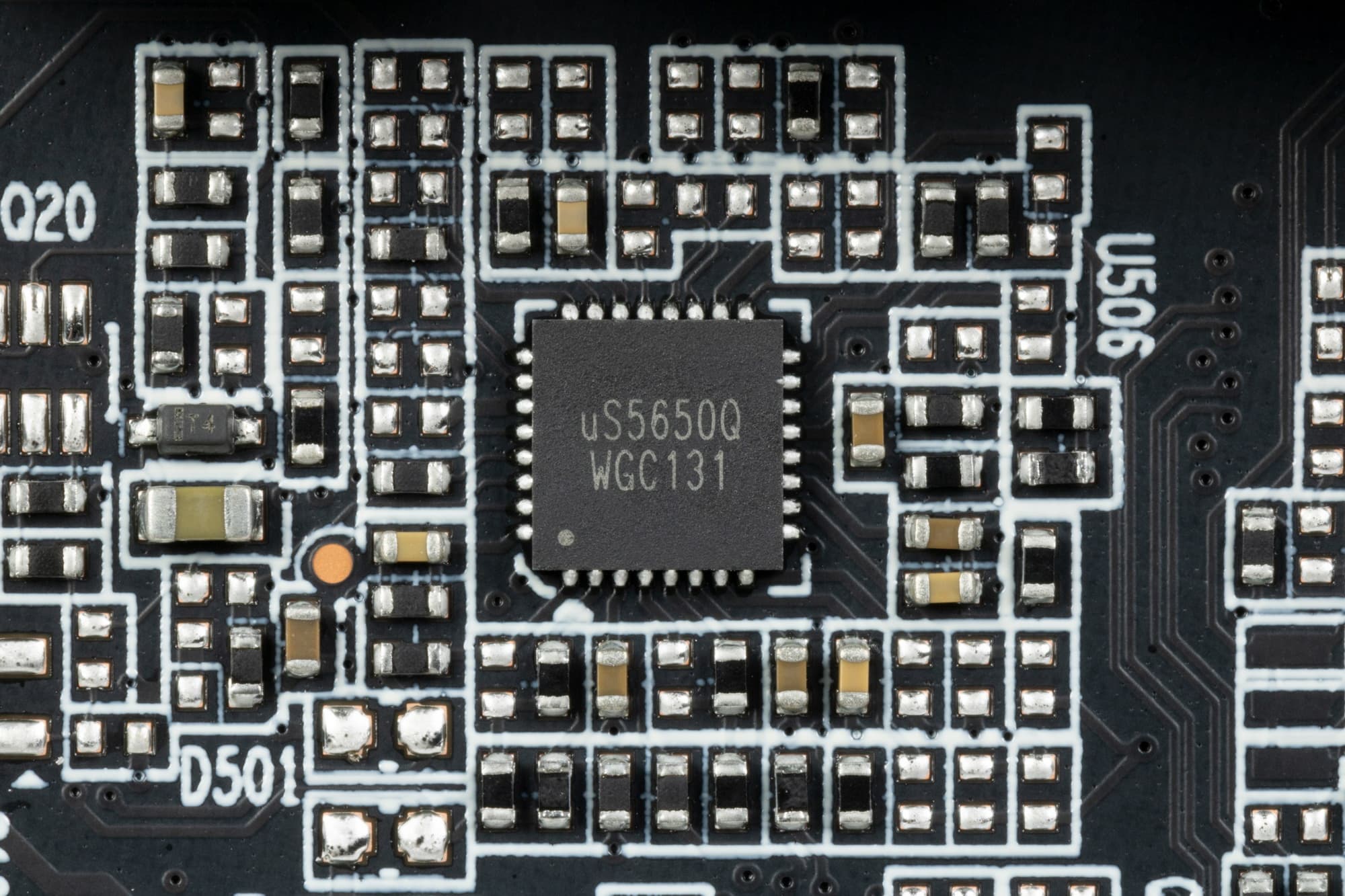 Также на лицевой стороне платы имеется контроллер uS5650Q (uSI Semiconductor), который отвечает за мониторинг карты (отслеживание напряжений и температуры).