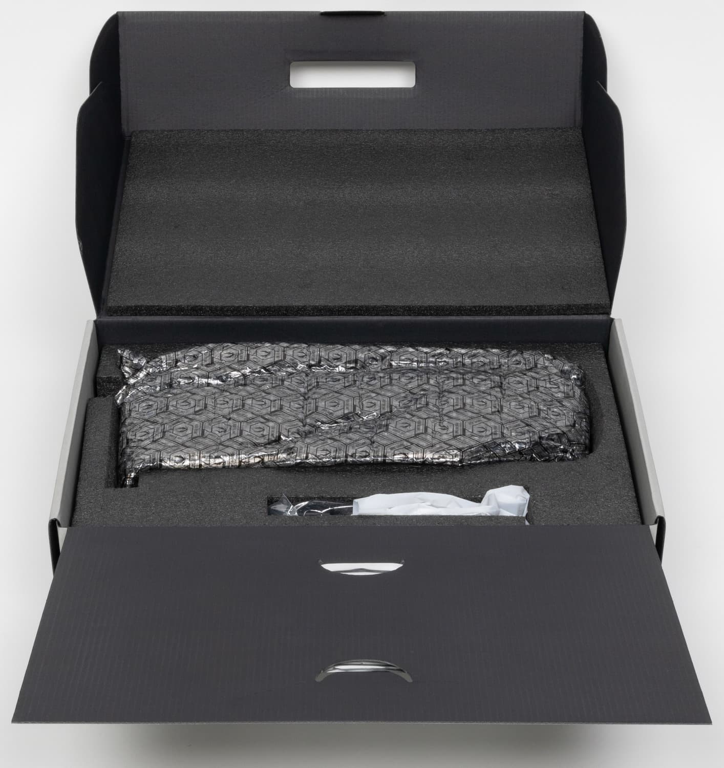 Карта имеет пять зон подсветки: изогнутая полоса с голографическим эффектом на верхнем торце, тонкий обод по периметру кожуха, логотип на оборотной стороне, полоса вдоль верхнего торца и вырезы в хвостовой части карты.
