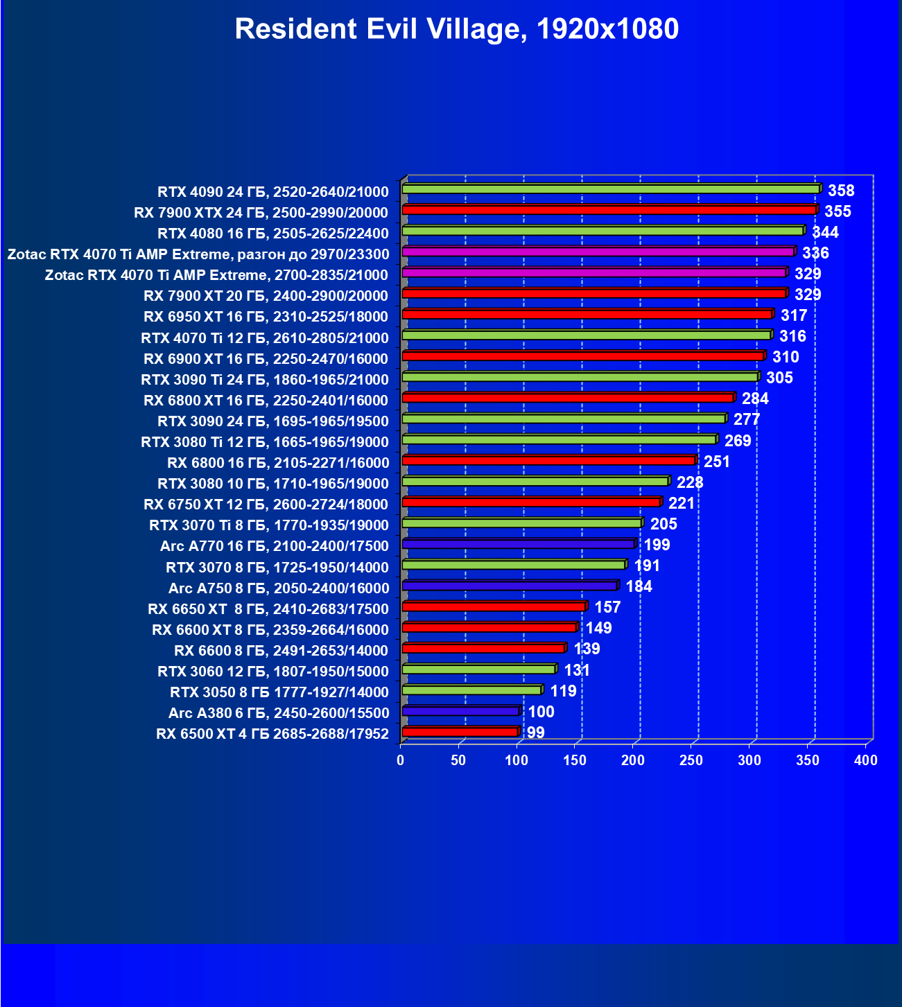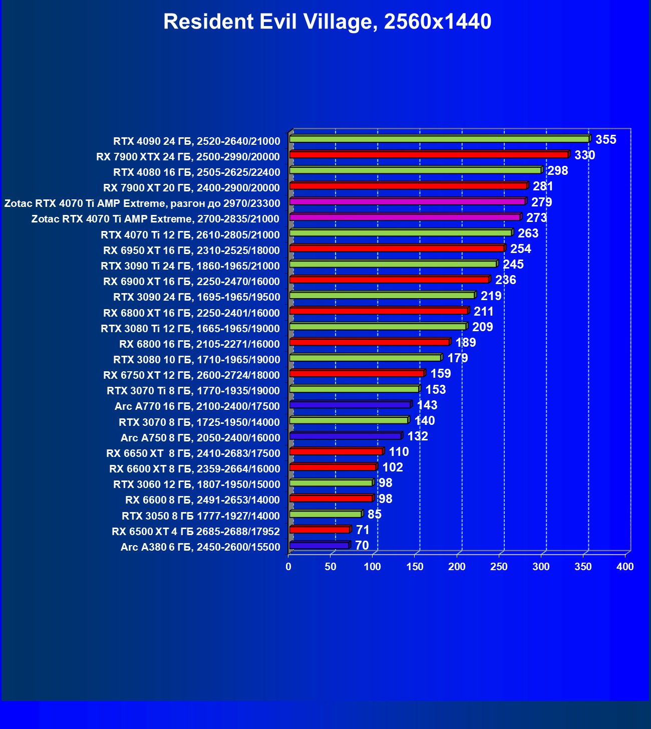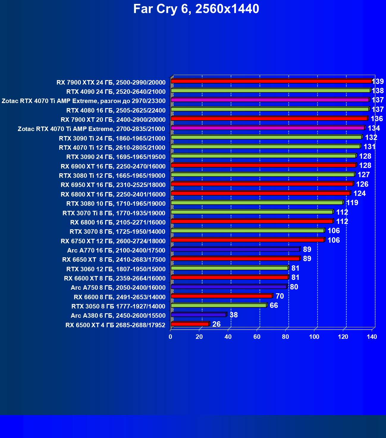 Хорошо видно, что RTX 4070 Ti в целом идет практически на равных с флагманом прежнего поколения RTX 3090 Ti, опережая Radeon RX 6950 XT на 6%. При этом карта Zotac засчет фабричного разгона уже обходит в среднем референс-аналог RTX 4070 Ti на 3%, а RX 6950 XT — на 9%. Более дорогой Radeon RX 7900 XT выдает чуть большую производительность, однако ручной разгон карты Zotac позволил догнать RX 7900 XT и даже чуть обойти.