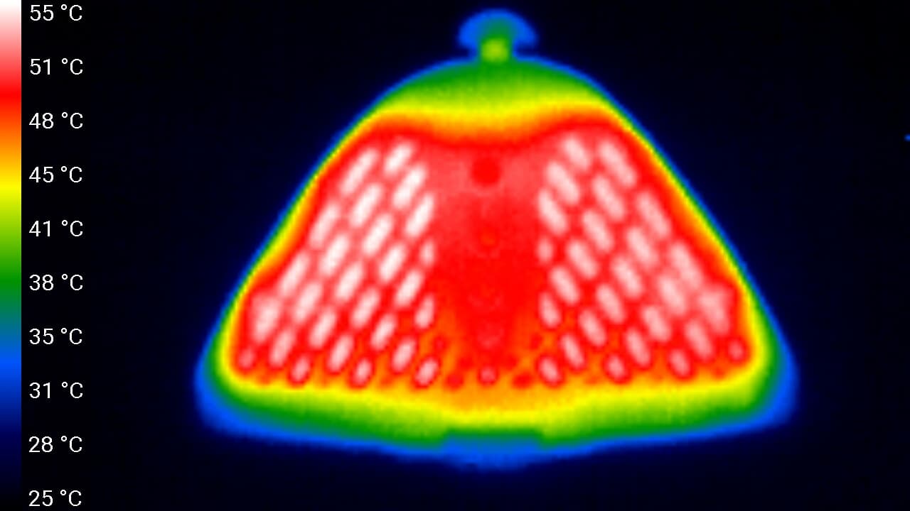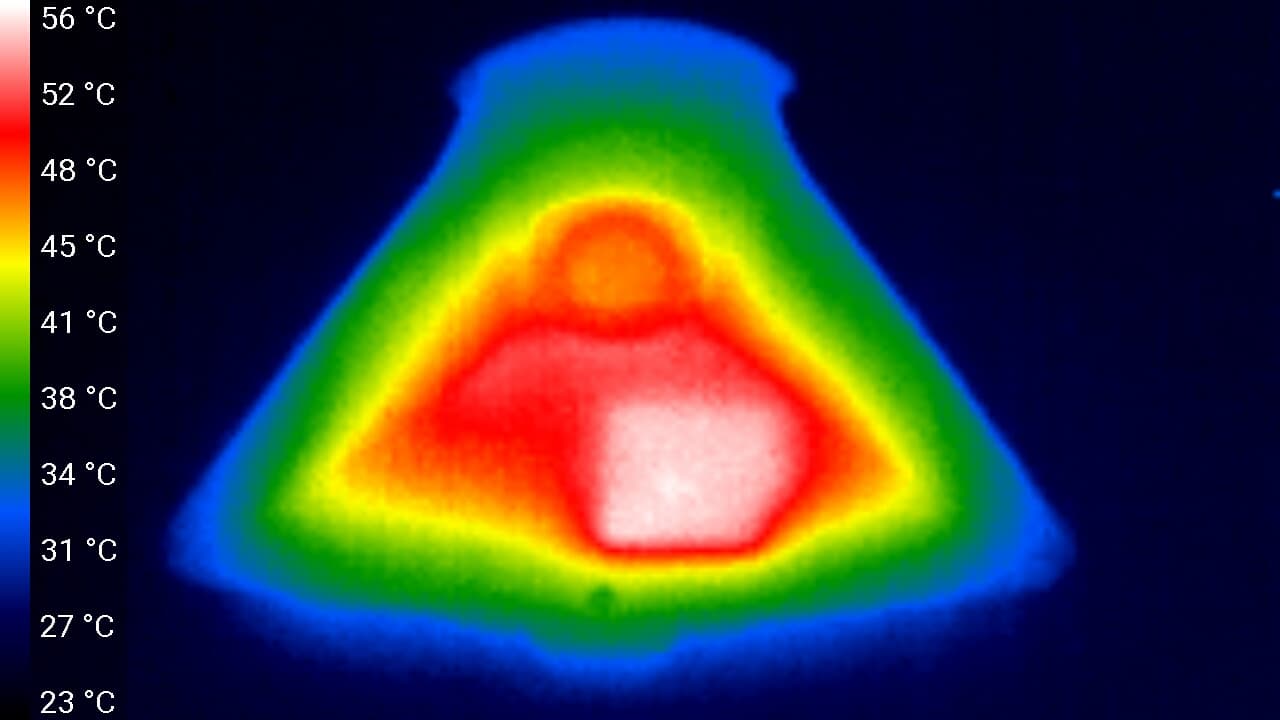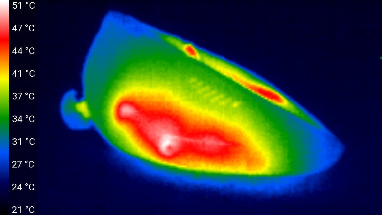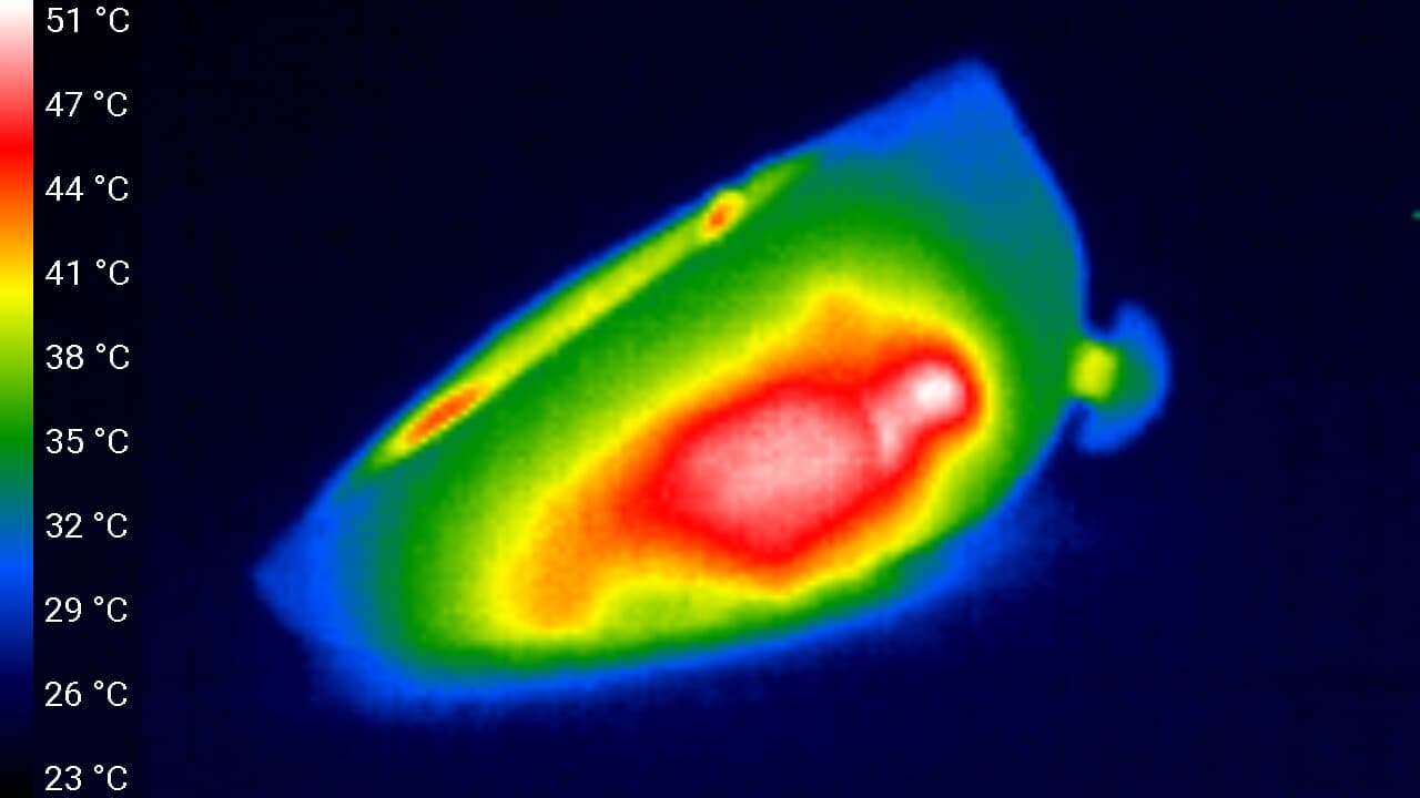 Во время длительной работы корпус регистратора ощутимо нагревается. Ниже приведены тепловизионные снимки прибора, сделанные после одного часа работы регистратора с включенным Wi-Fi-адаптером в комнатных условиях при температуре 25 °C.