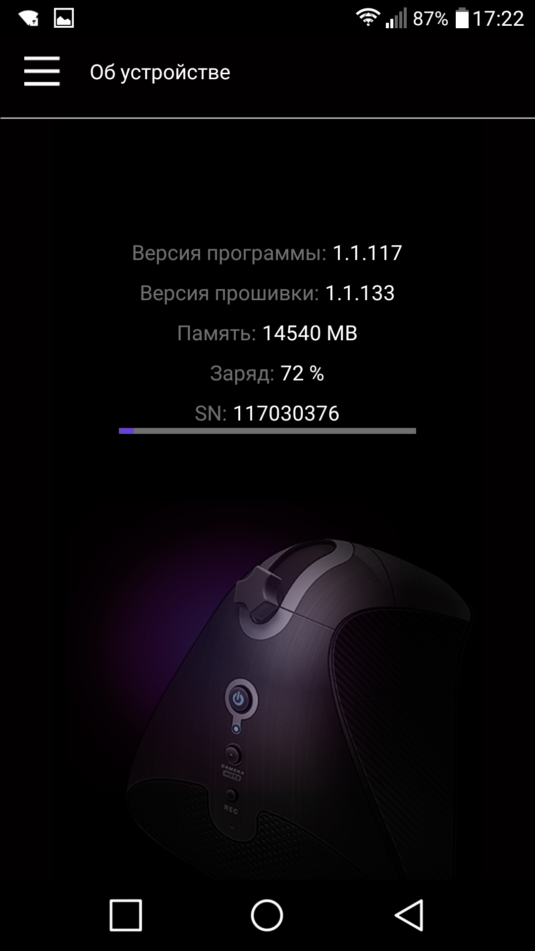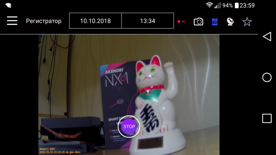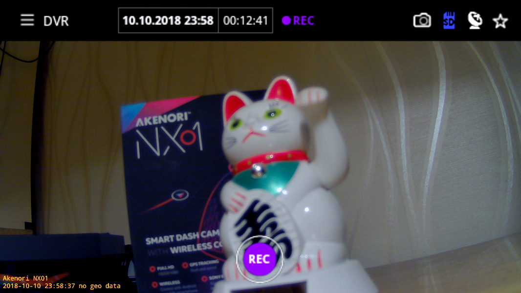 Нажатие на корпусе регистратора средней кнопки включает встроенный адаптер Wi-Fi, после чего в смартфоне следует отыскать беспроводную точку с именем AkinoriNX01, подключиться к ней через «общепринятый» пароль 12345678 и, наконец, запустить приложение. Теперь можно не только видеть живую трансляцию с регистратора, но и управлять его настройками.