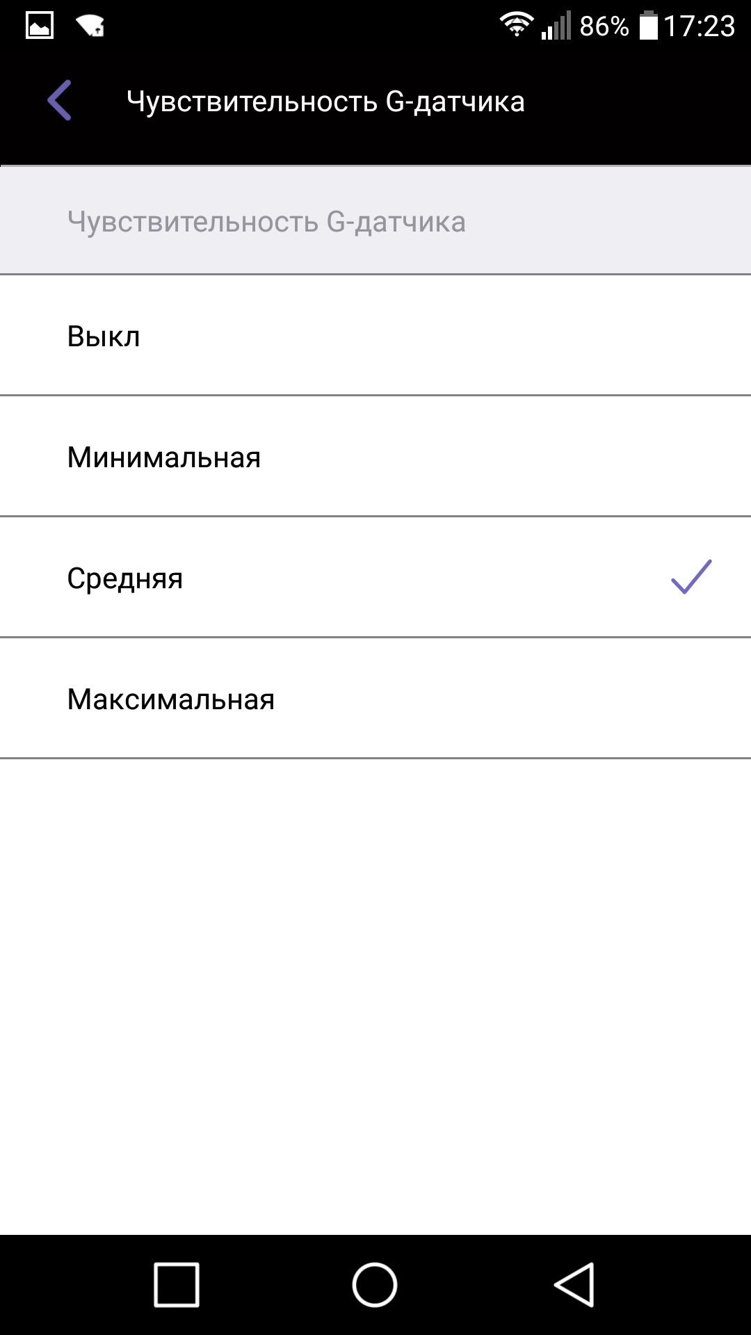 | G-датчик | выкл., минимальная, средняя, максимальная |